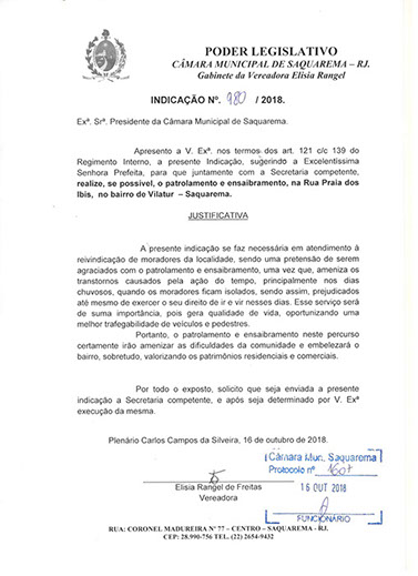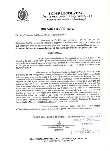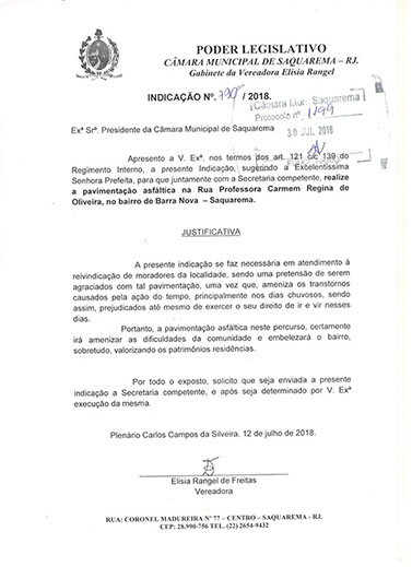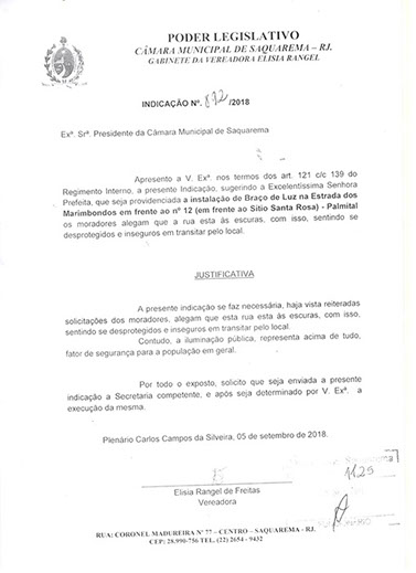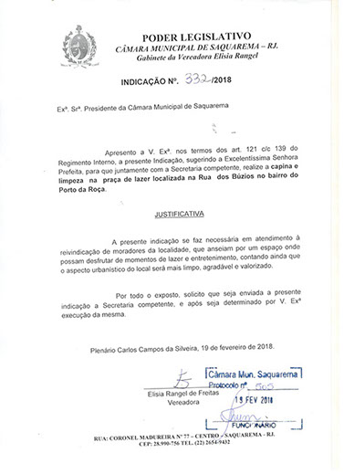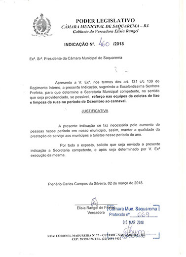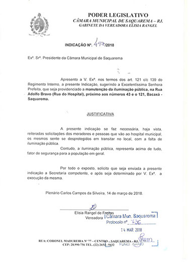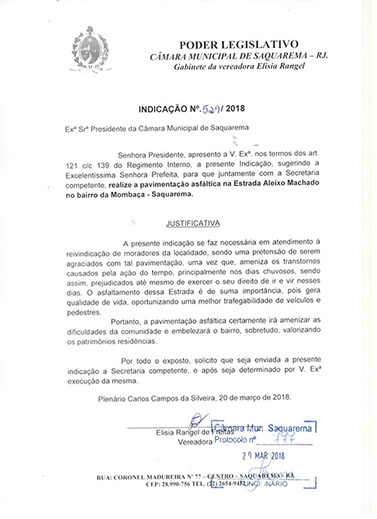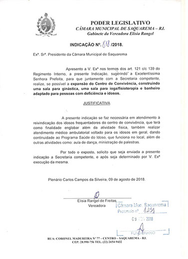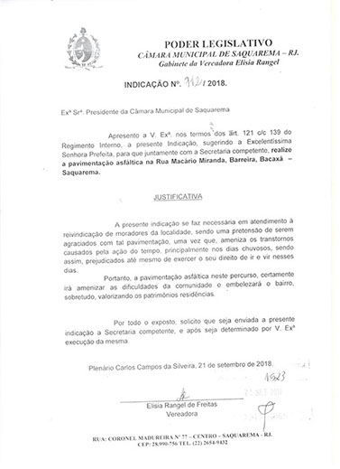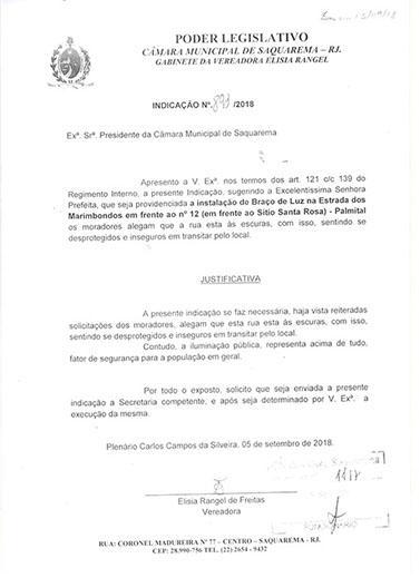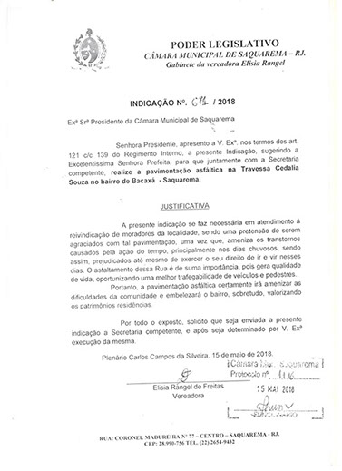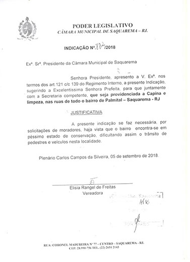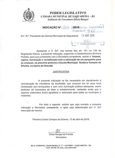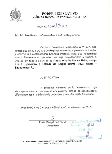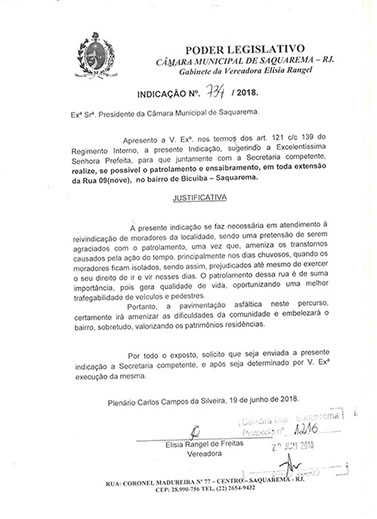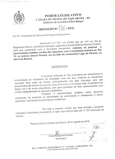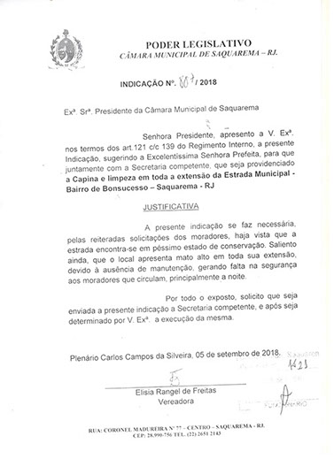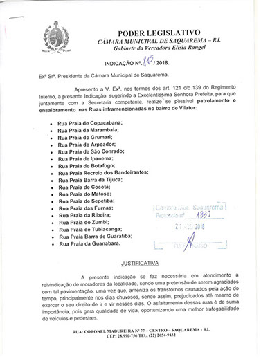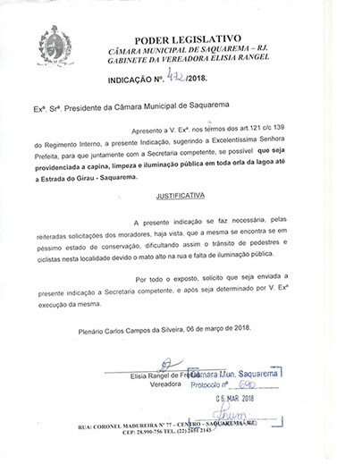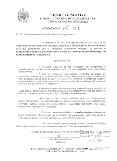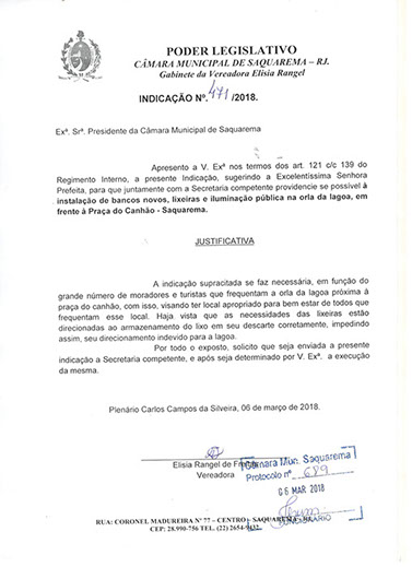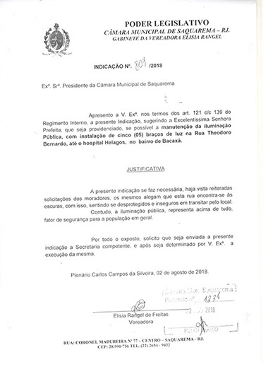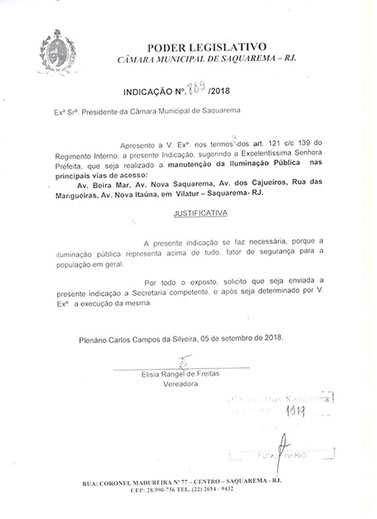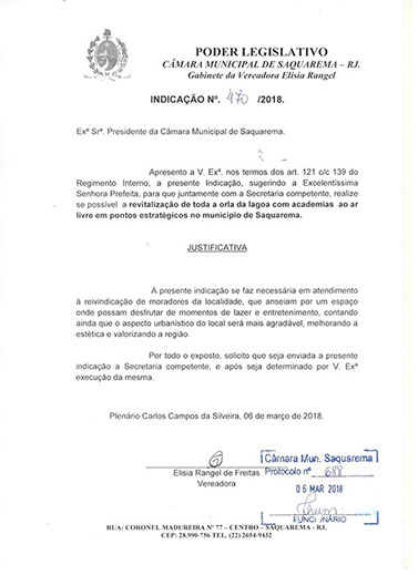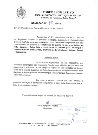 Estão presentes aqui indicações apresentadas por iniciativa de Elisia Rangel durante o seu mandato vigente como Vereadora do Município de Saquarema, na Região dos Lagos do estado do Rio de Janeiro.