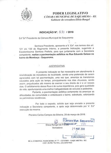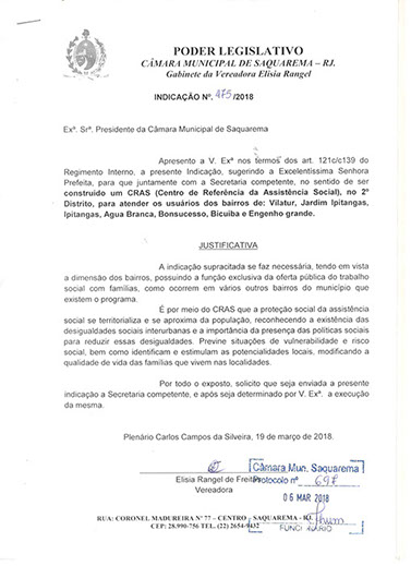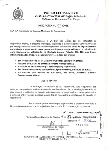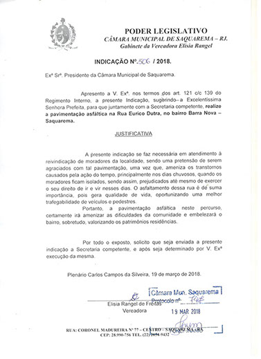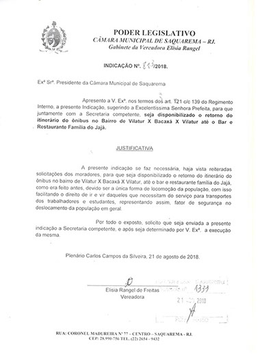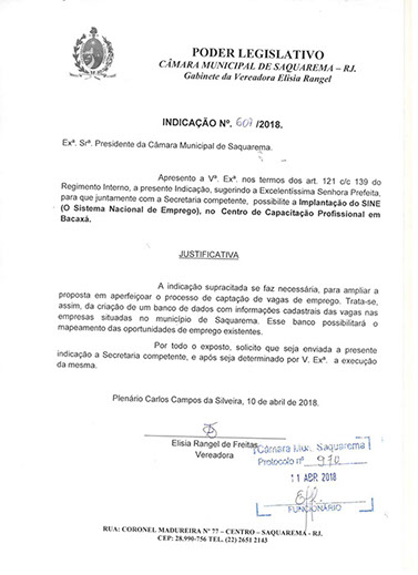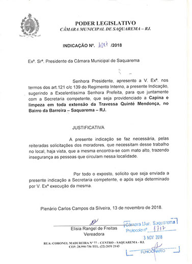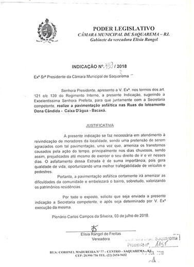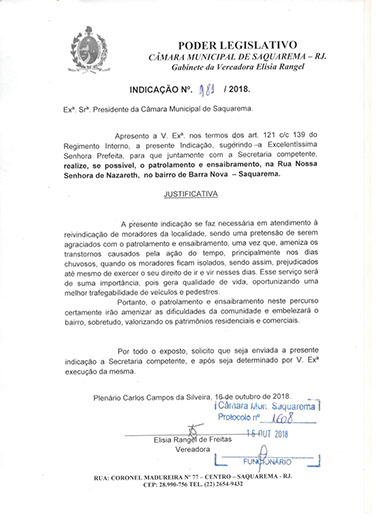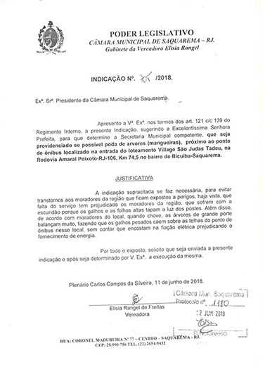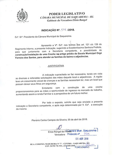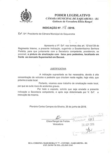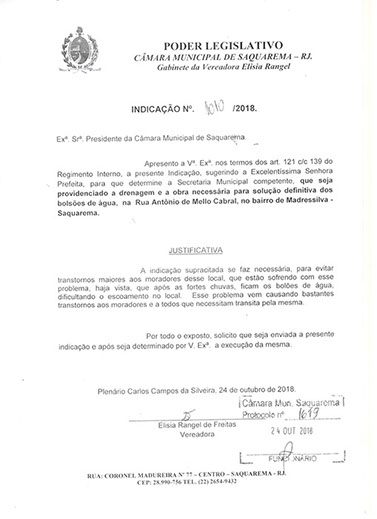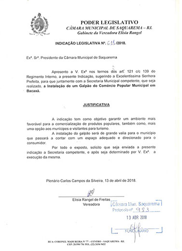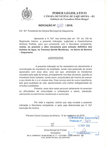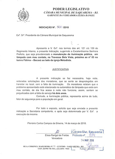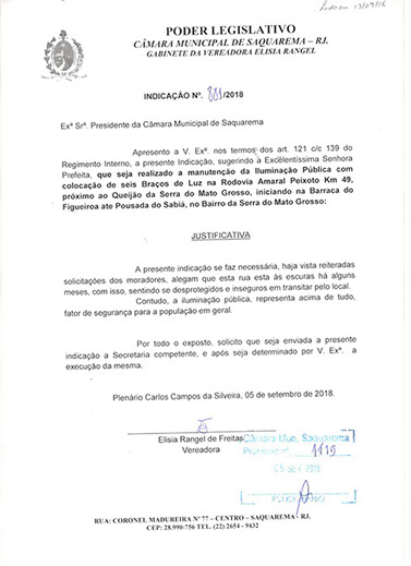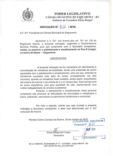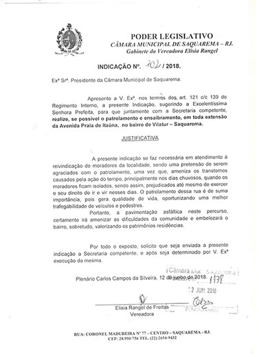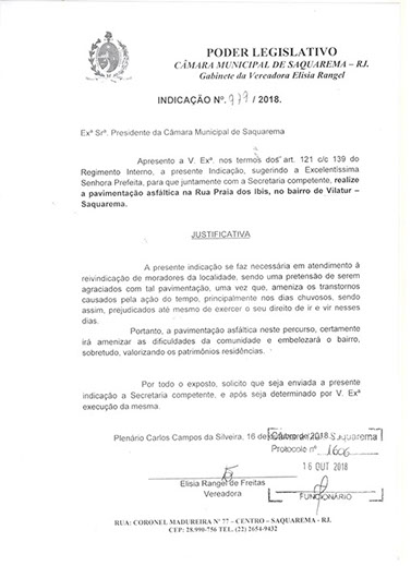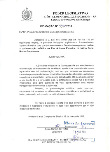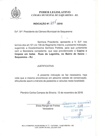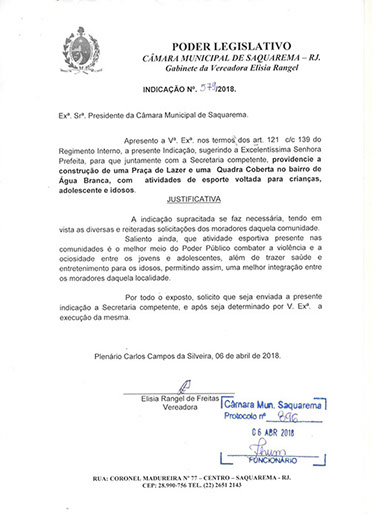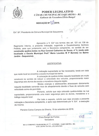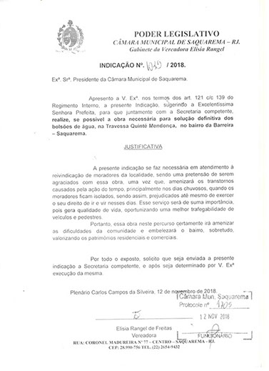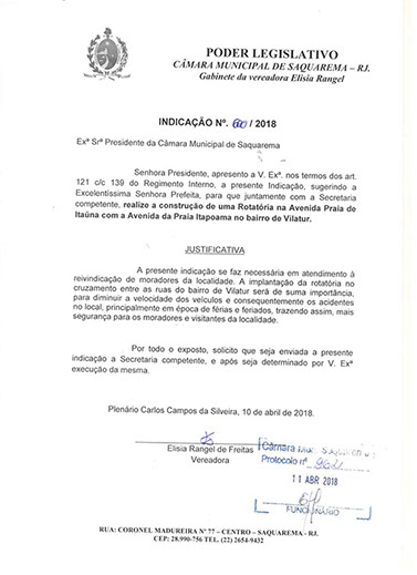 Estão presentes aqui indicações apresentadas por iniciativa de Elisia Rangel durante o seu mandato vigente como Vereadora do Município de Saquarema, na Região dos Lagos do estado do Rio de Janeiro.