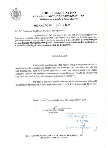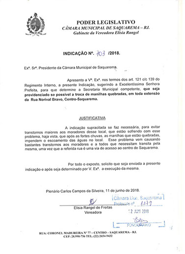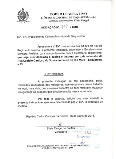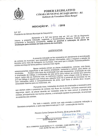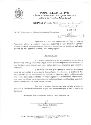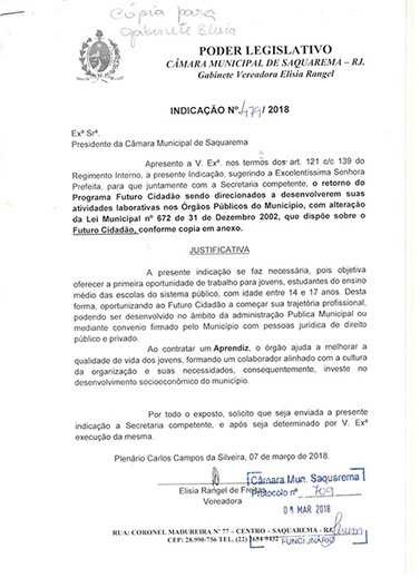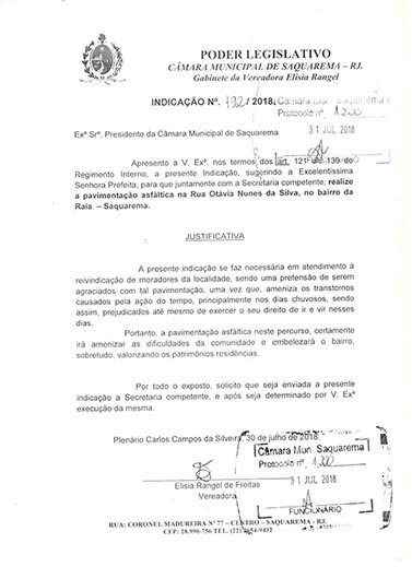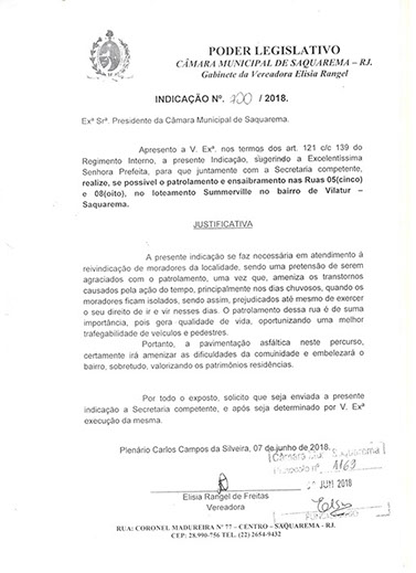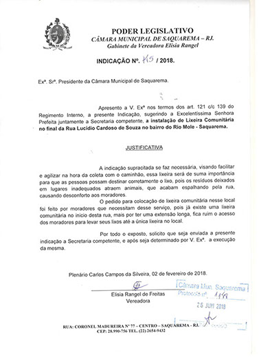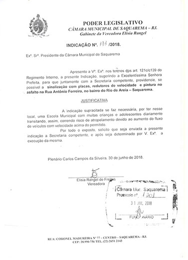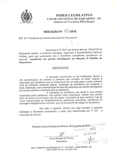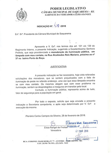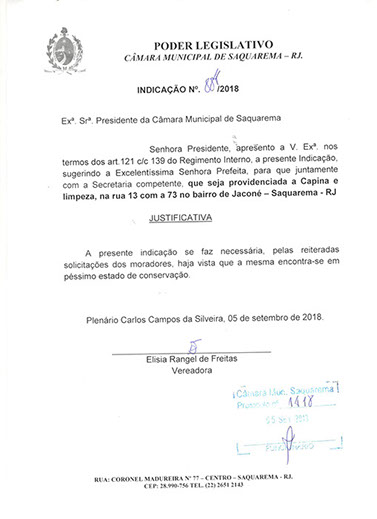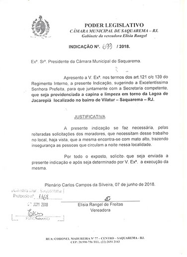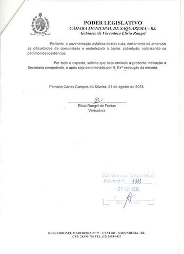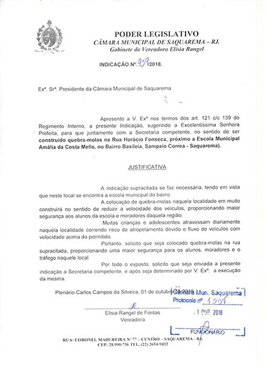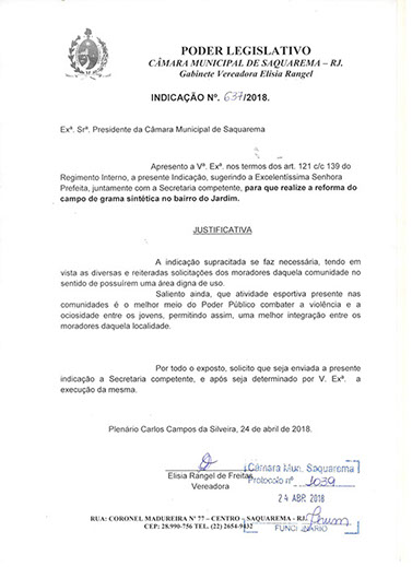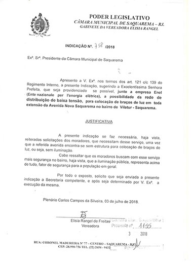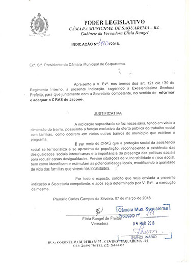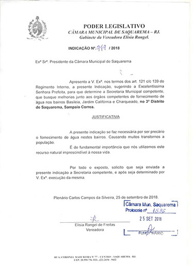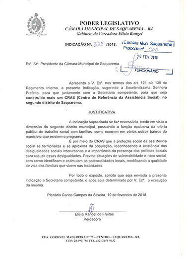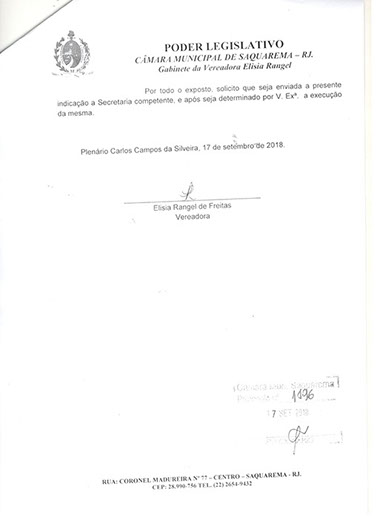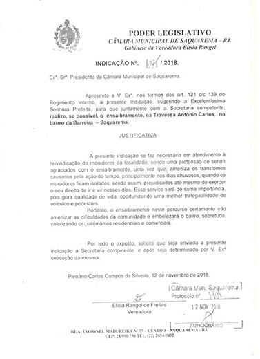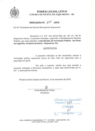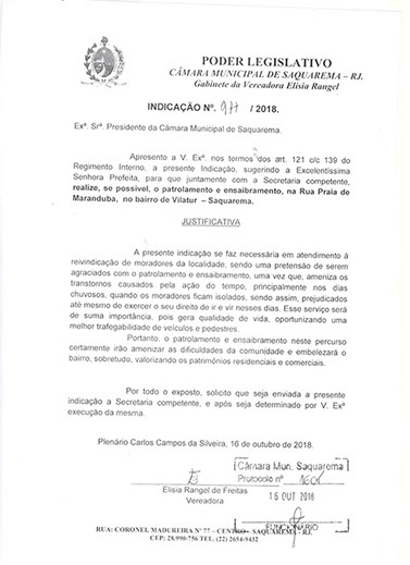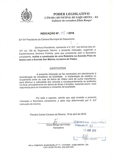 Estão presentes aqui indicações apresentadas por iniciativa de Elisia Rangel durante o seu mandato vigente como Vereadora do Município de Saquarema, na Região dos Lagos do estado do Rio de Janeiro.