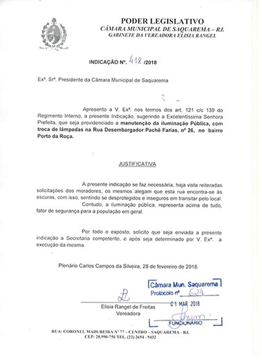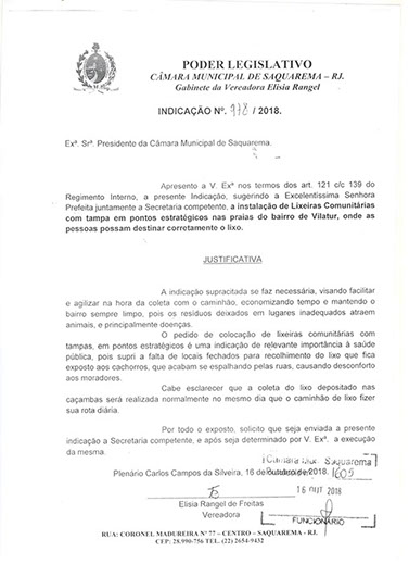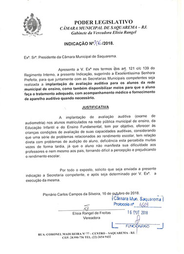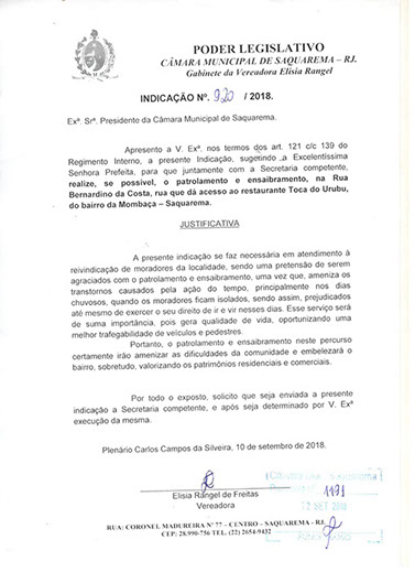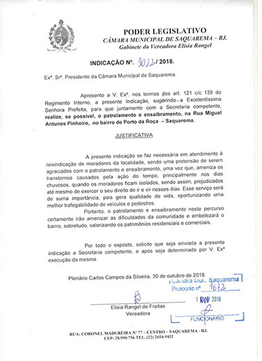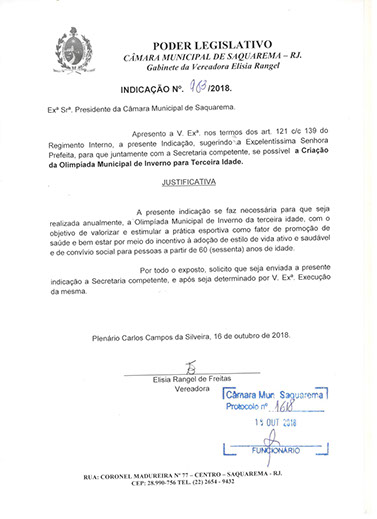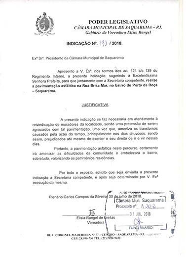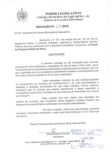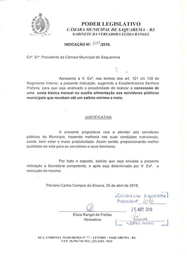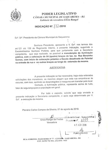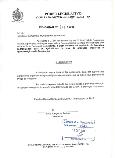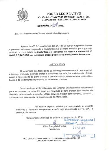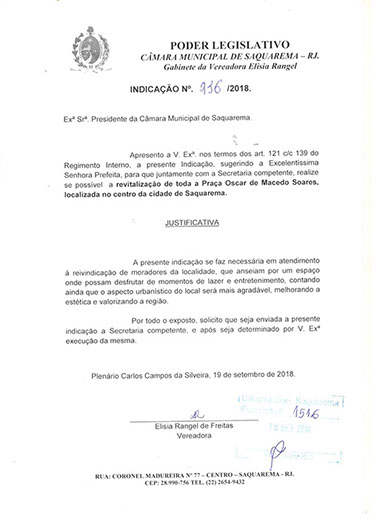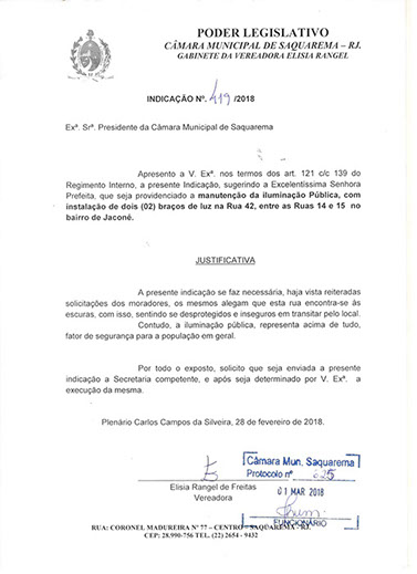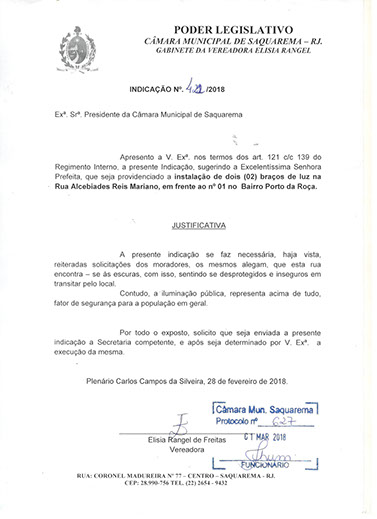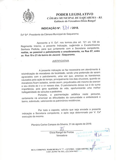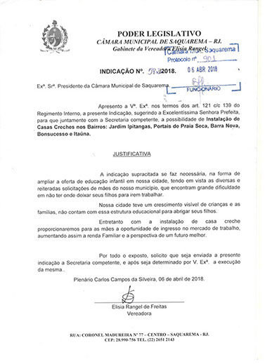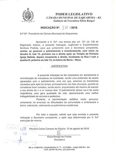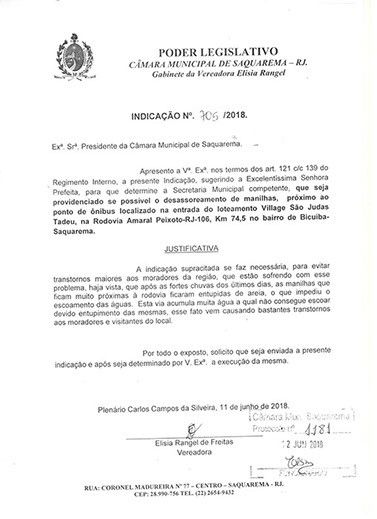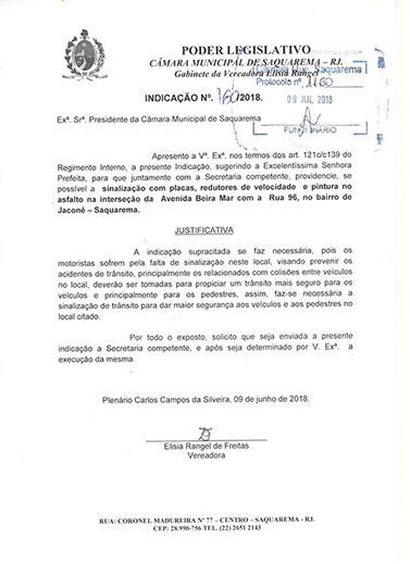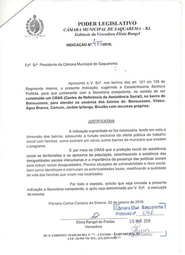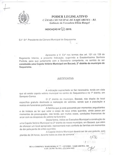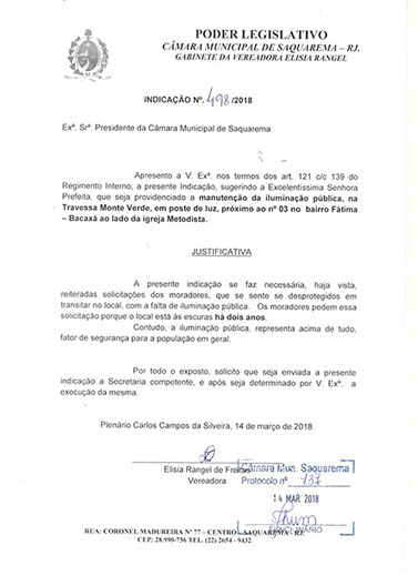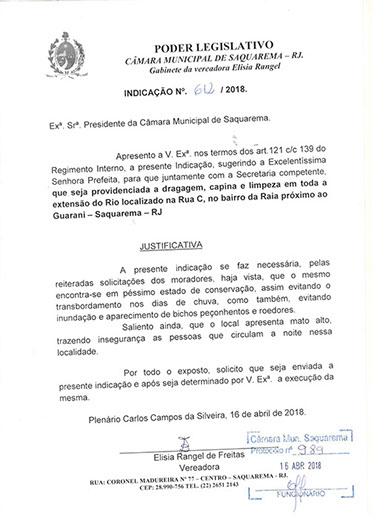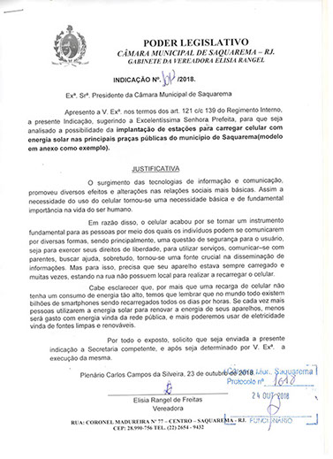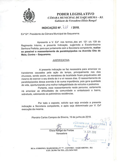 Estão presentes aqui indicações apresentadas por iniciativa de Elisia Rangel durante o seu mandato vigente como Vereadora do Município de Saquarema, na Região dos Lagos do estado do Rio de Janeiro.