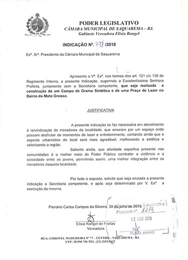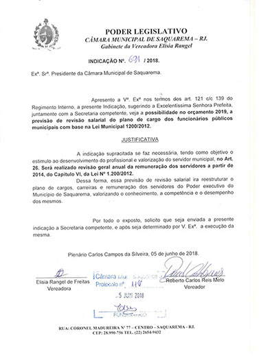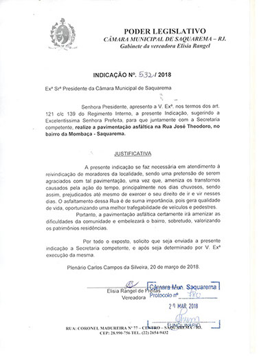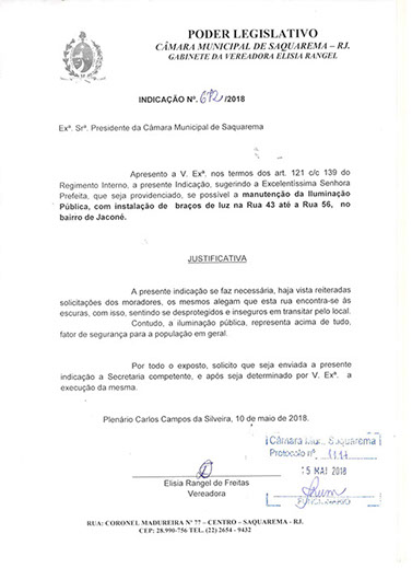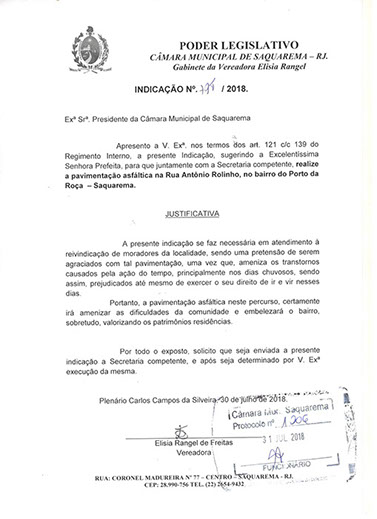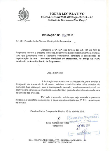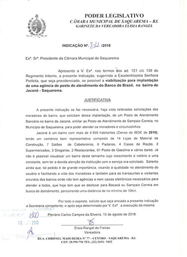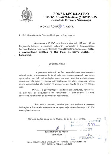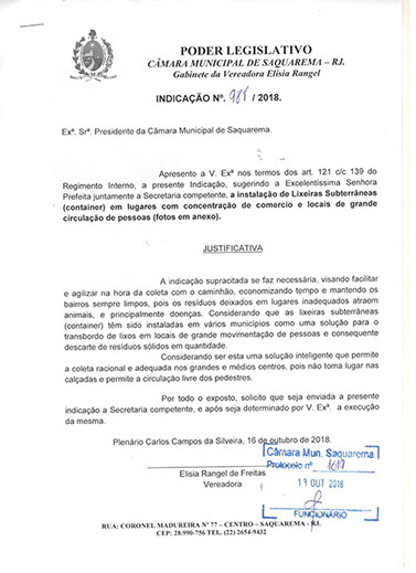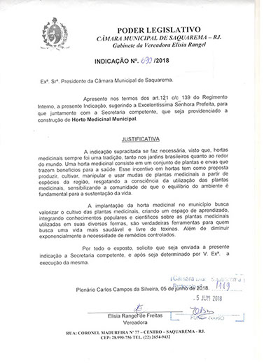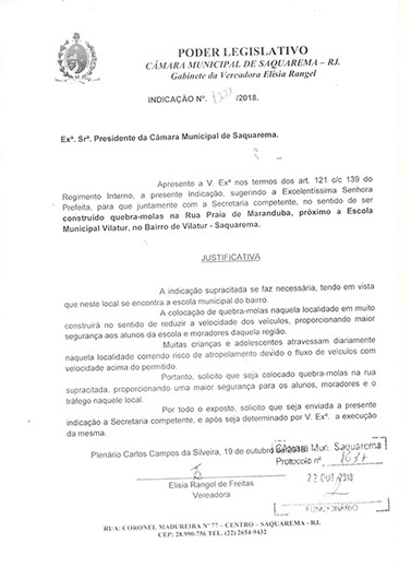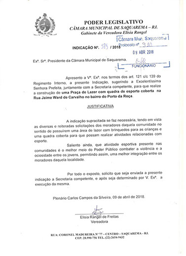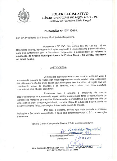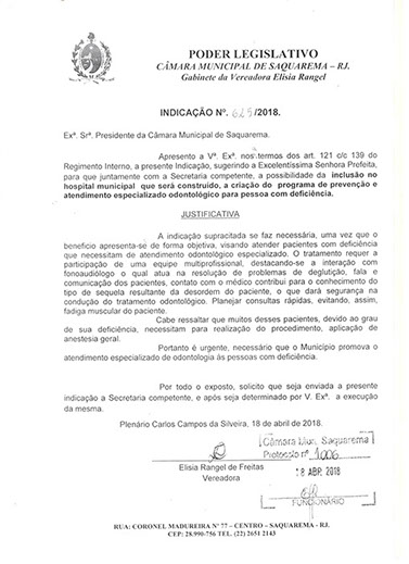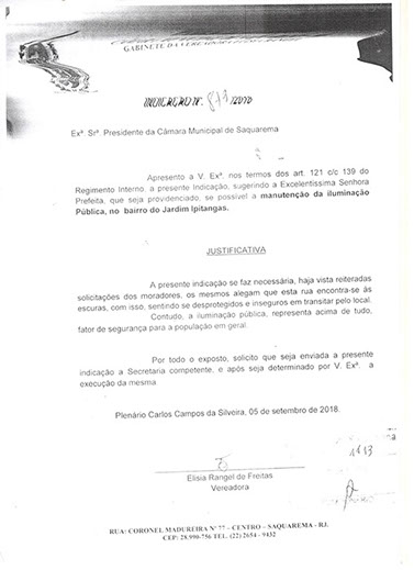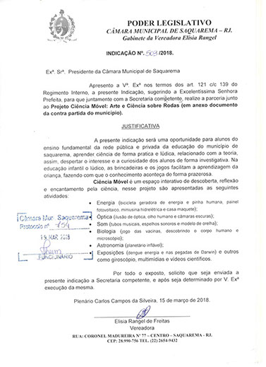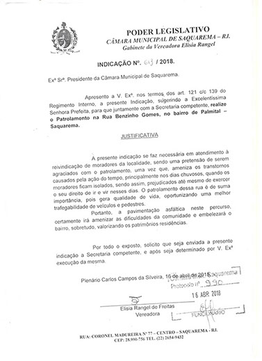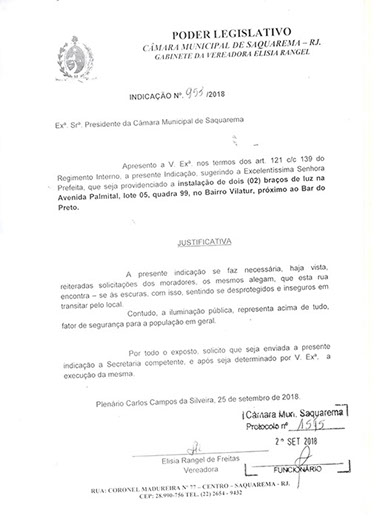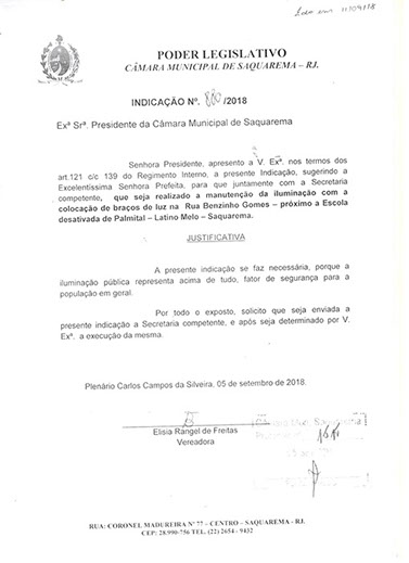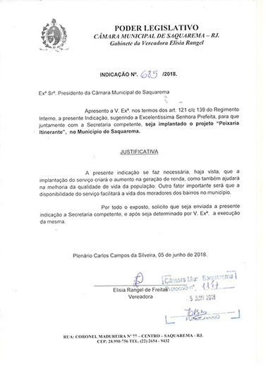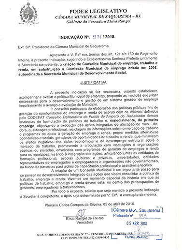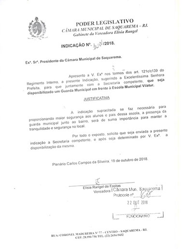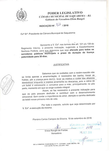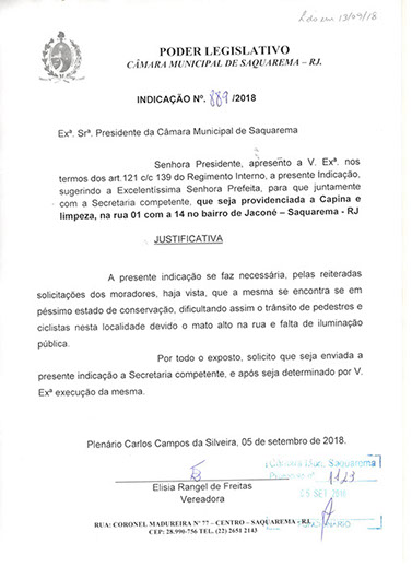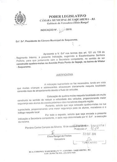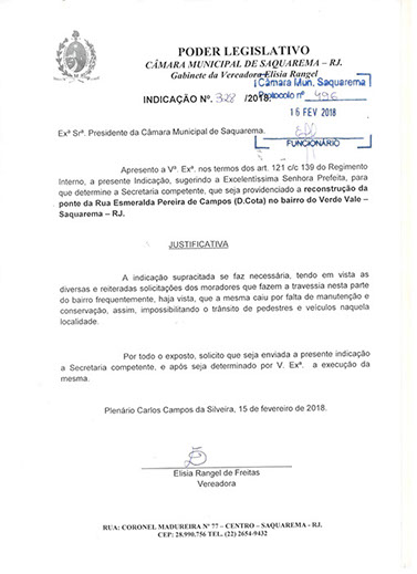 Estão presentes aqui indicações apresentadas por iniciativa de Elisia Rangel durante o seu mandato vigente como Vereadora do Município de Saquarema, na Região dos Lagos do estado do Rio de Janeiro.