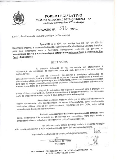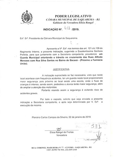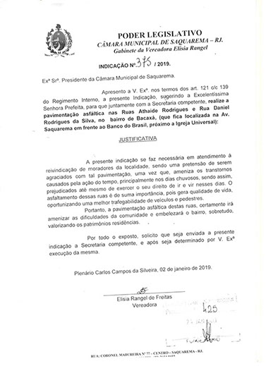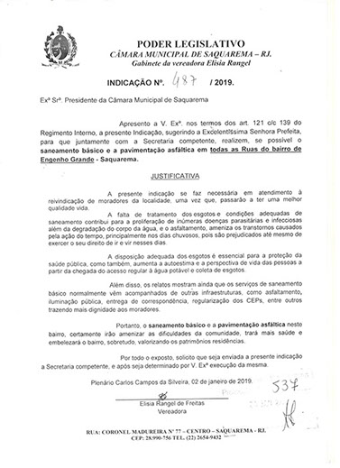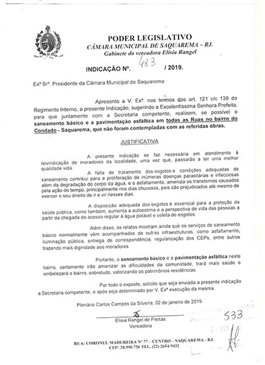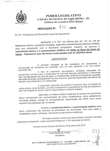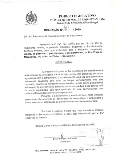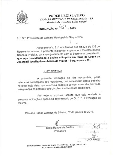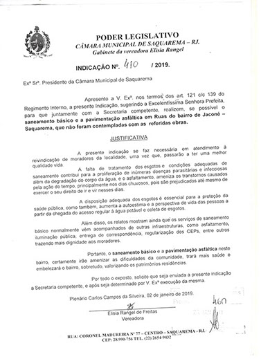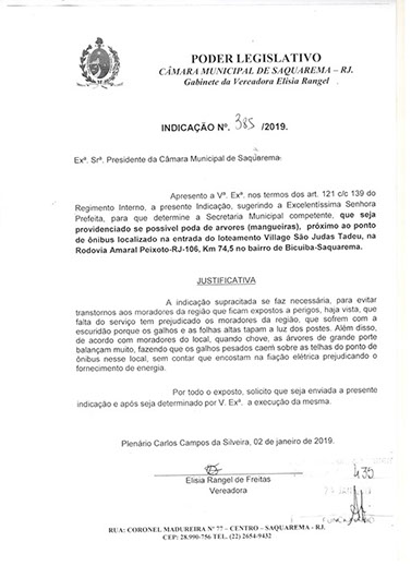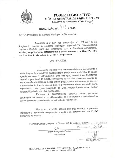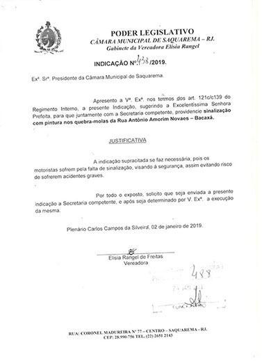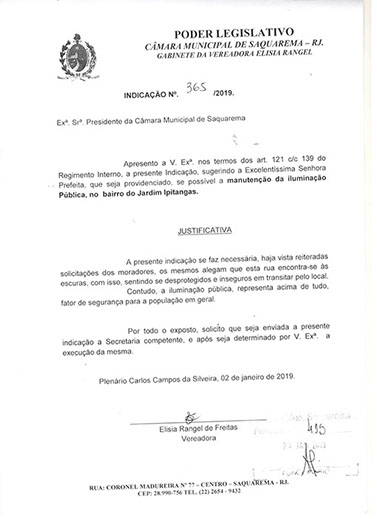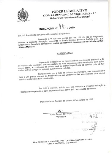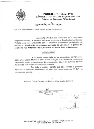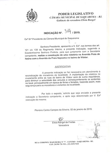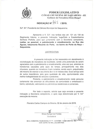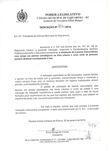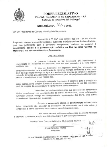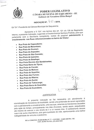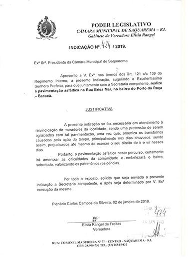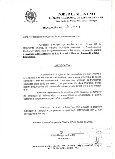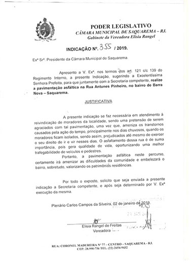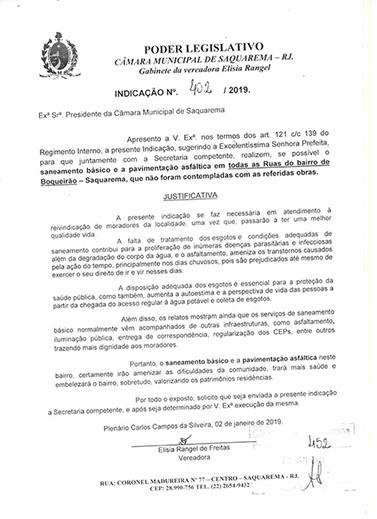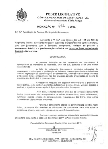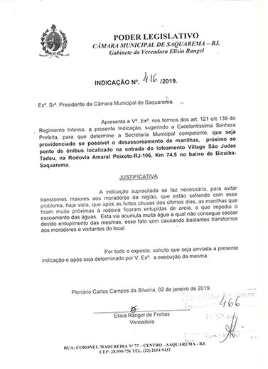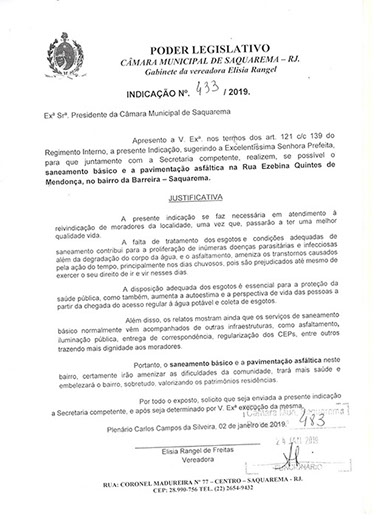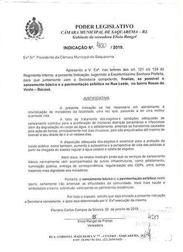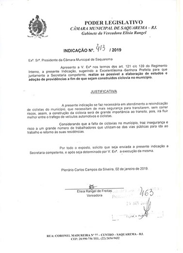 Estão presentes aqui indicações apresentadas por iniciativa de Elisia Rangel durante o seu mandato vigente como Vereadora do Município de Saquarema, na Região dos Lagos do estado do Rio de Janeiro.