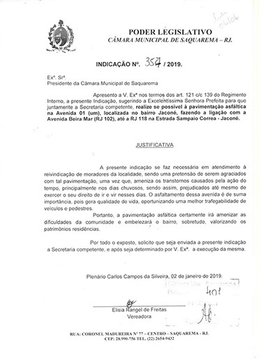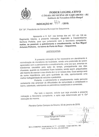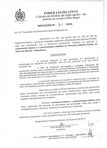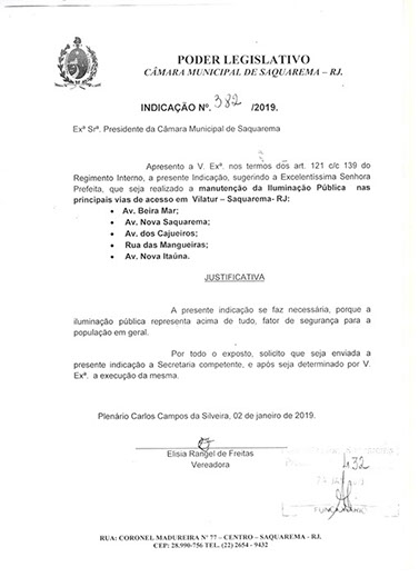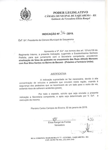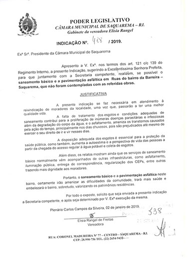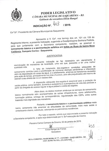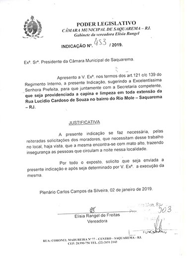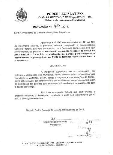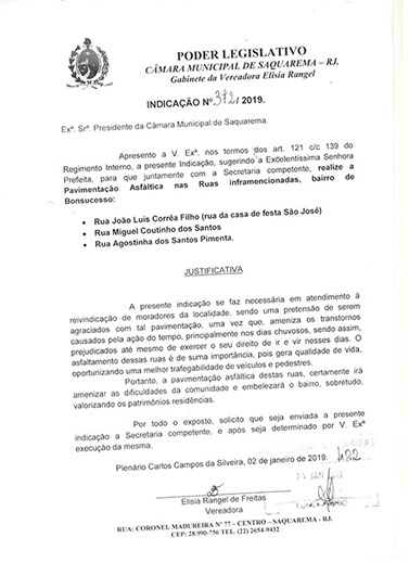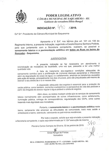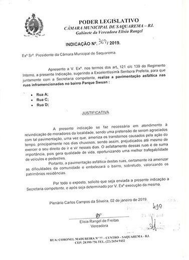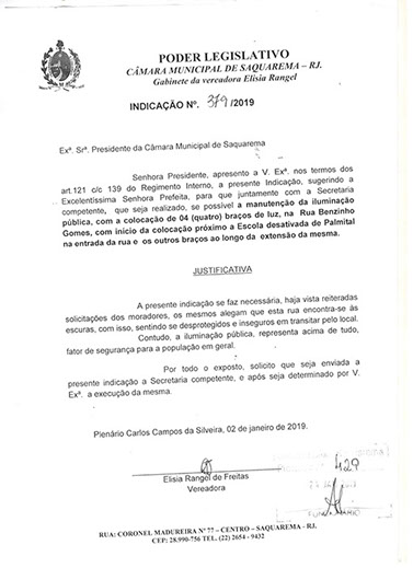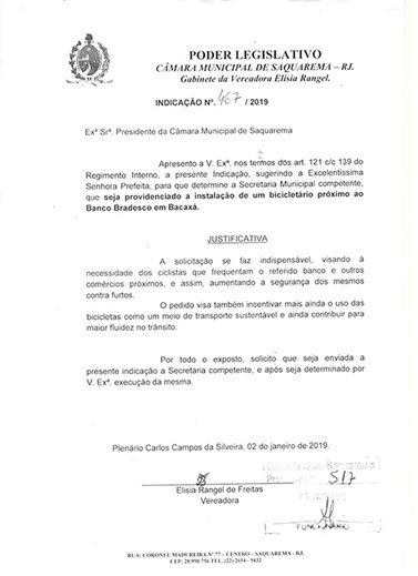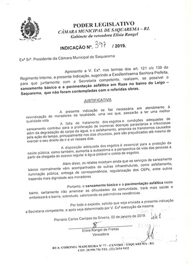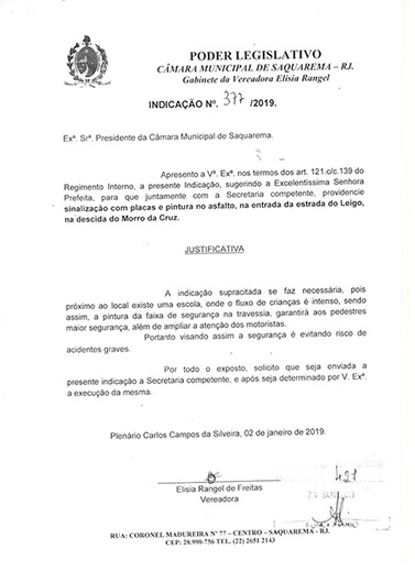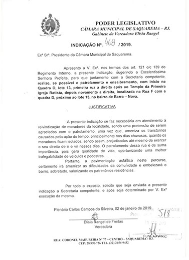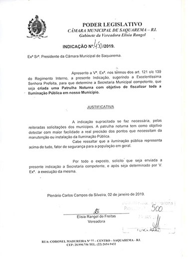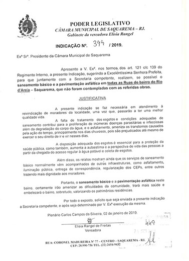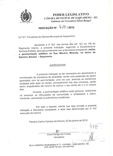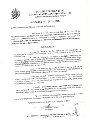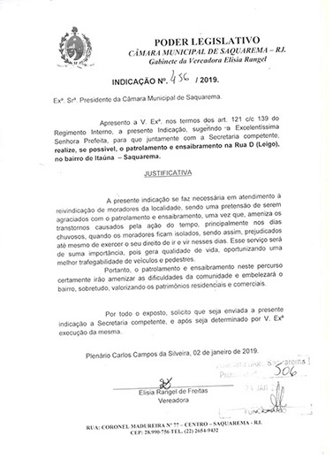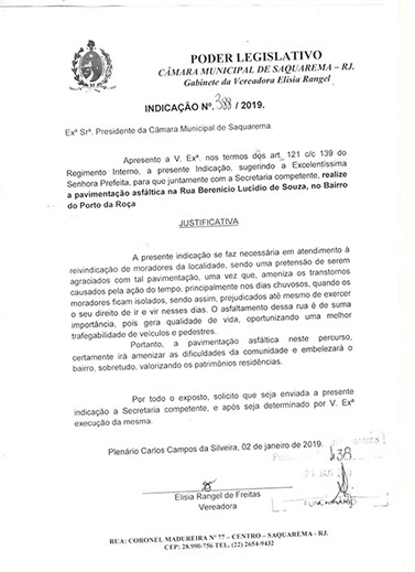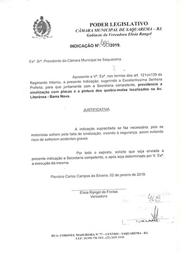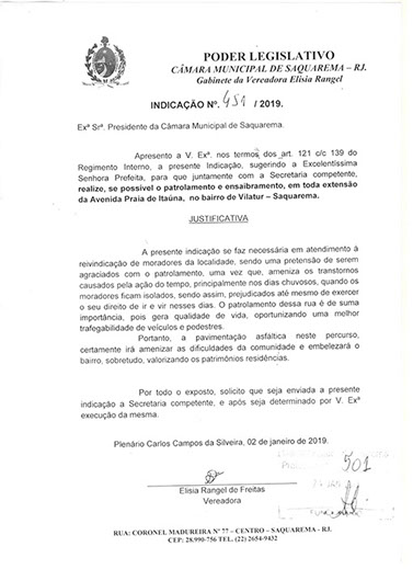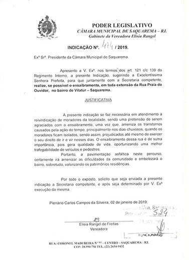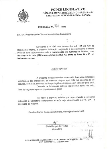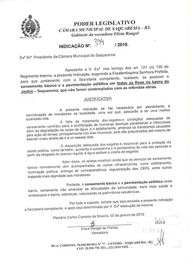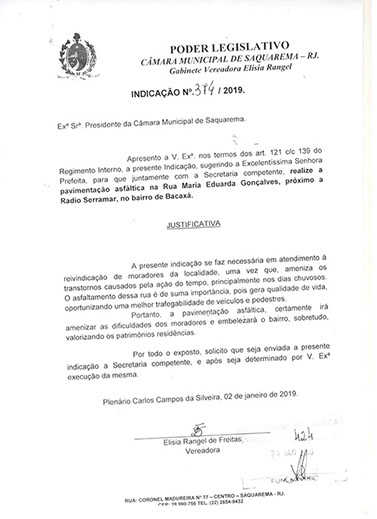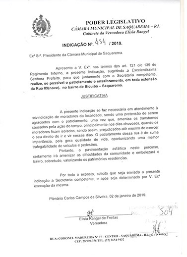 Estão presentes aqui indicações apresentadas por iniciativa de Elisia Rangel durante o seu mandato vigente como Vereadora do Município de Saquarema, na Região dos Lagos do estado do Rio de Janeiro.