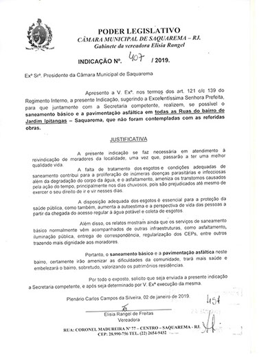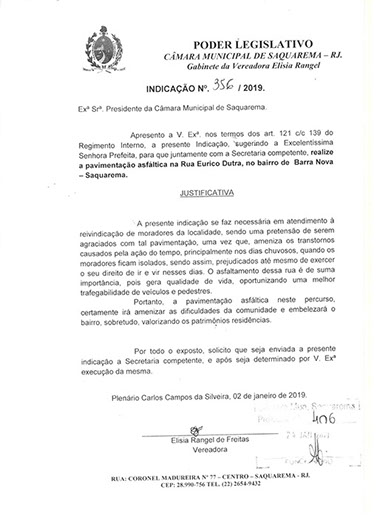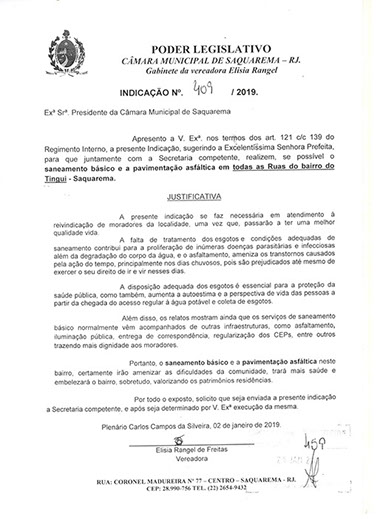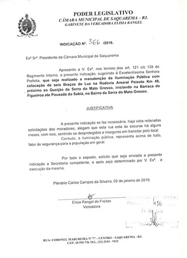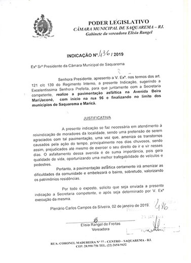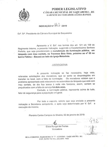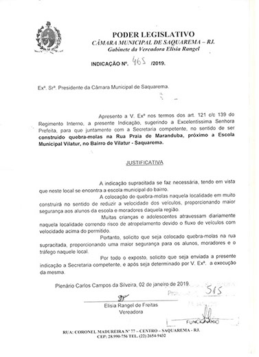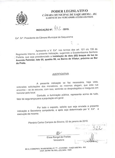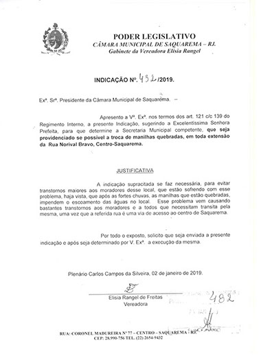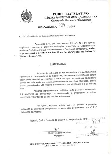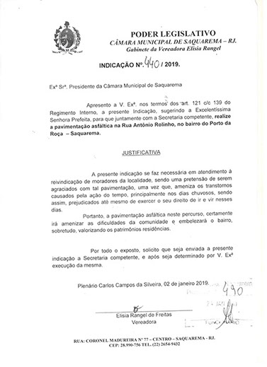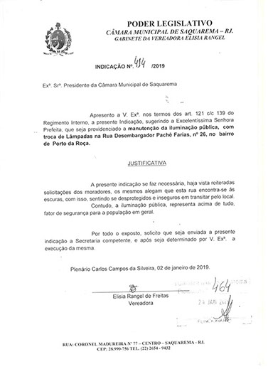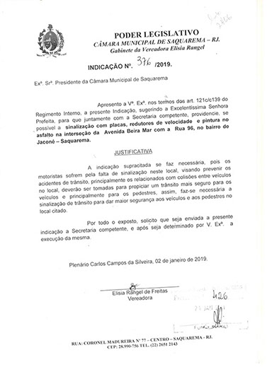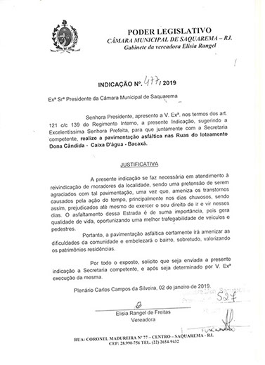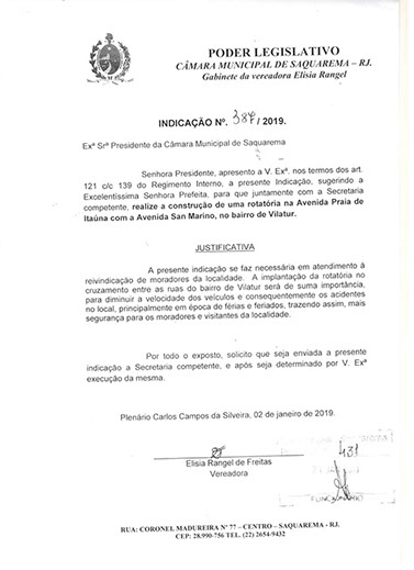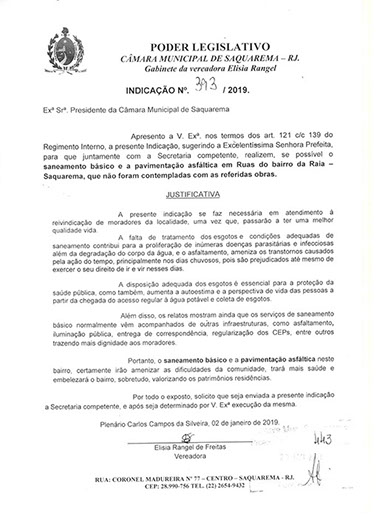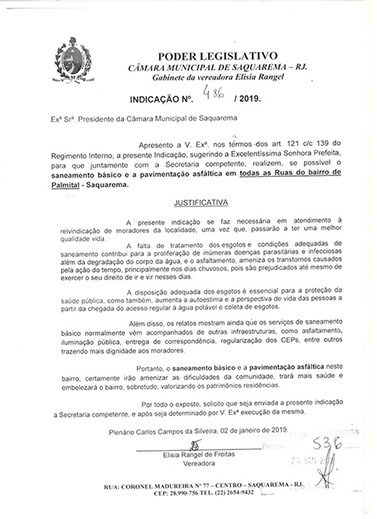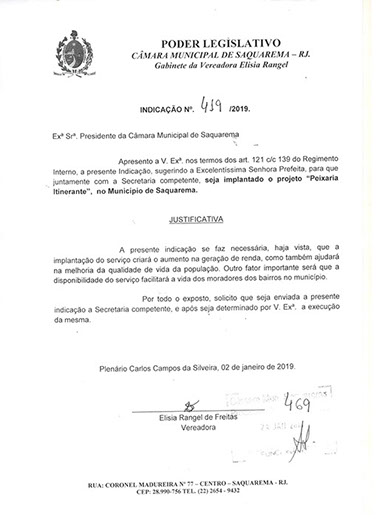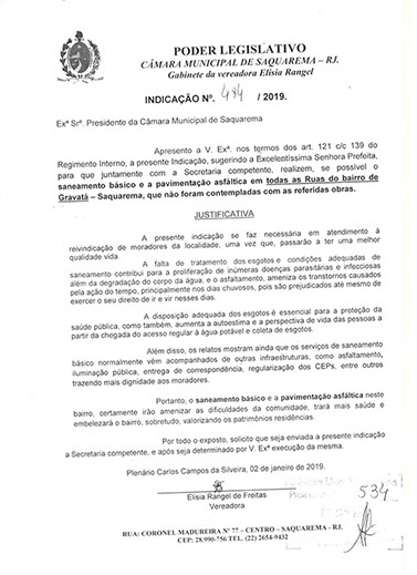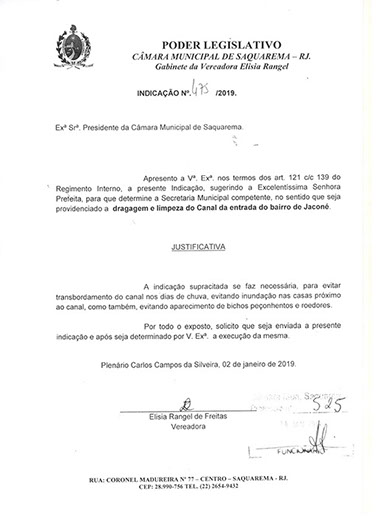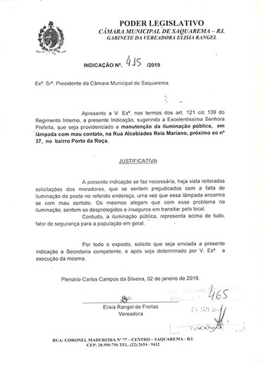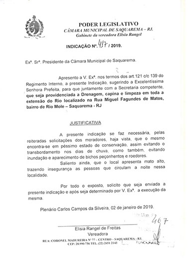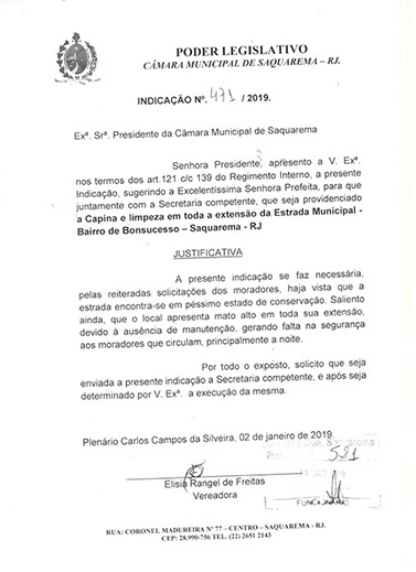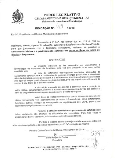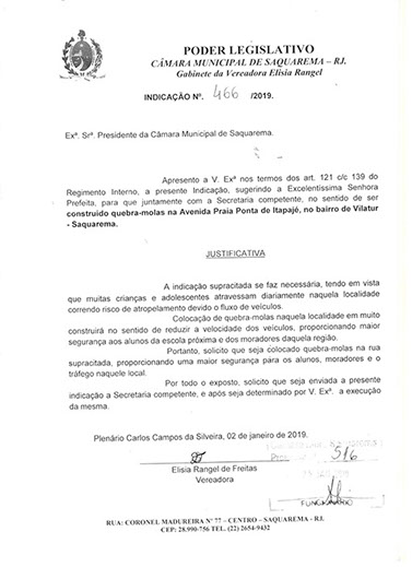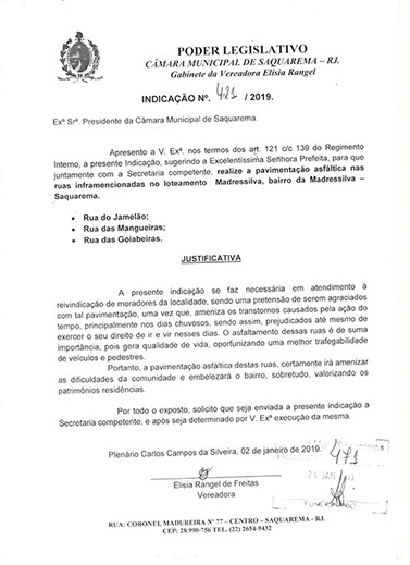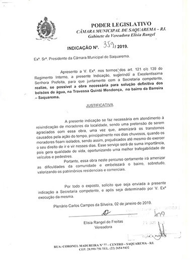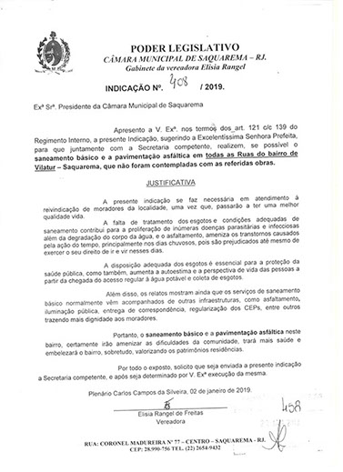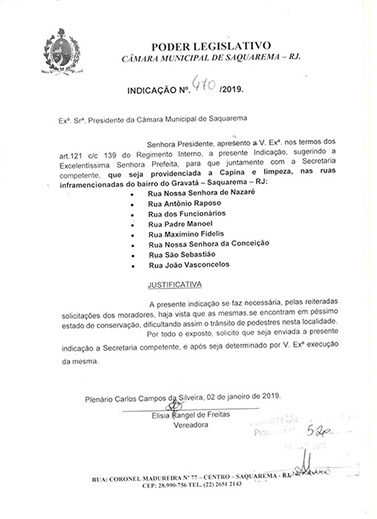 Estão presentes aqui indicações apresentadas por iniciativa de Elisia Rangel durante o seu mandato vigente como Vereadora do Município de Saquarema, na Região dos Lagos do estado do Rio de Janeiro.