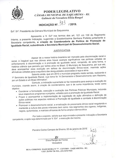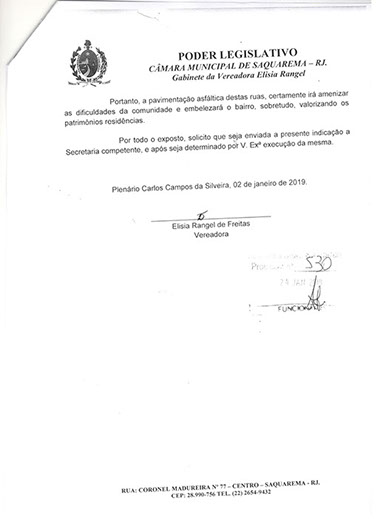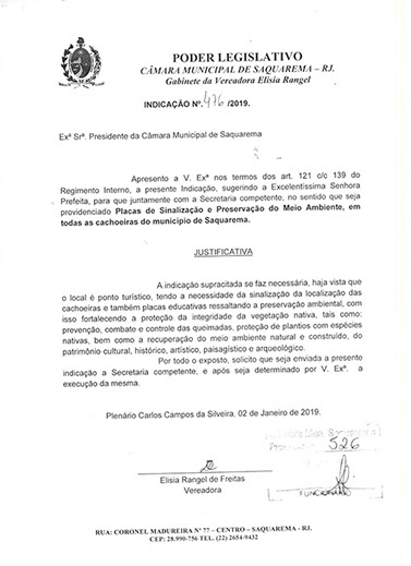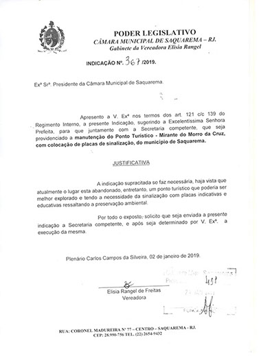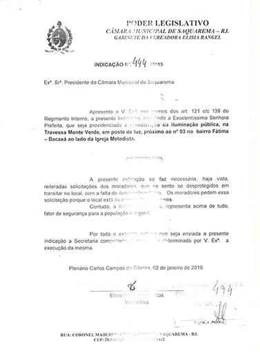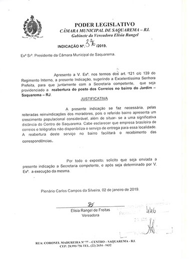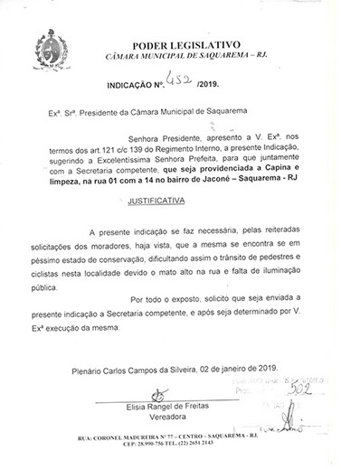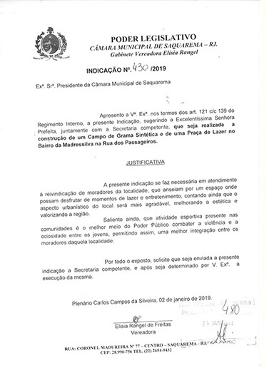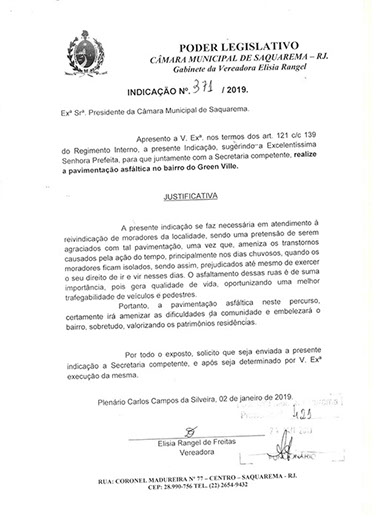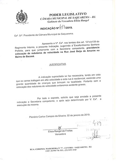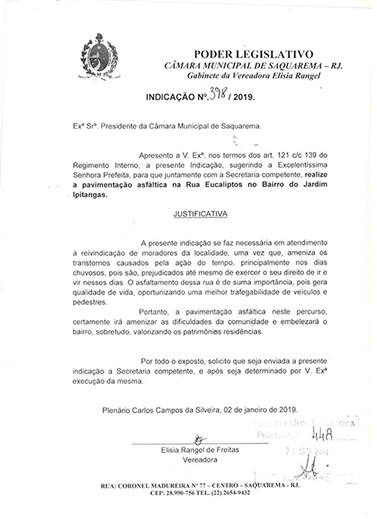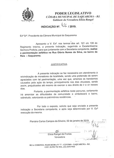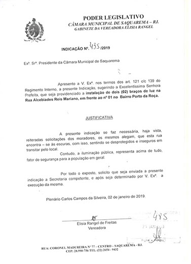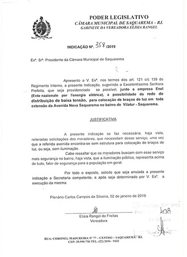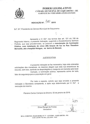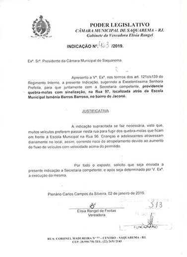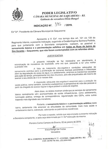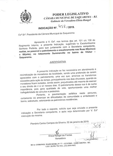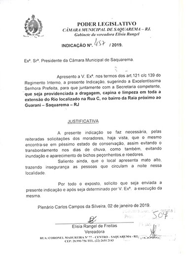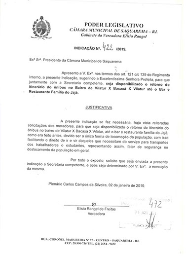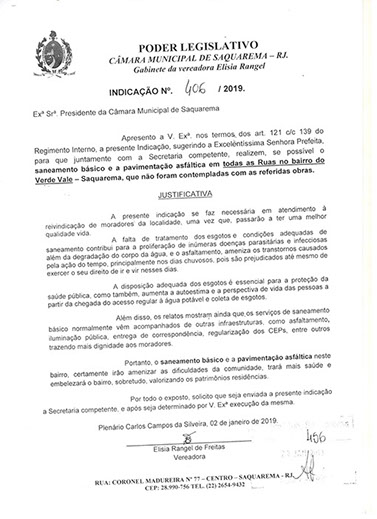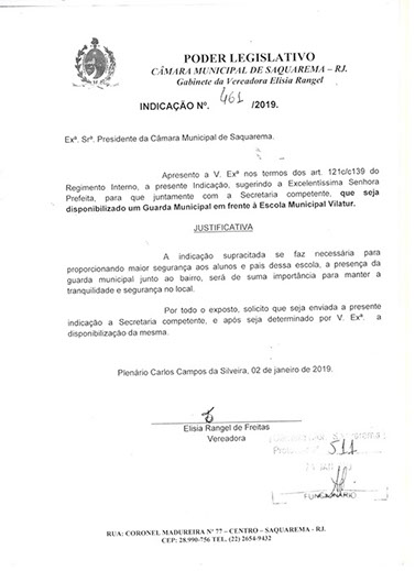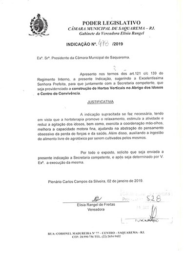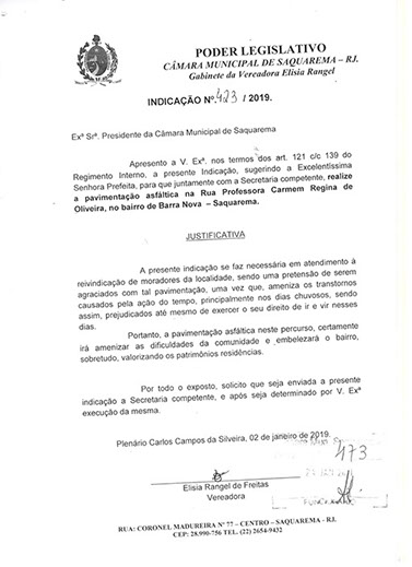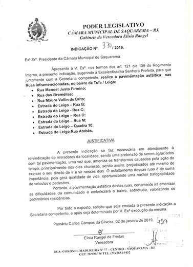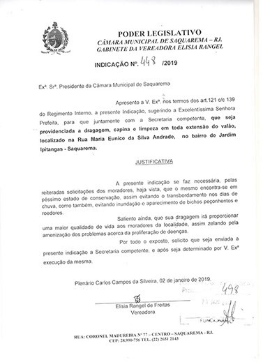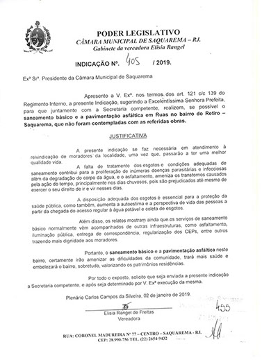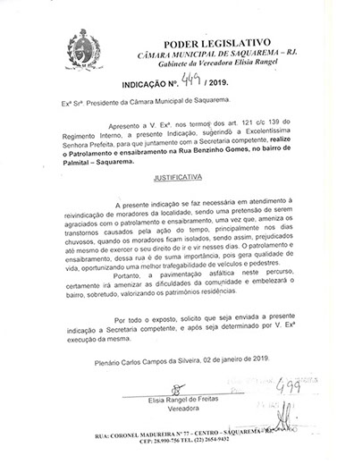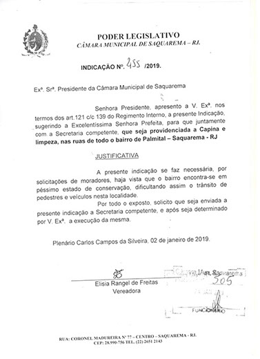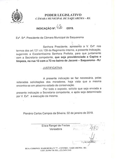 Estão presentes aqui indicações apresentadas por iniciativa de Elisia Rangel durante o seu mandato vigente como Vereadora do Município de Saquarema, na Região dos Lagos do estado do Rio de Janeiro.