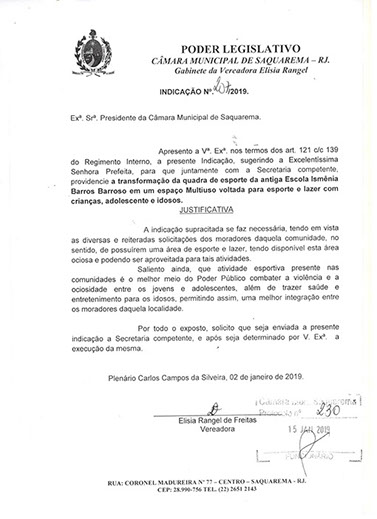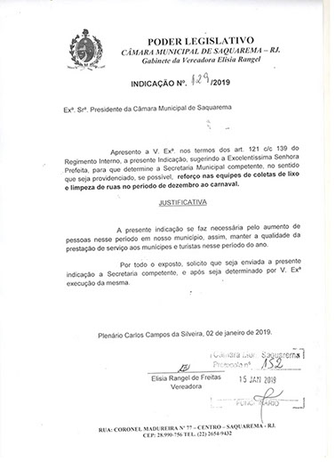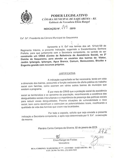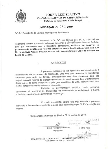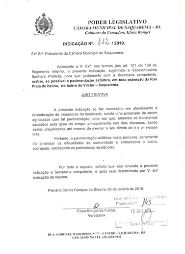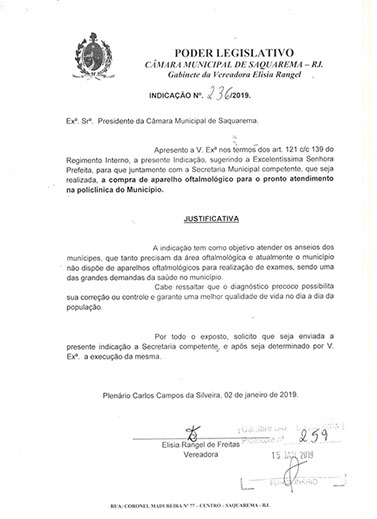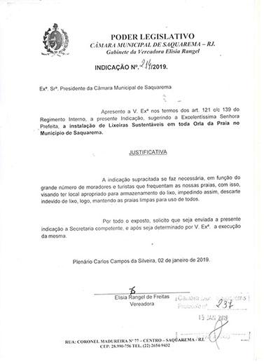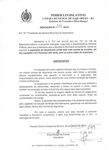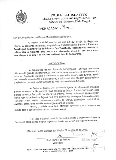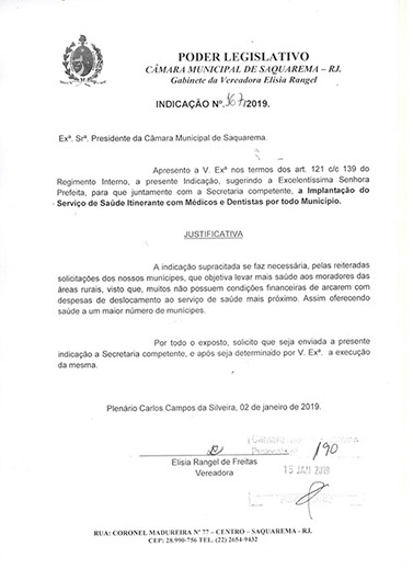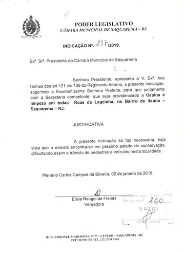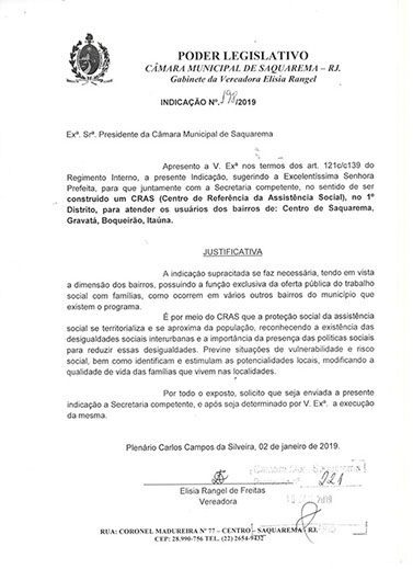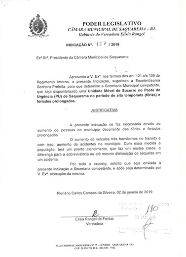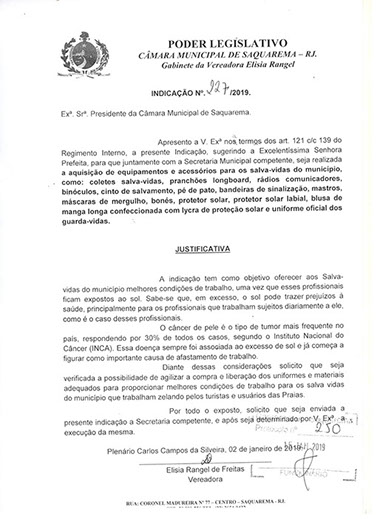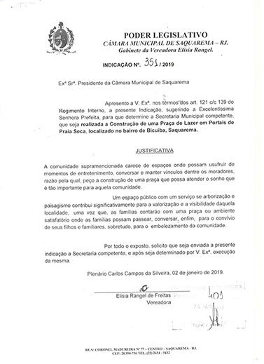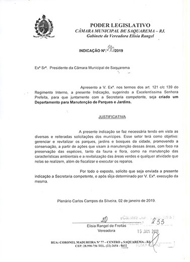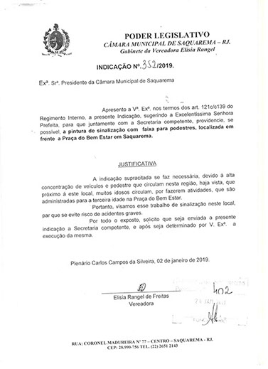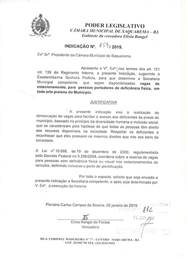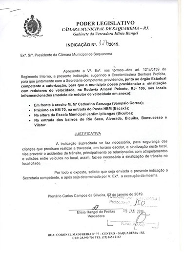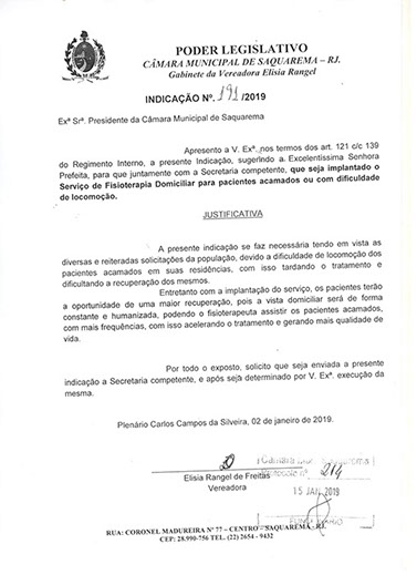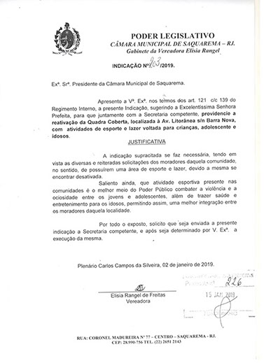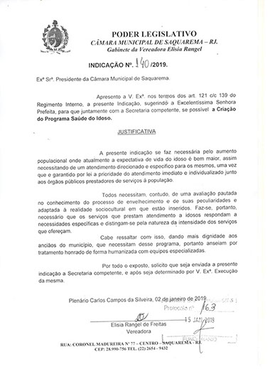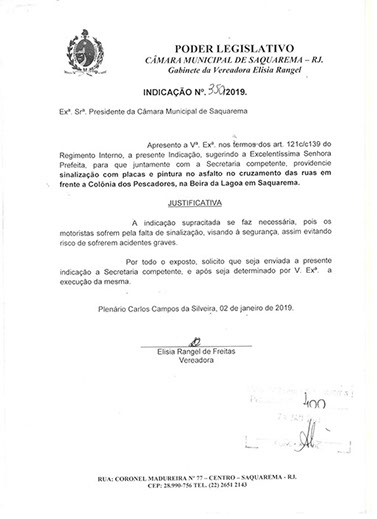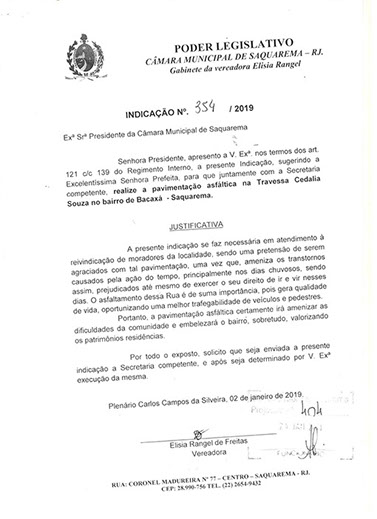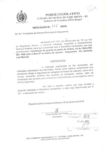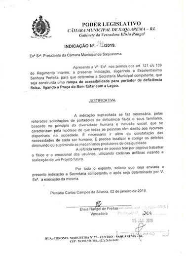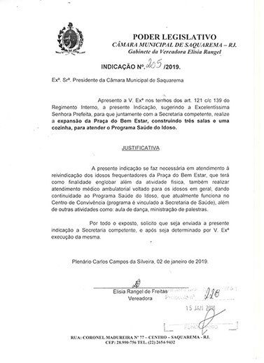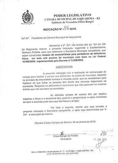 Estão presentes aqui indicações apresentadas por iniciativa de Elisia Rangel durante o seu mandato vigente como Vereadora do Município de Saquarema, na Região dos Lagos do estado do Rio de Janeiro.