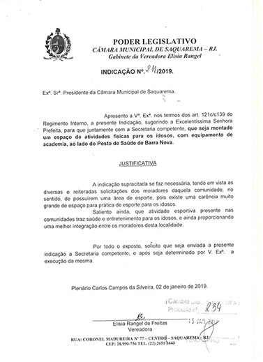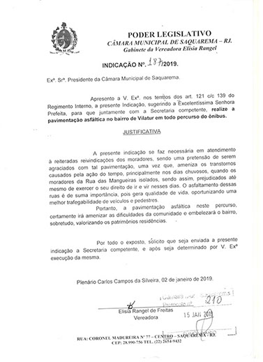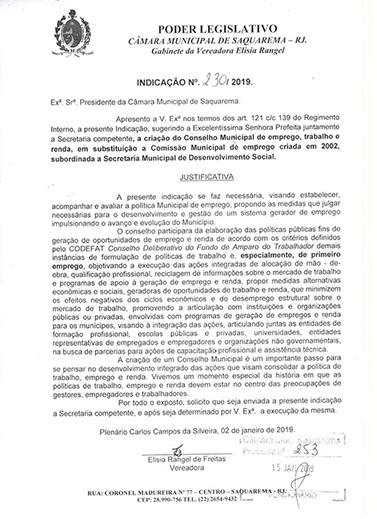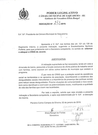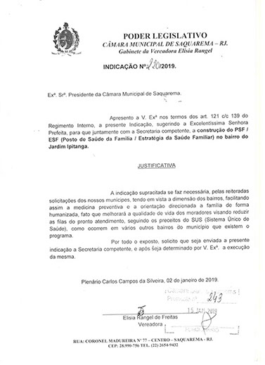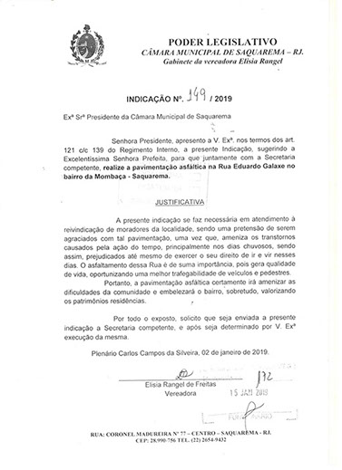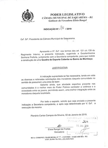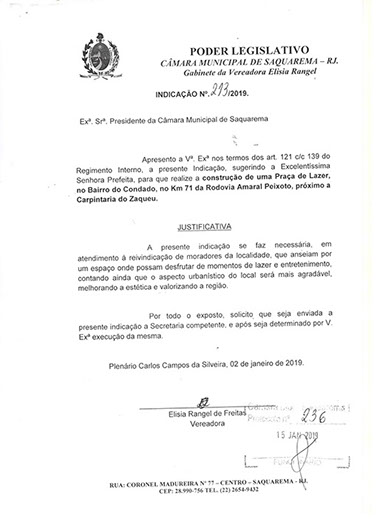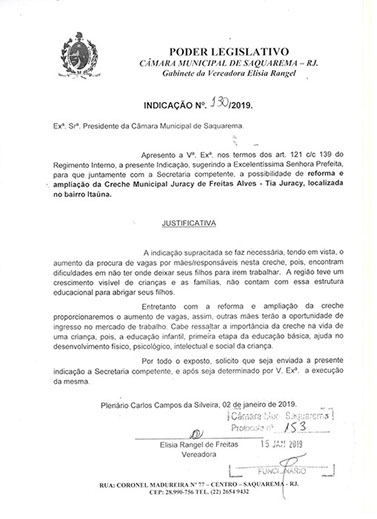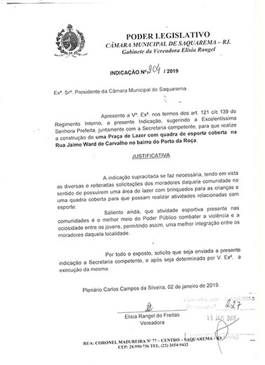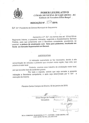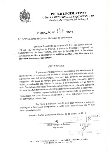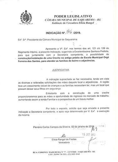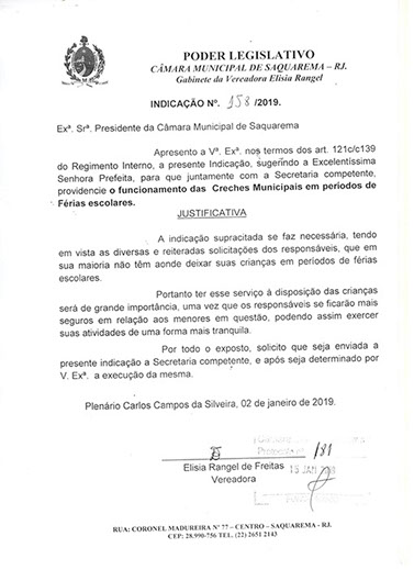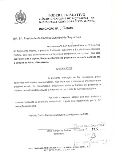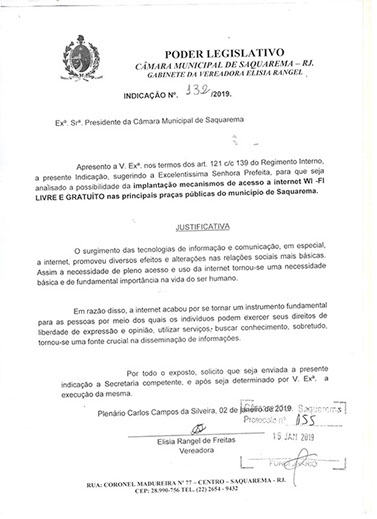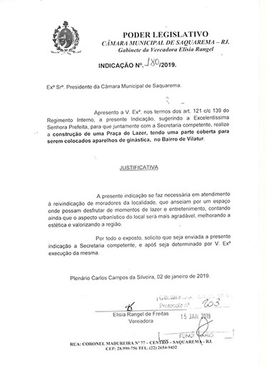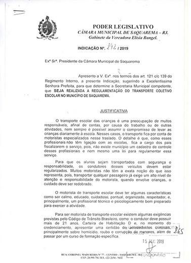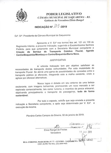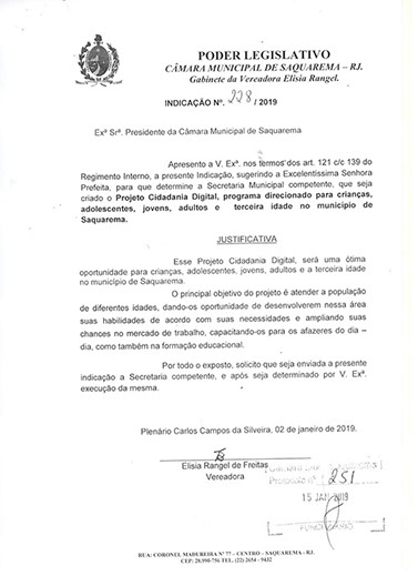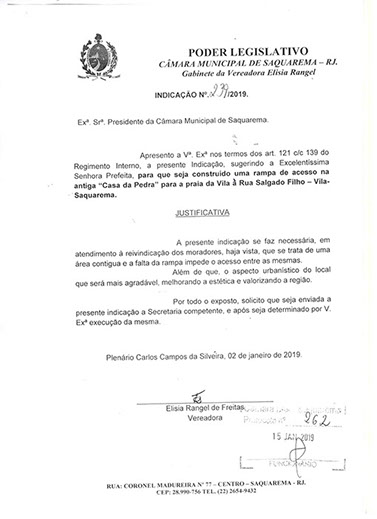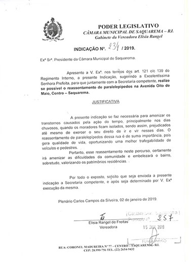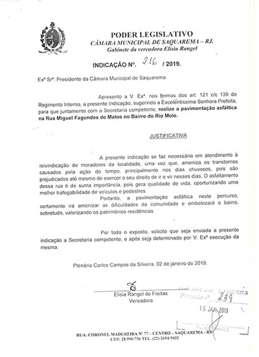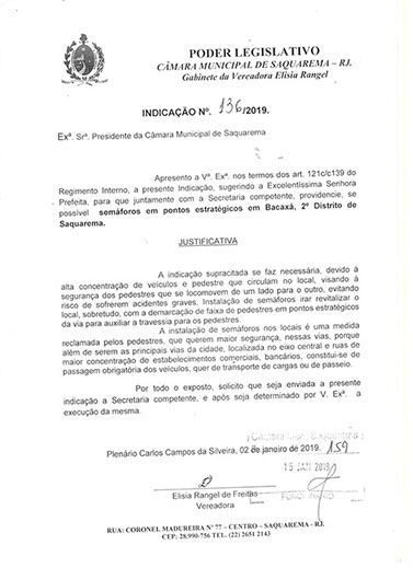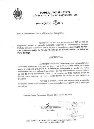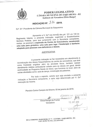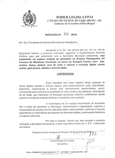 Estão presentes aqui indicações apresentadas por iniciativa de Elisia Rangel durante o seu mandato vigente como Vereadora do Município de Saquarema, na Região dos Lagos do estado do Rio de Janeiro.
