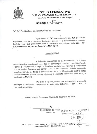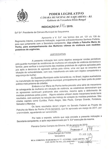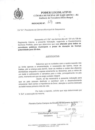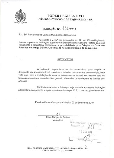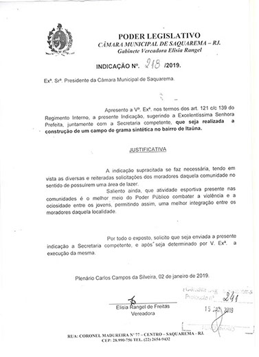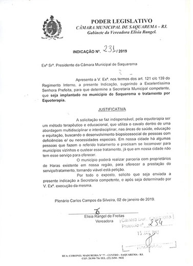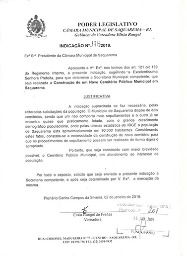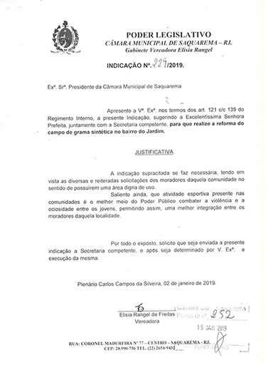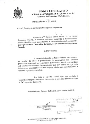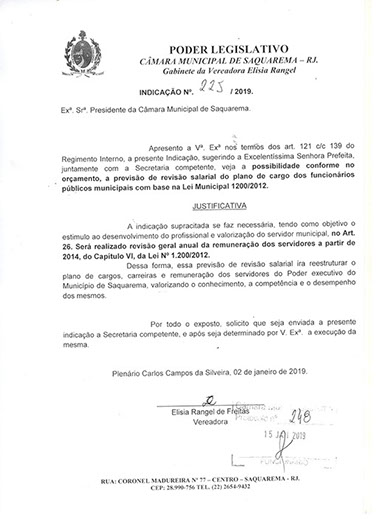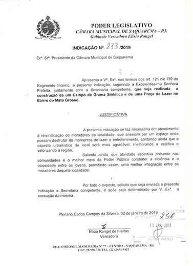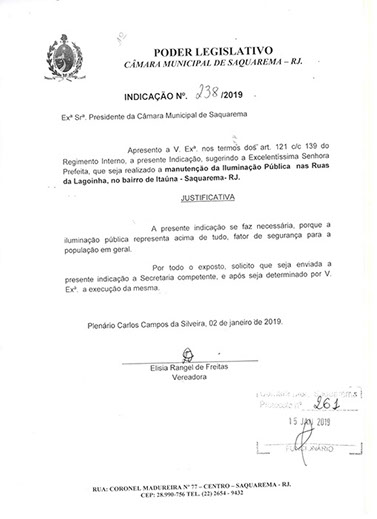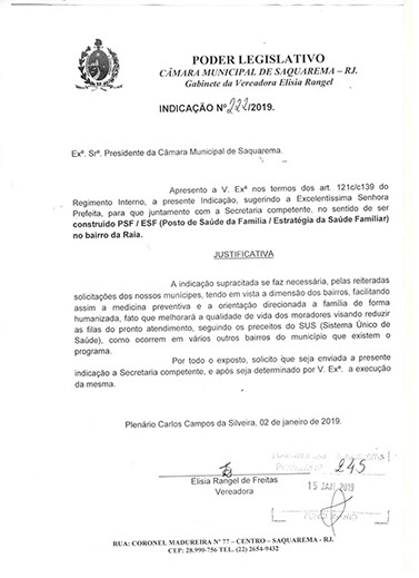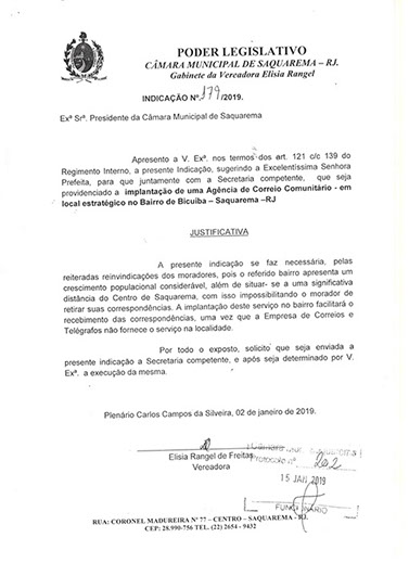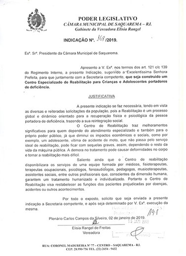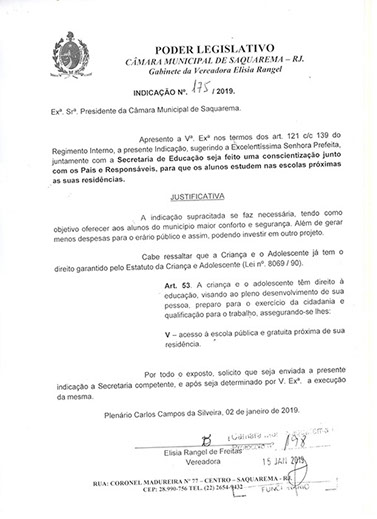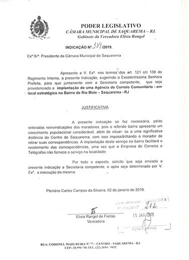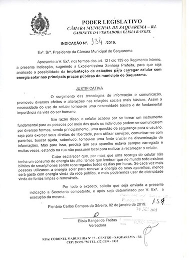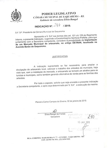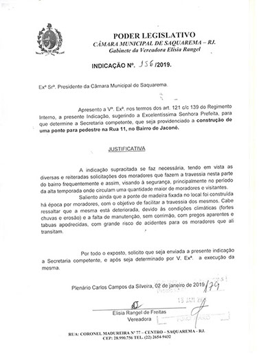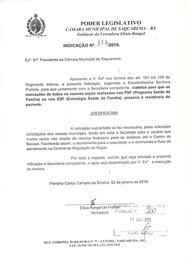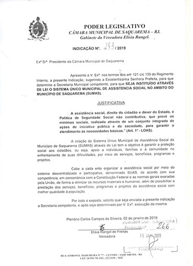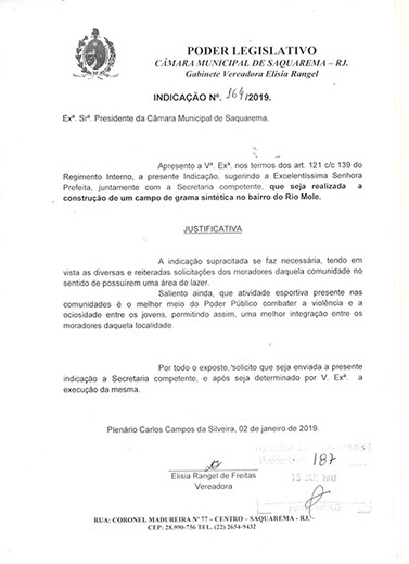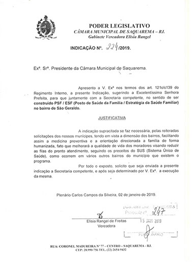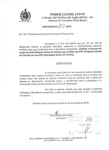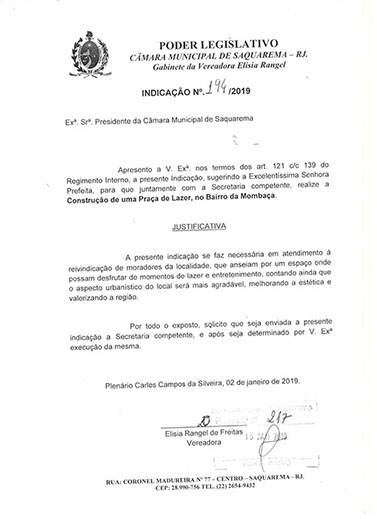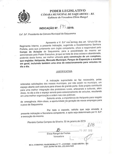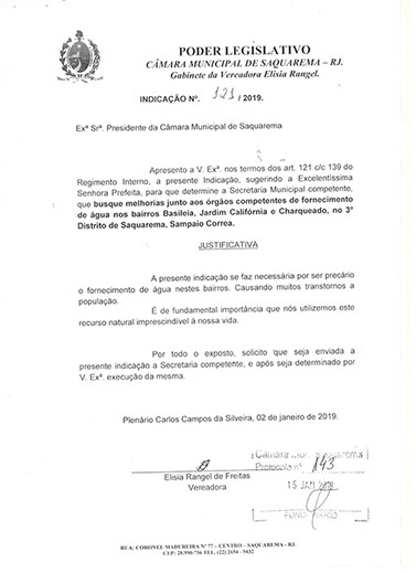 Estão presentes aqui indicações apresentadas por iniciativa de Elisia Rangel durante o seu mandato vigente como Vereadora do Município de Saquarema, na Região dos Lagos do estado do Rio de Janeiro.