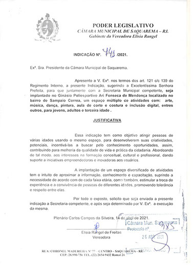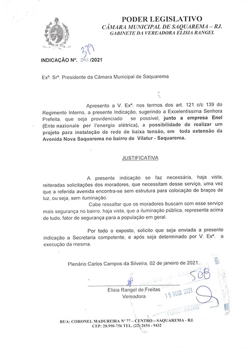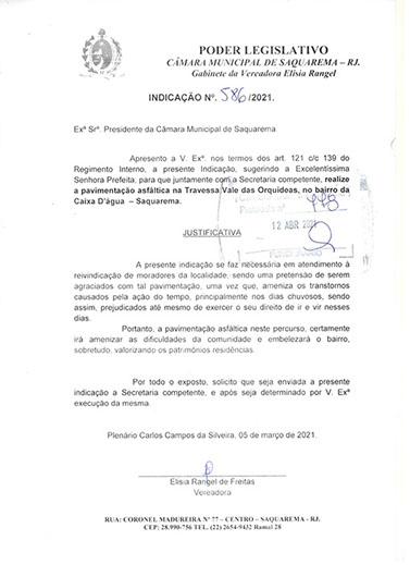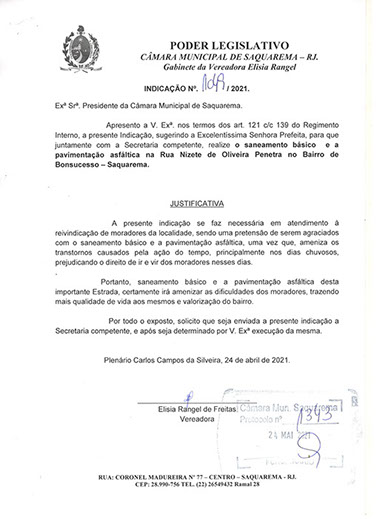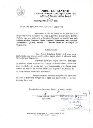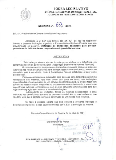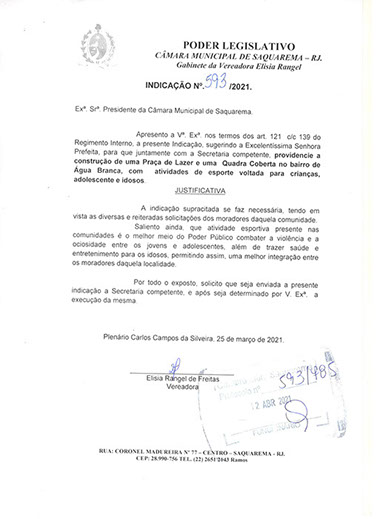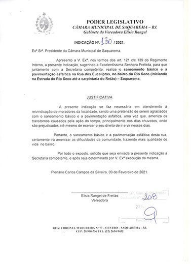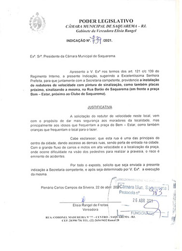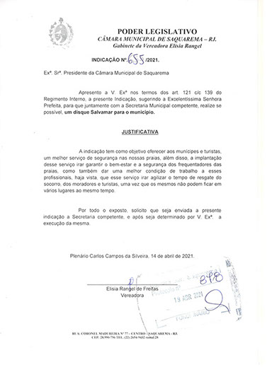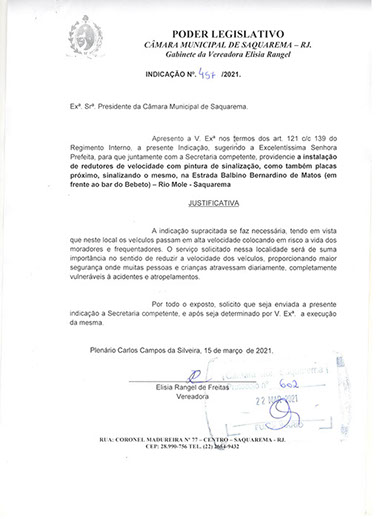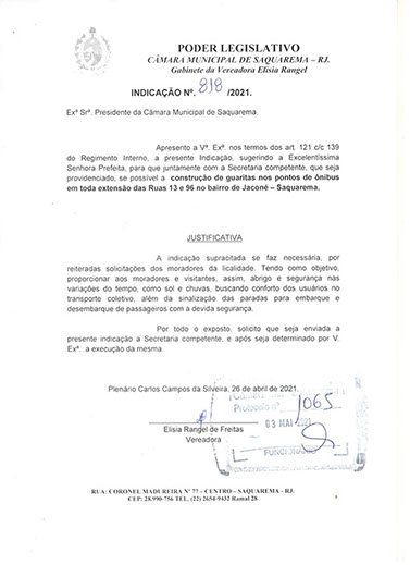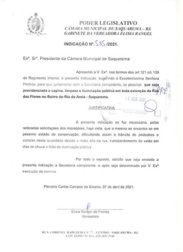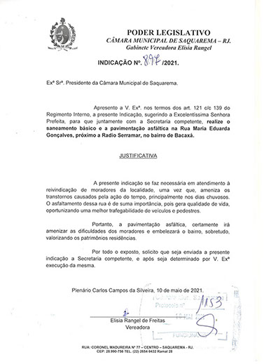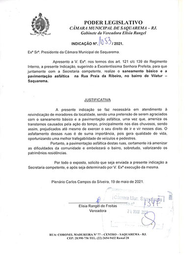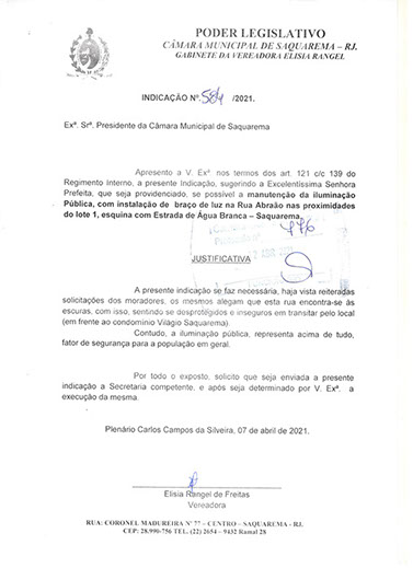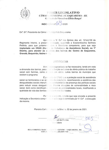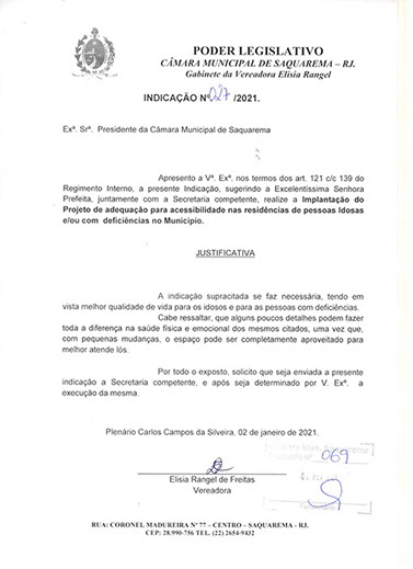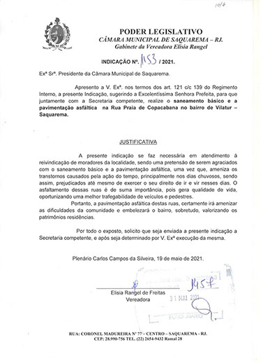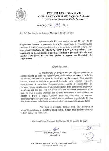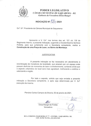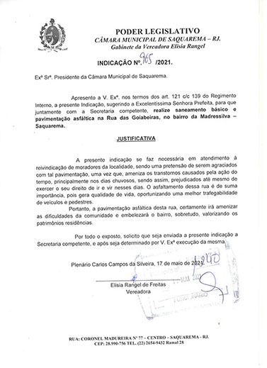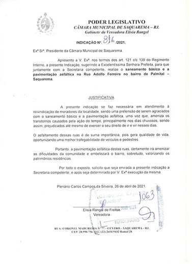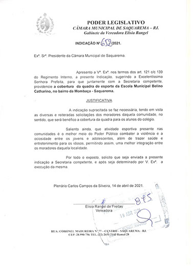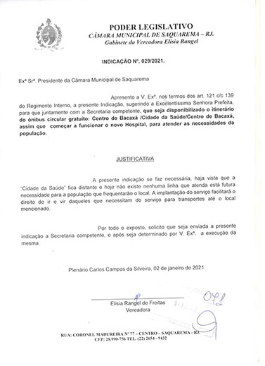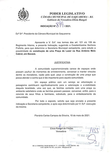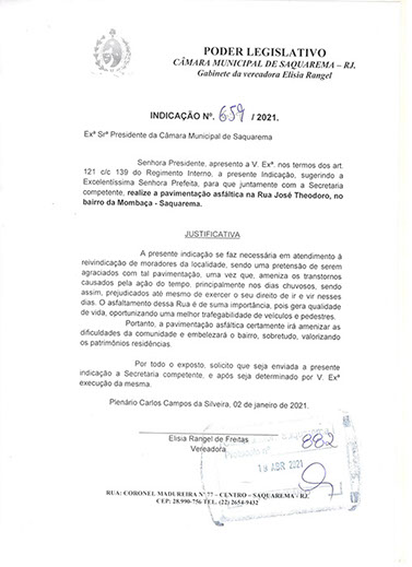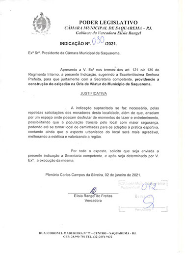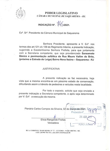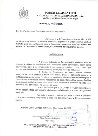 Estão presentes aqui indicações apresentadas por iniciativa de Elisia Rangel durante o seu mandato vigente como Vereadora do Município de Saquarema, na Região dos Lagos do estado do Rio de Janeiro.