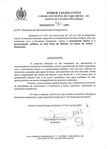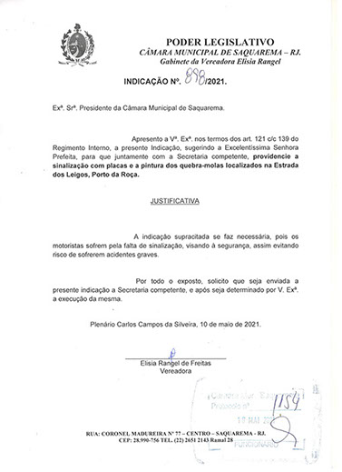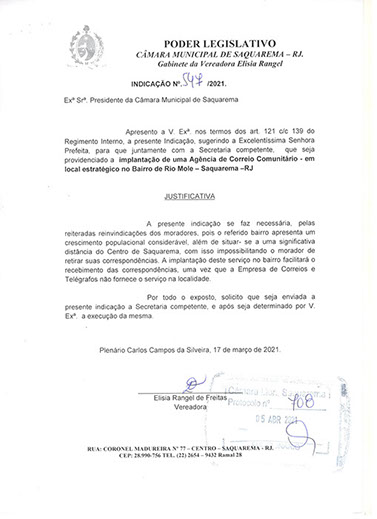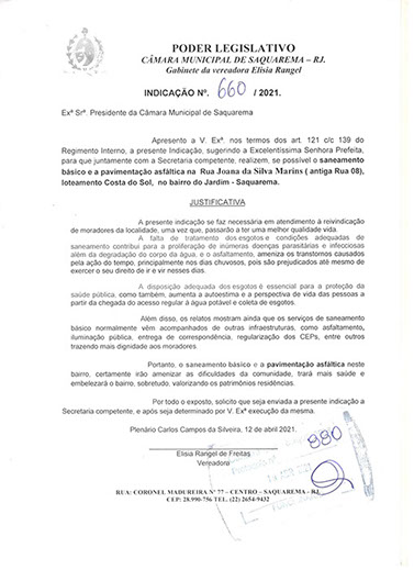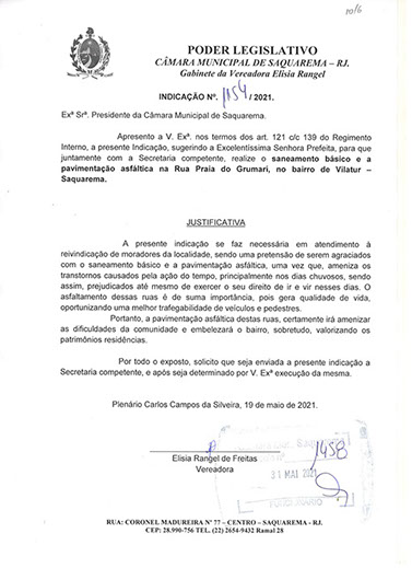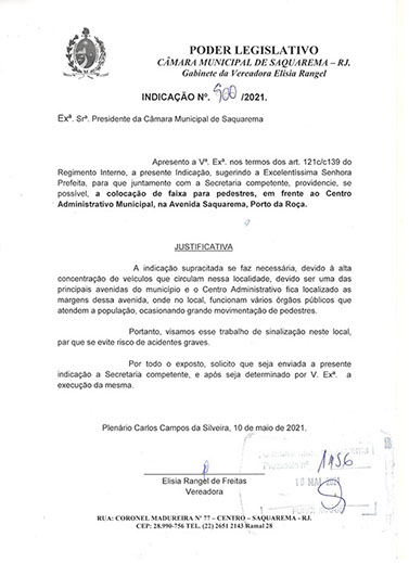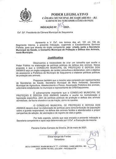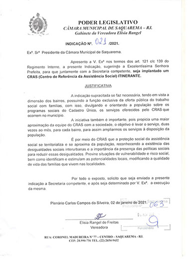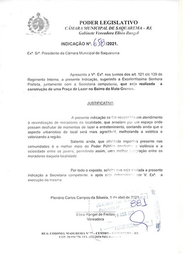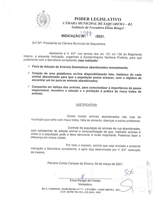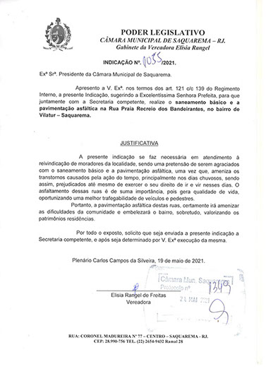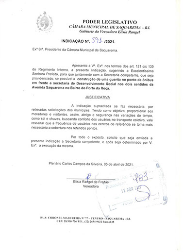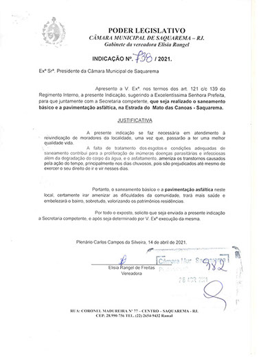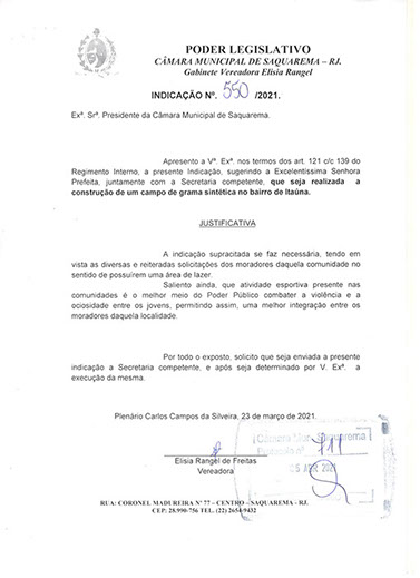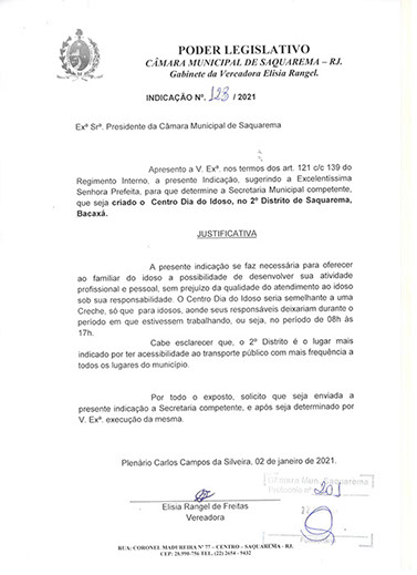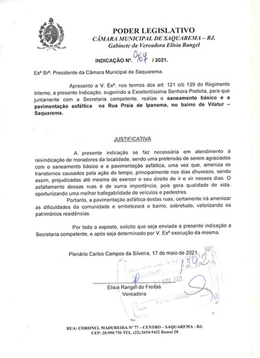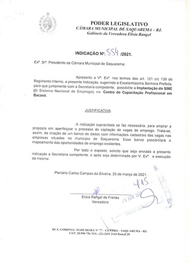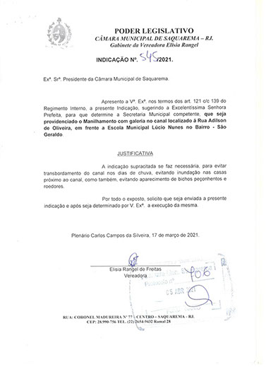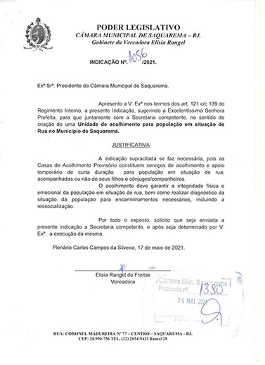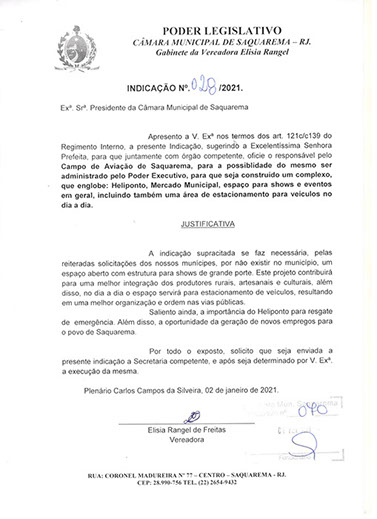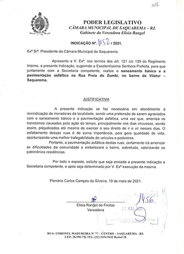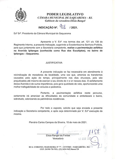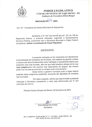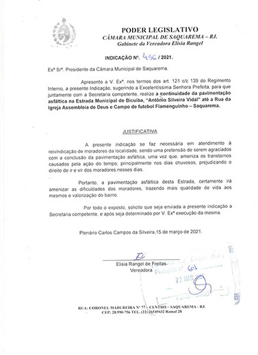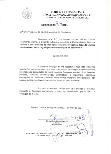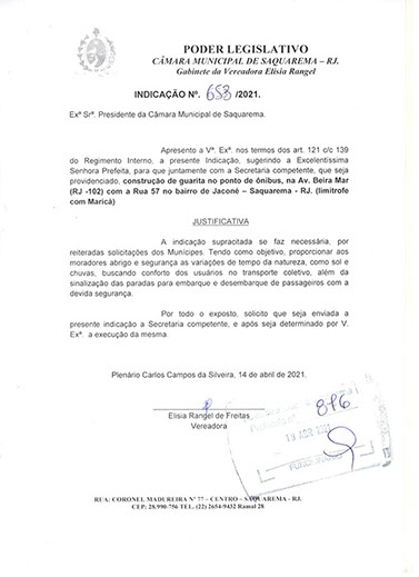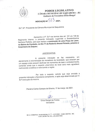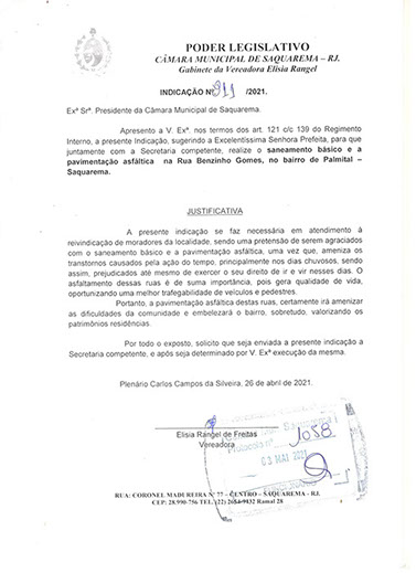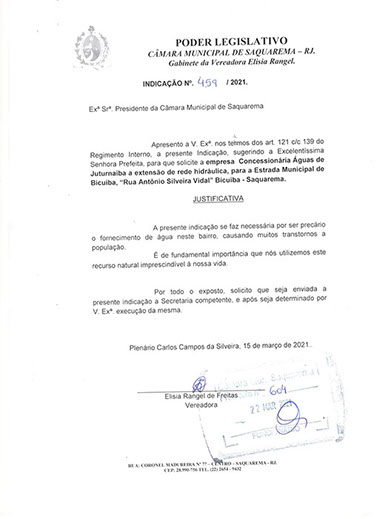 Estão presentes aqui indicações apresentadas por iniciativa de Elisia Rangel durante o seu mandato vigente como Vereadora do Município de Saquarema, na Região dos Lagos do estado do Rio de Janeiro.