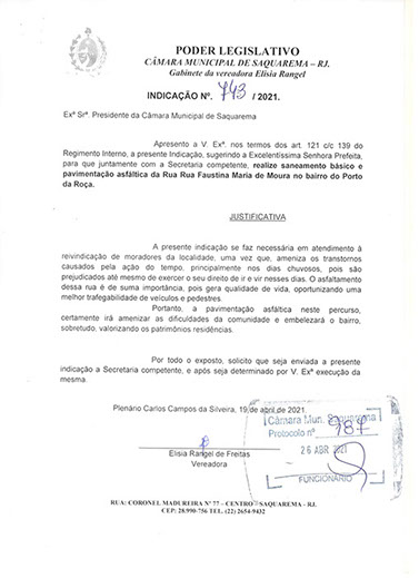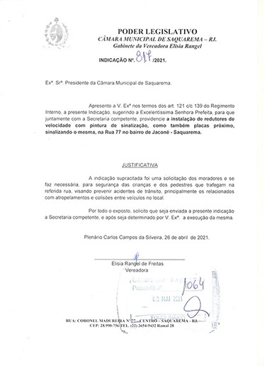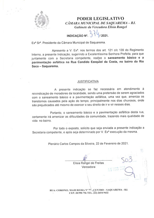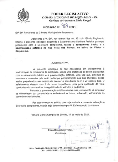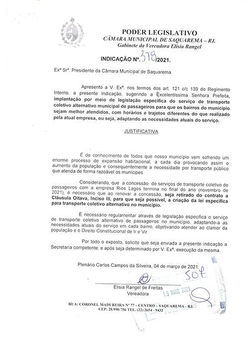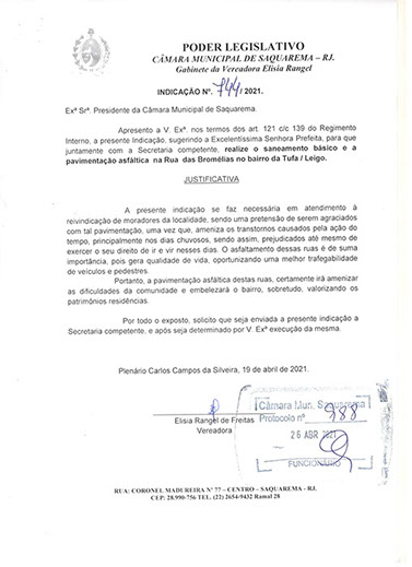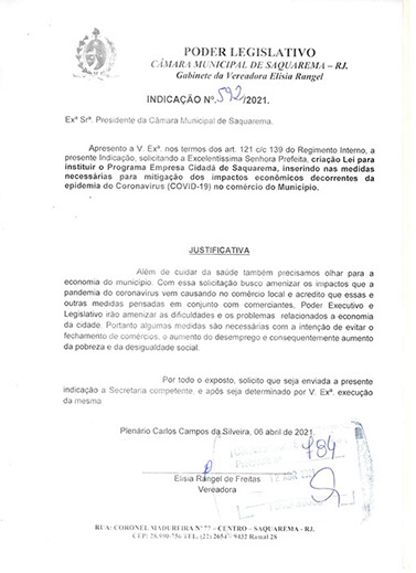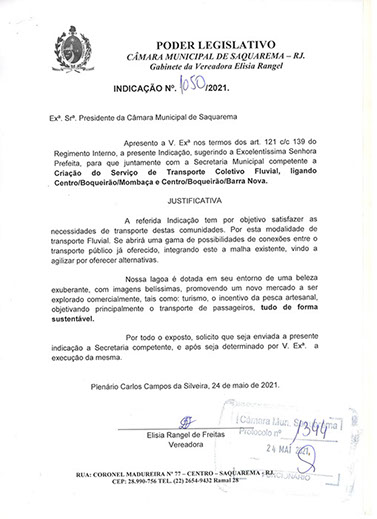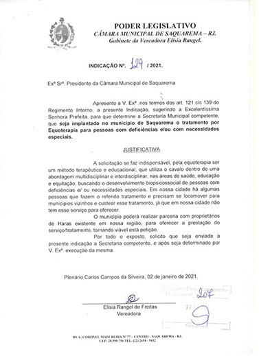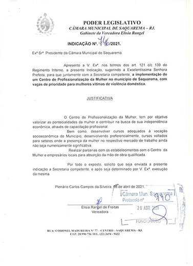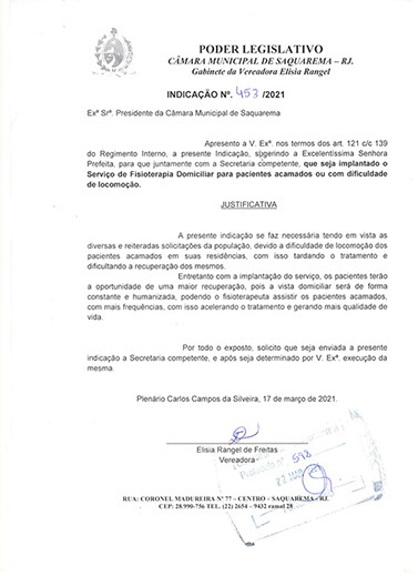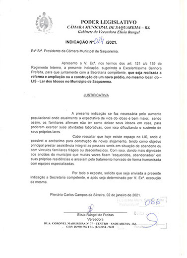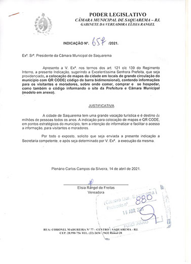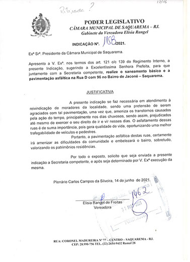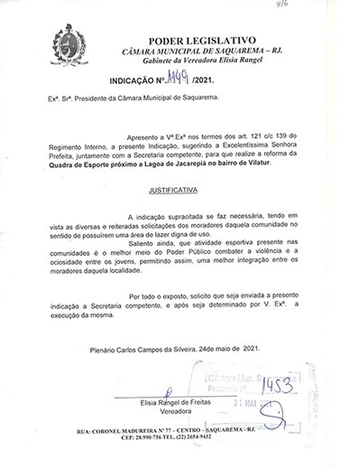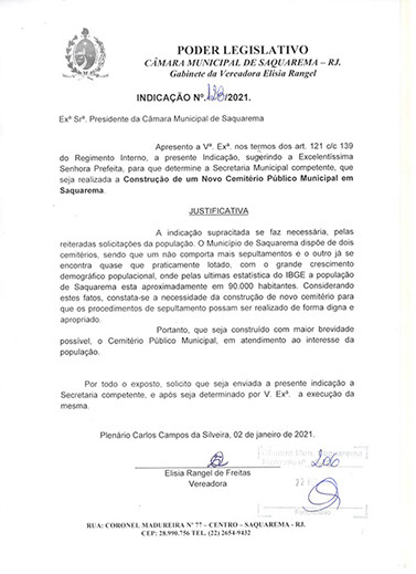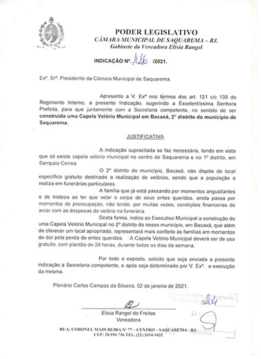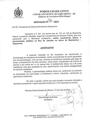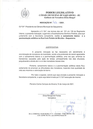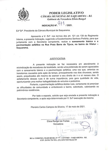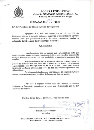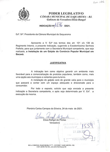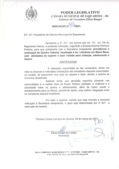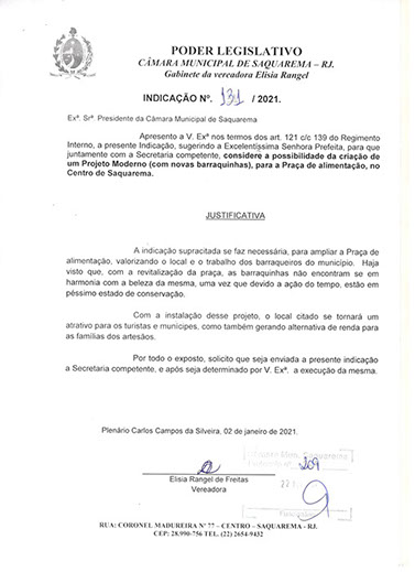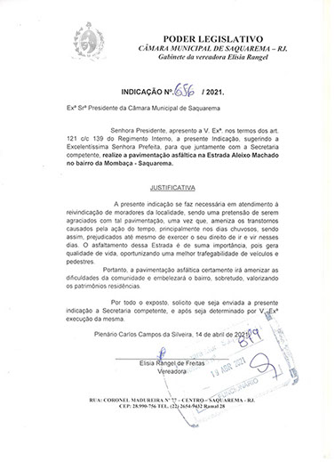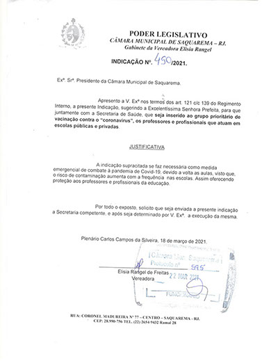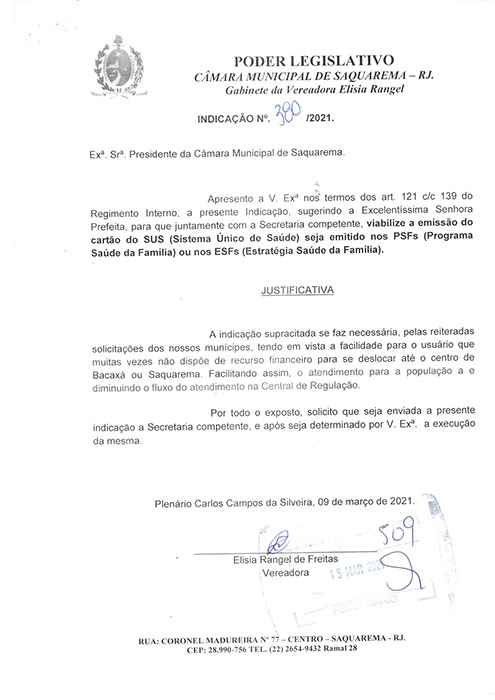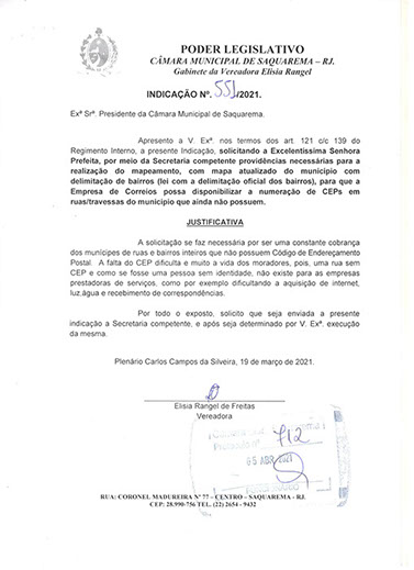 Estão presentes aqui indicações apresentadas por iniciativa de Elisia Rangel durante o seu mandato vigente como Vereadora do Município de Saquarema, na Região dos Lagos do estado do Rio de Janeiro.