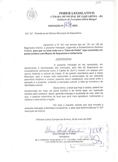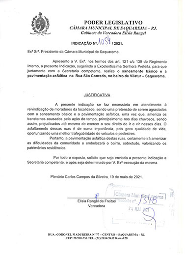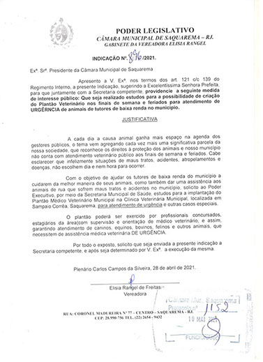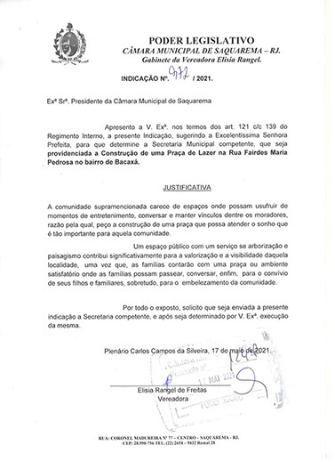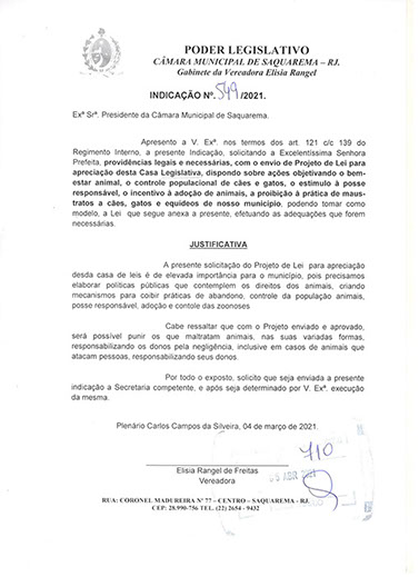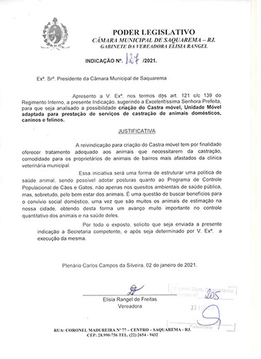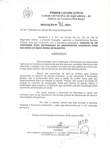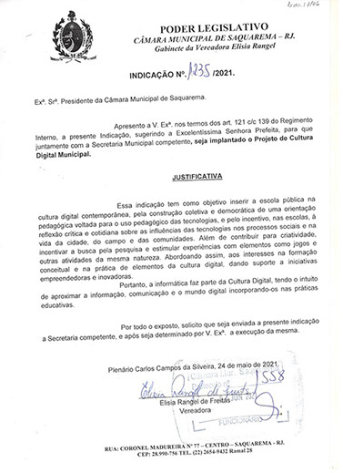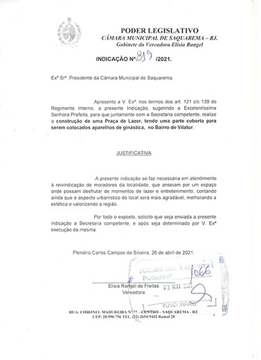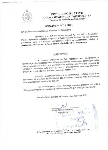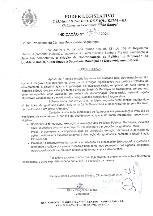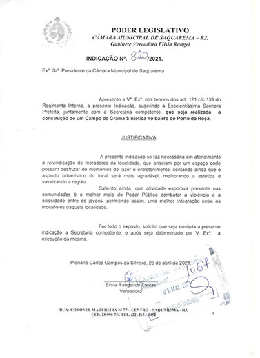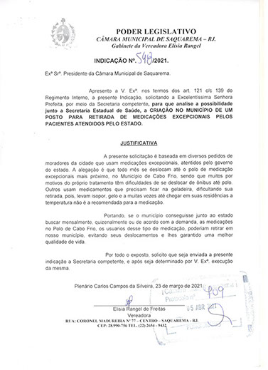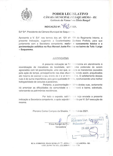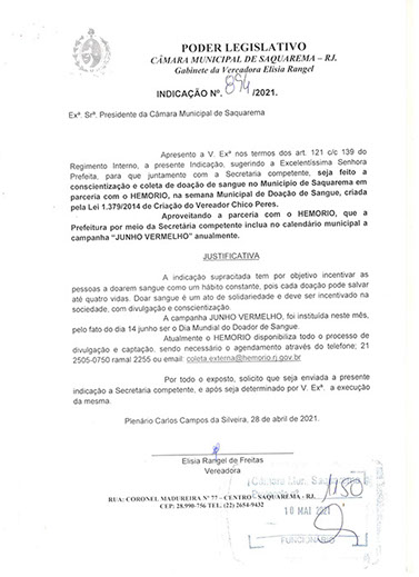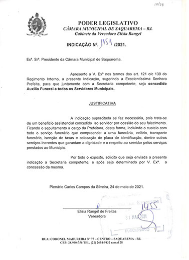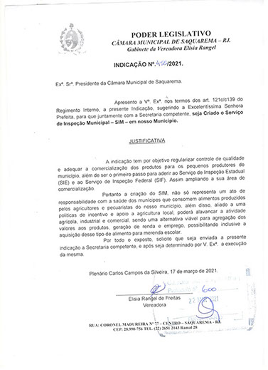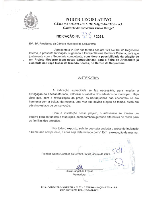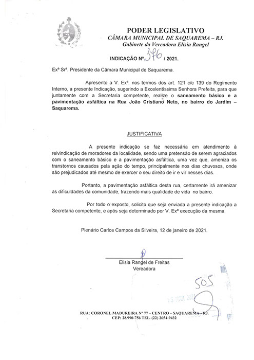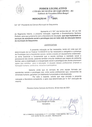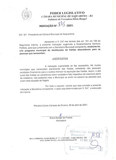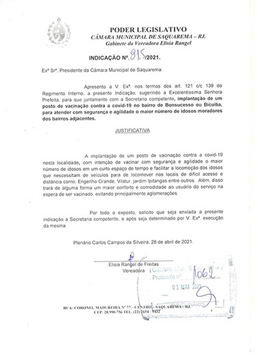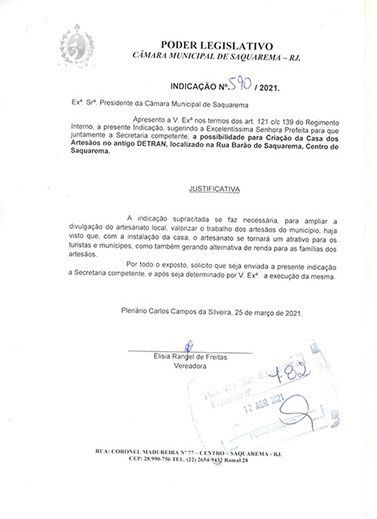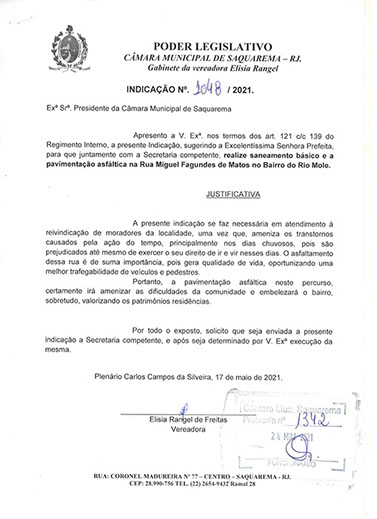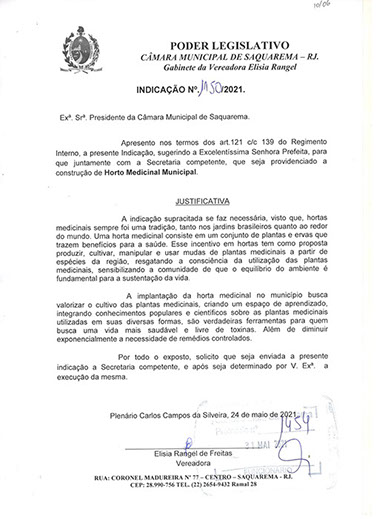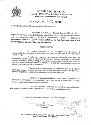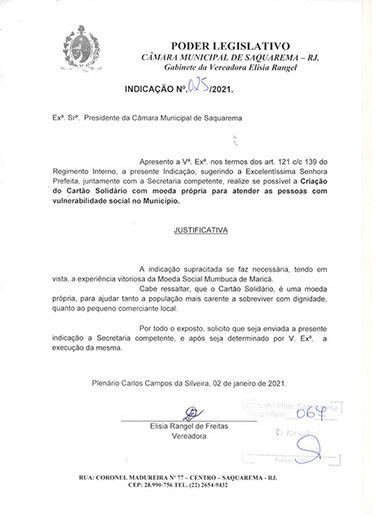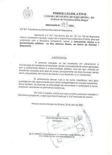 Estão presentes aqui indicações apresentadas por iniciativa de Elisia Rangel durante o seu mandato vigente como Vereadora do Município de Saquarema, na Região dos Lagos do estado do Rio de Janeiro.