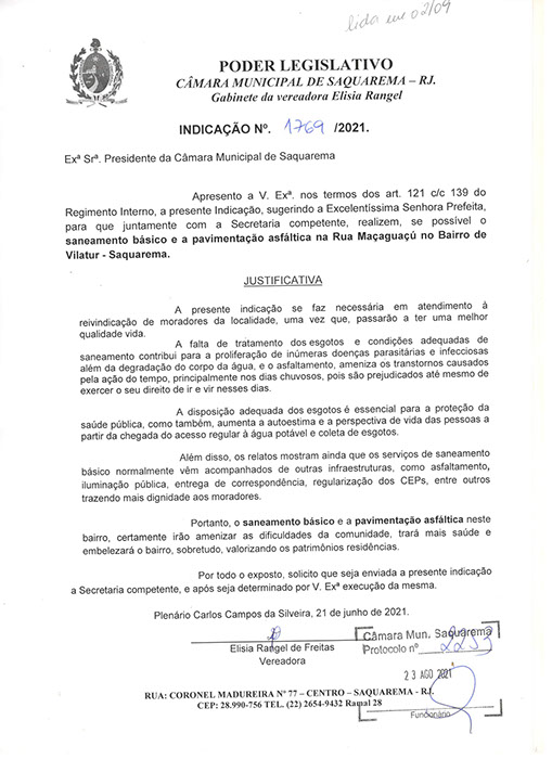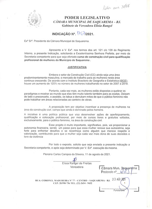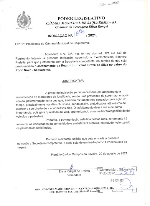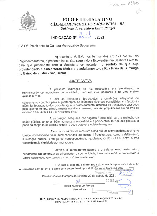 Estão presentes aqui indicações apresentadas por iniciativa de Elisia Rangel durante o seu mandato vigente como Vereadora do Município de Saquarema, na Região dos Lagos do estado do Rio de Janeiro.