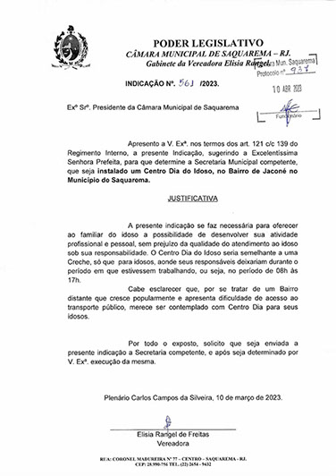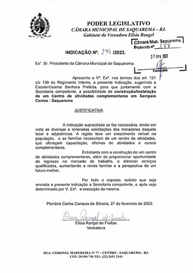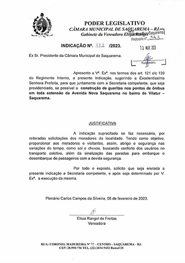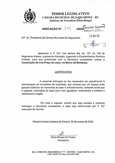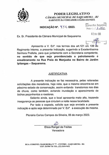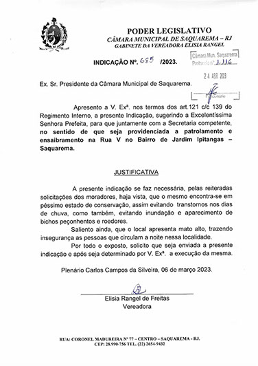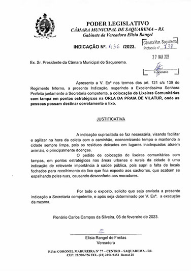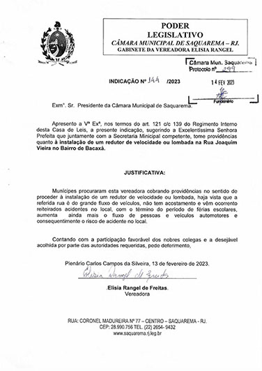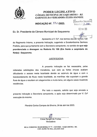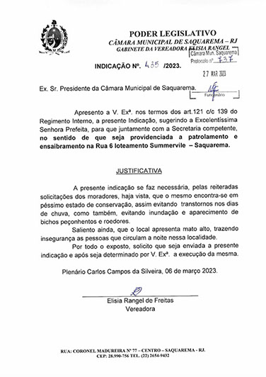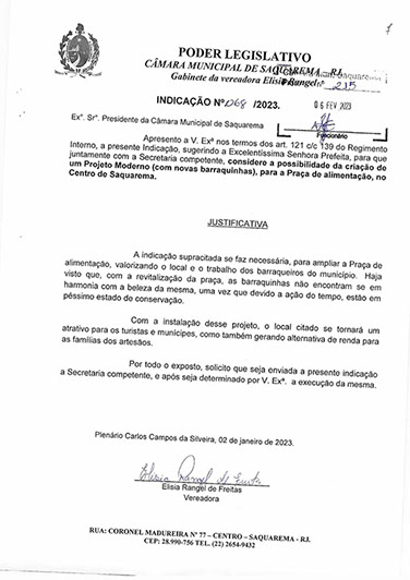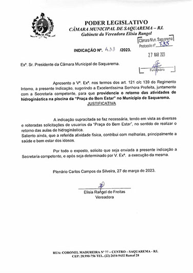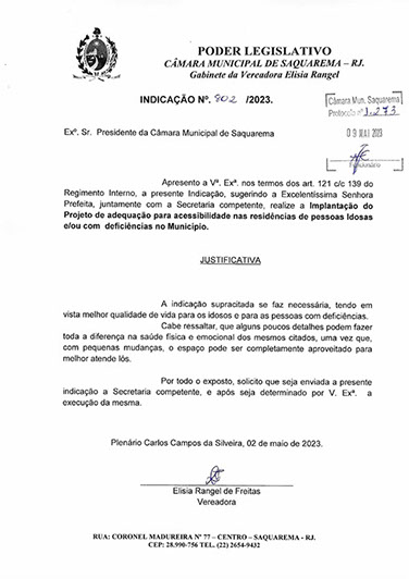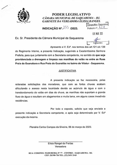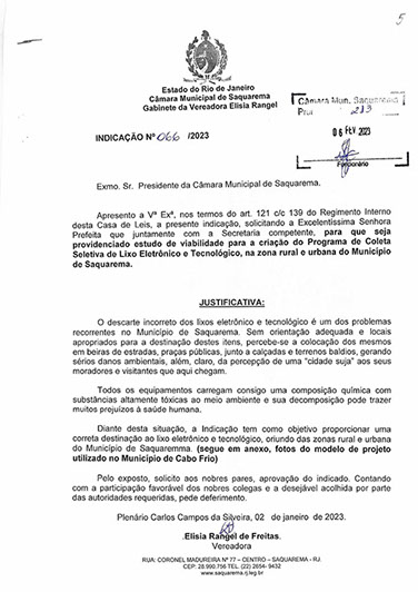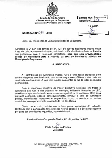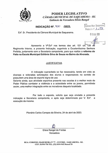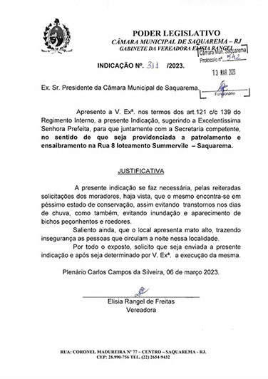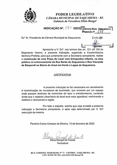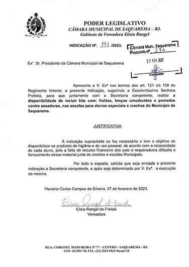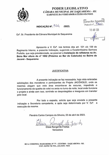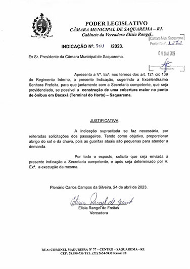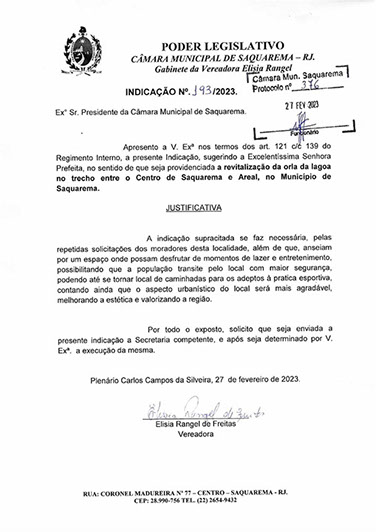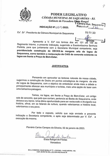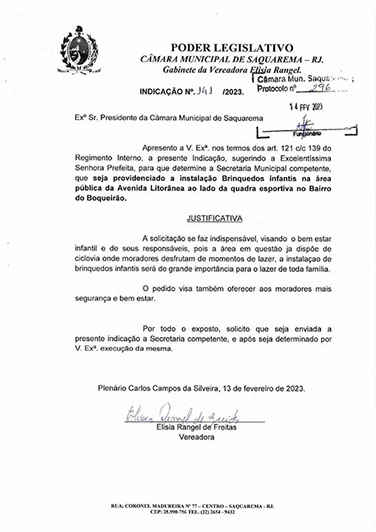 Estão presentes aqui indicações apresentadas por iniciativa de Elisia Rangel durante o seu mandato vigente como Vereadora do Município de Saquarema, na Região dos Lagos do estado do Rio de Janeiro.