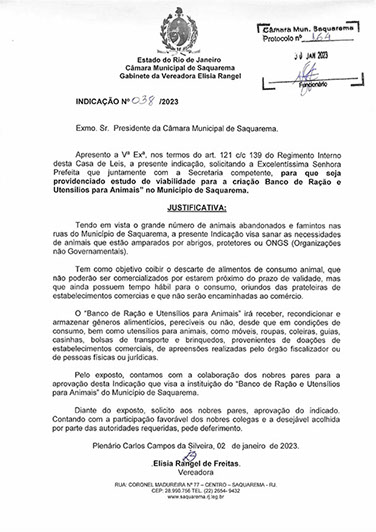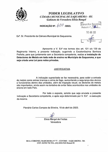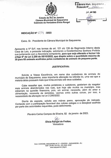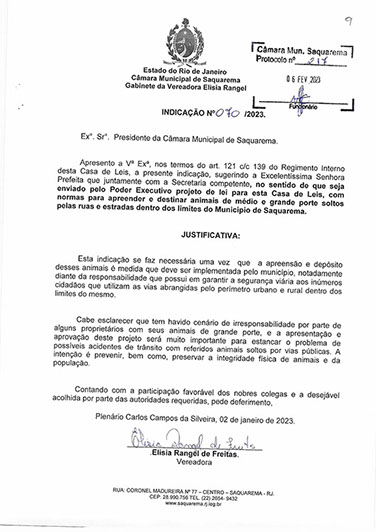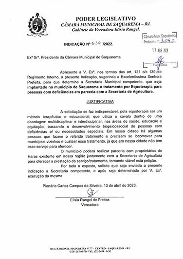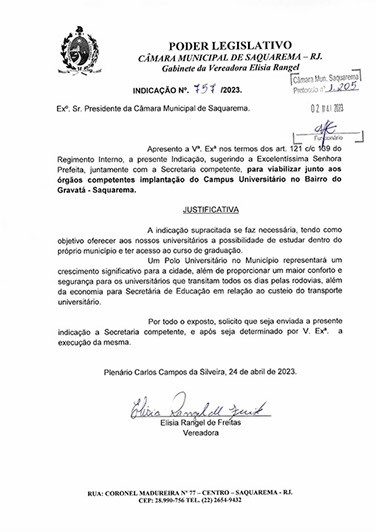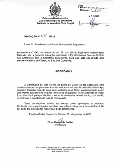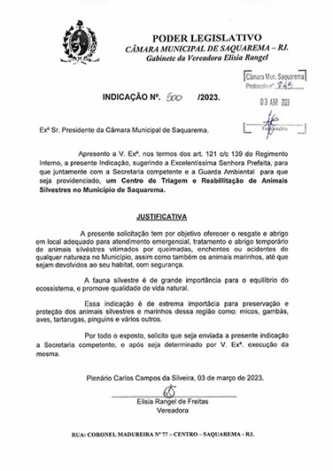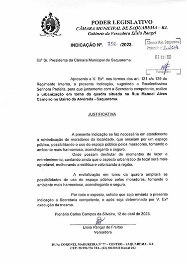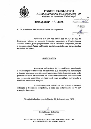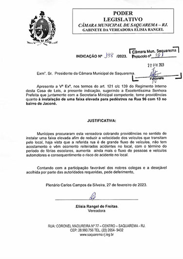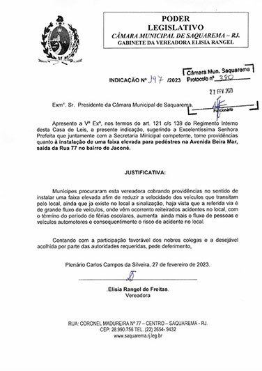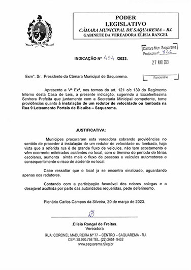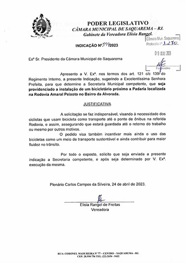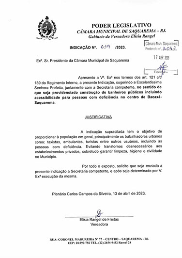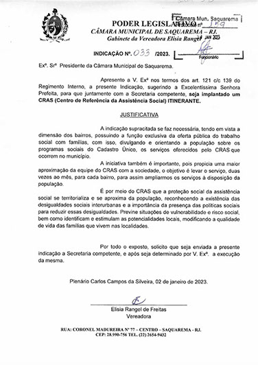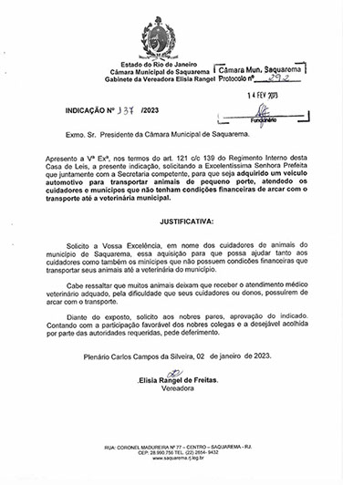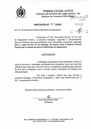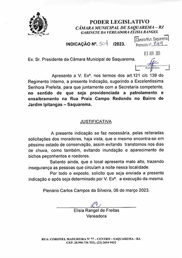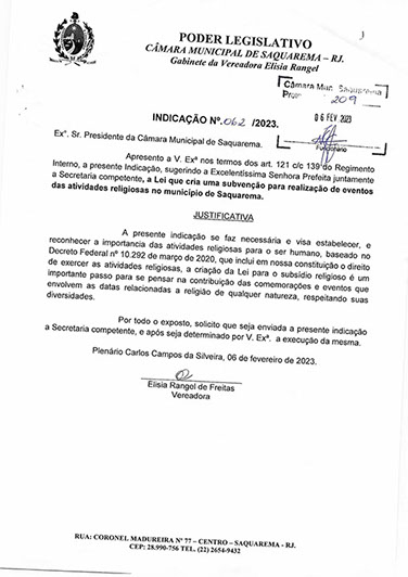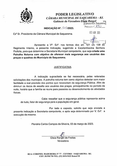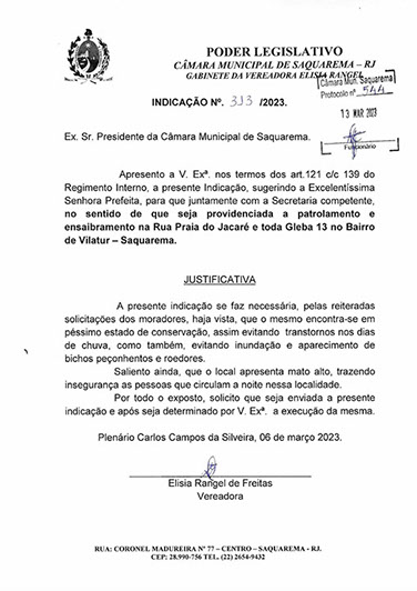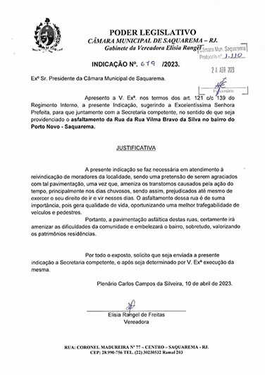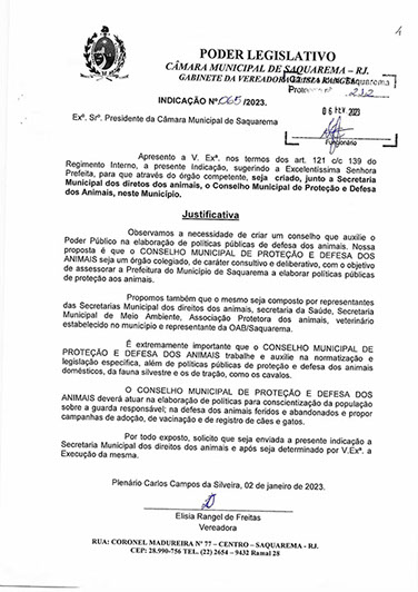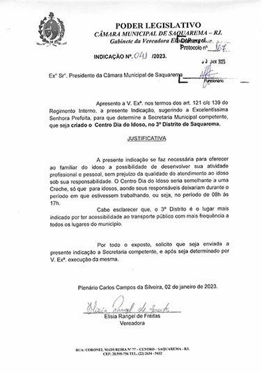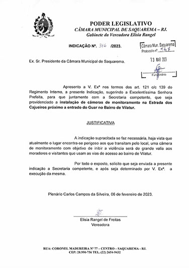 Estão presentes aqui indicações apresentadas por iniciativa de Elisia Rangel durante o seu mandato vigente como Vereadora do Município de Saquarema, na Região dos Lagos do estado do Rio de Janeiro.