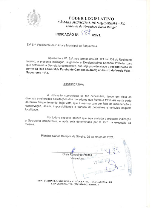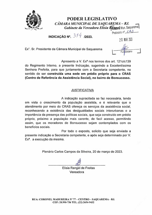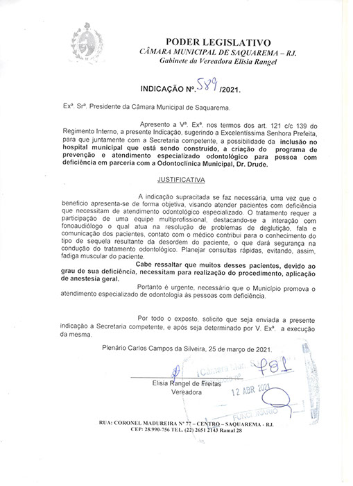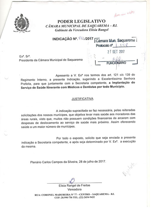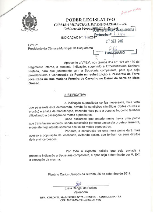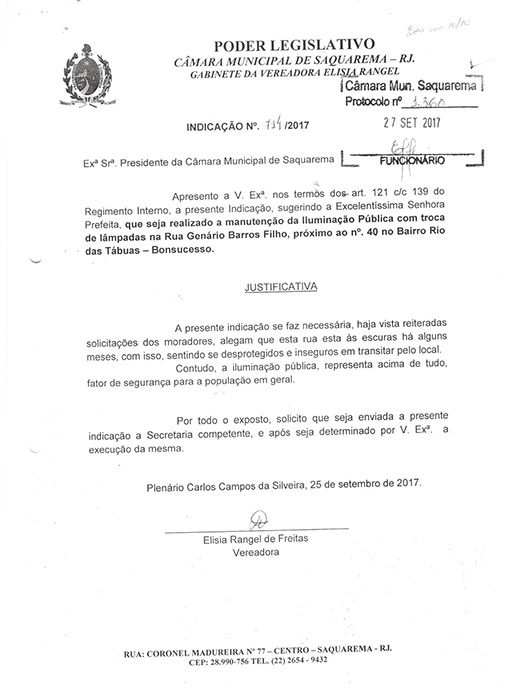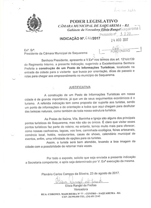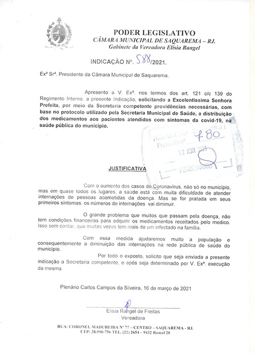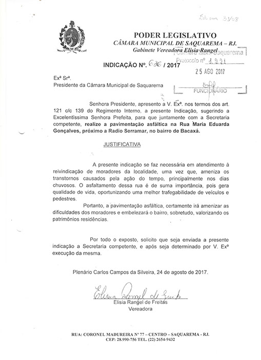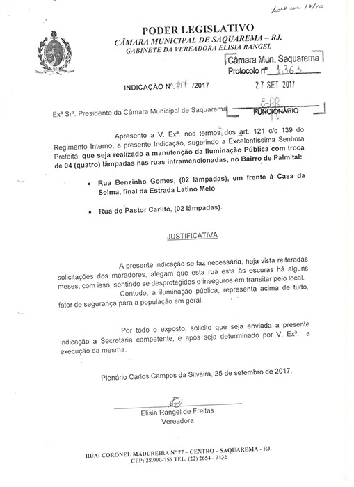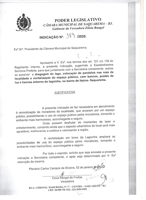 Estão presentes aqui indicações apresentadas por iniciativa de Elisia Rangel durante o seu mandato vigente como Vereadora do Município de Saquarema, na Região dos Lagos do estado do Rio de Janeiro.