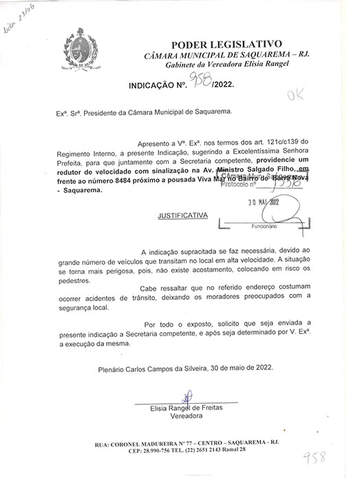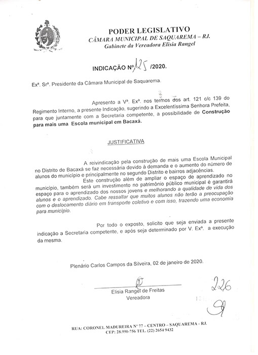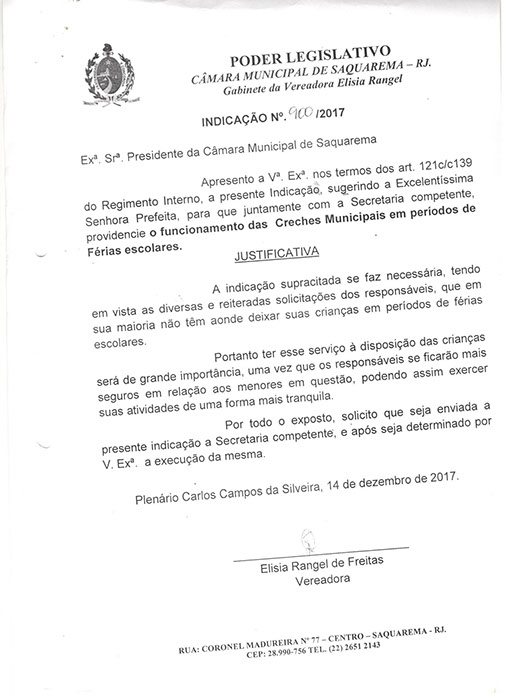 Estão presentes aqui indicações apresentadas por iniciativa de Elisia Rangel durante o seu mandato vigente como Vereadora do Município de Saquarema, na Região dos Lagos do estado do Rio de Janeiro.