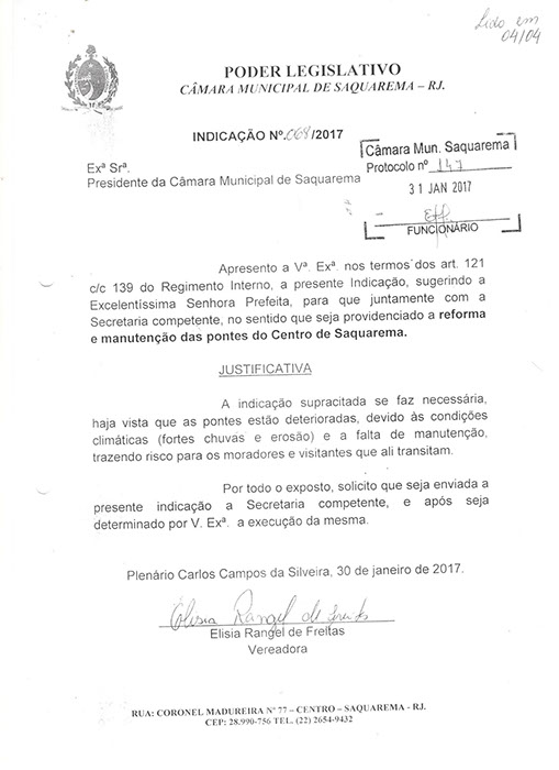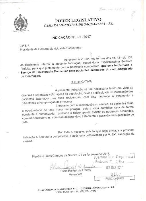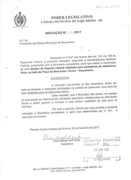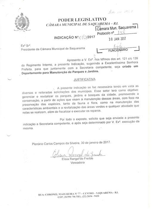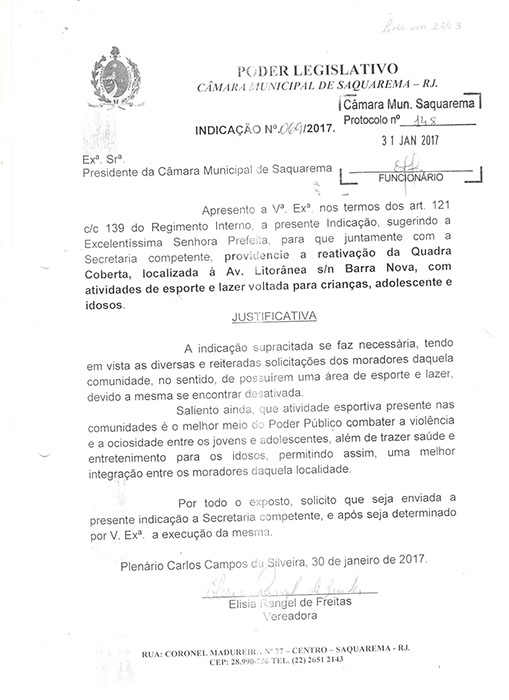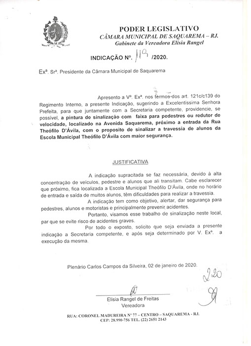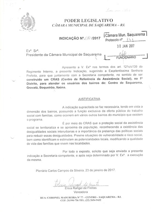 Estão presentes aqui indicações apresentadas por iniciativa de Elisia Rangel durante o seu mandato vigente como Vereadora do Município de Saquarema, na Região dos Lagos do estado do Rio de Janeiro.