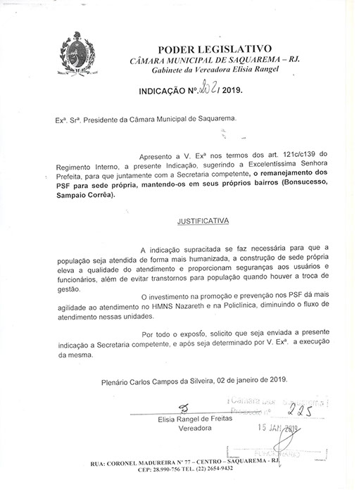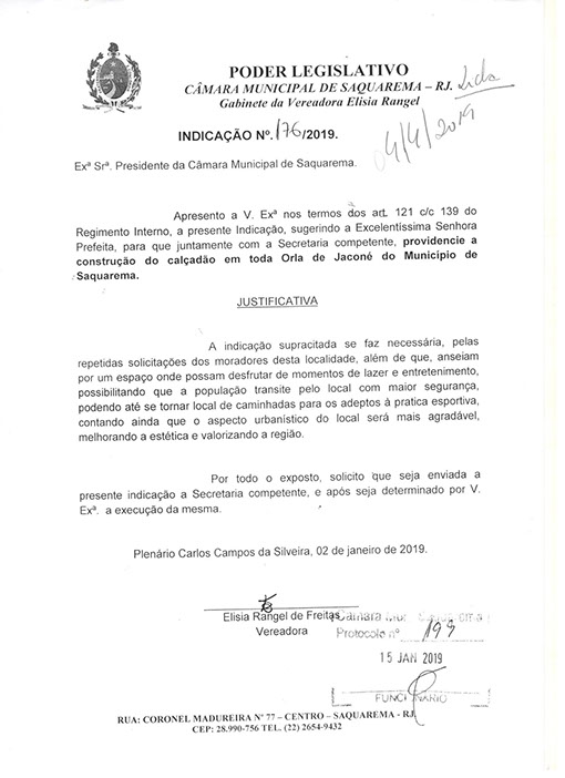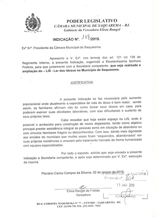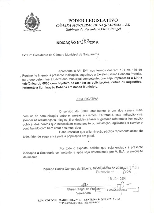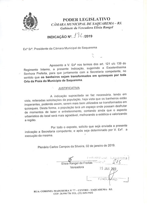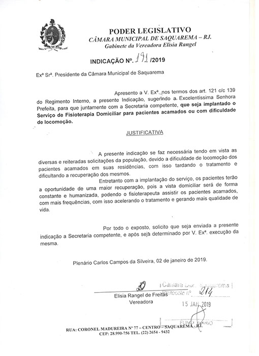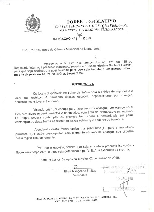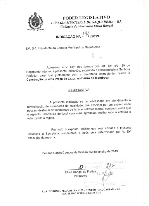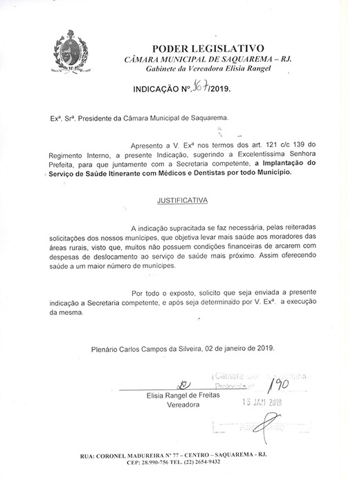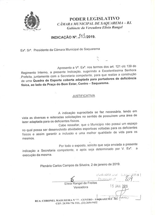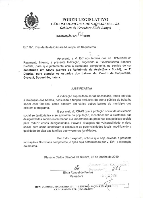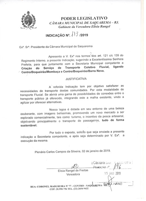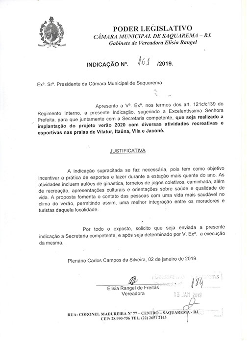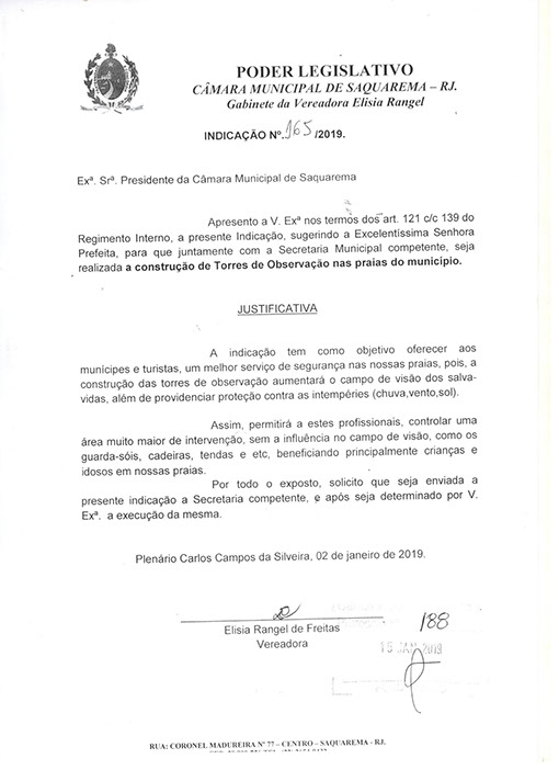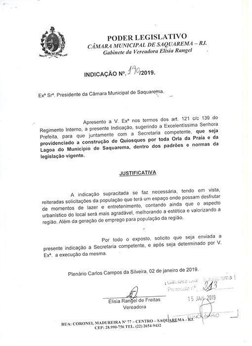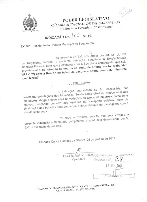 Estão presentes aqui indicações apresentadas por iniciativa de Elisia Rangel durante o seu mandato vigente como Vereadora do Município de Saquarema, na Região dos Lagos do estado do Rio de Janeiro.