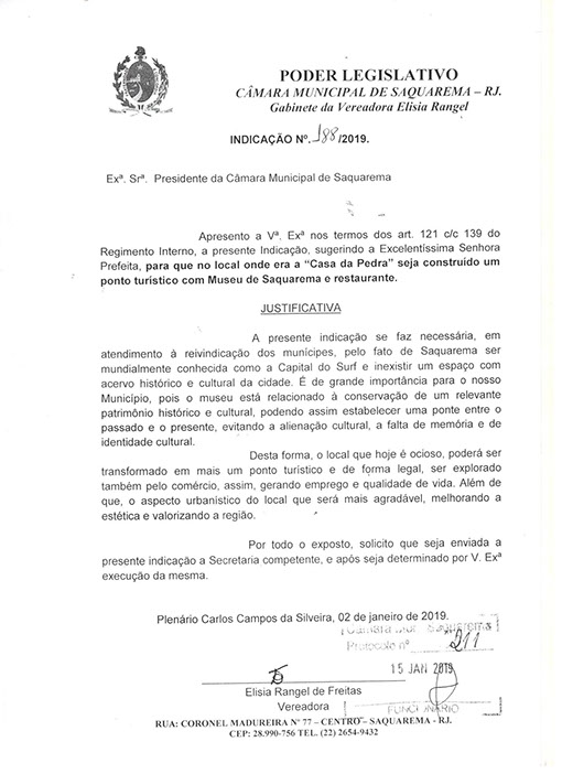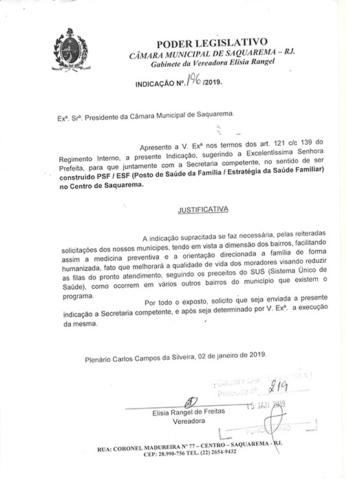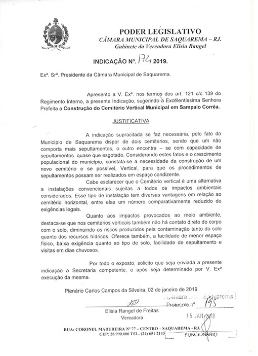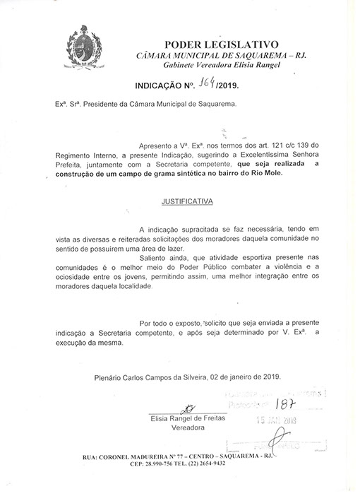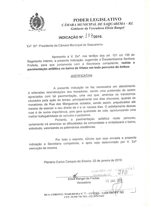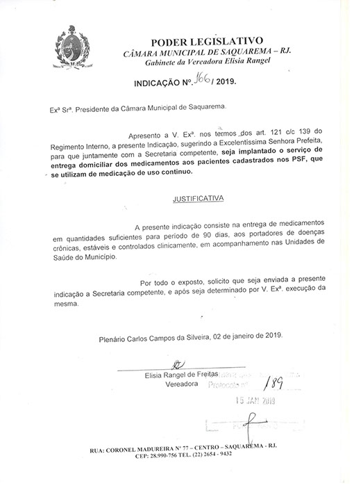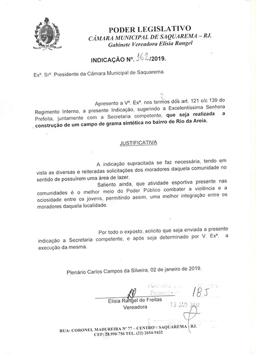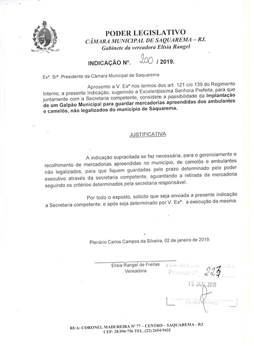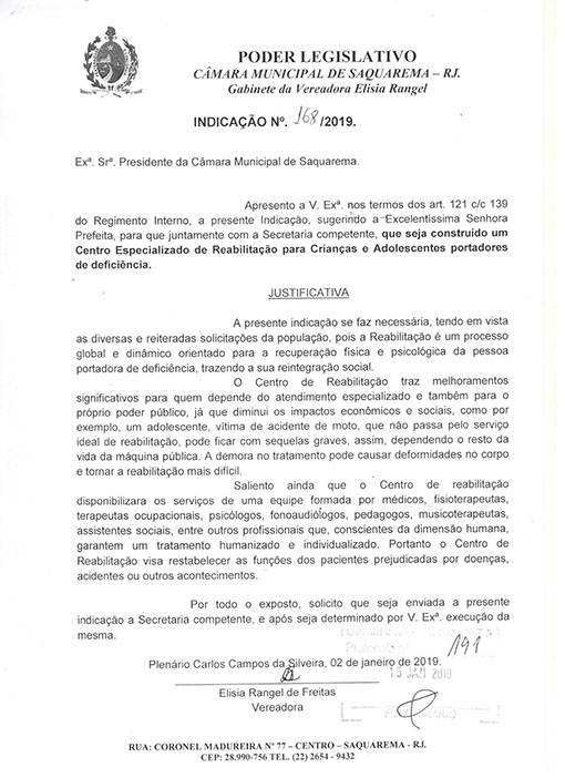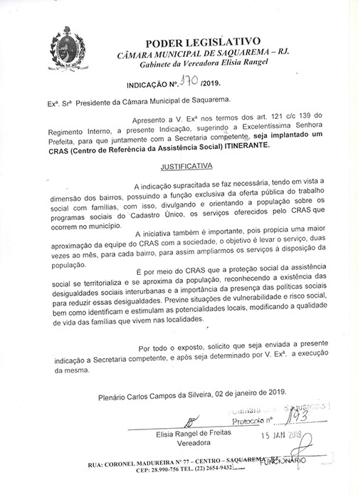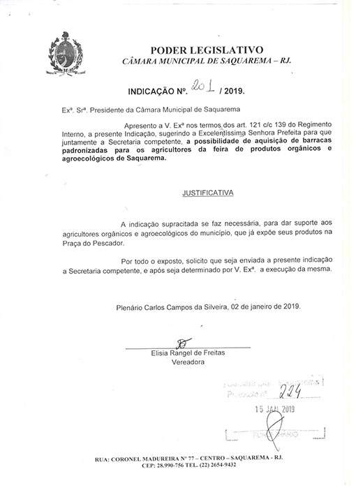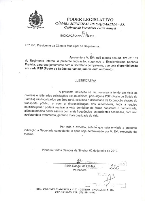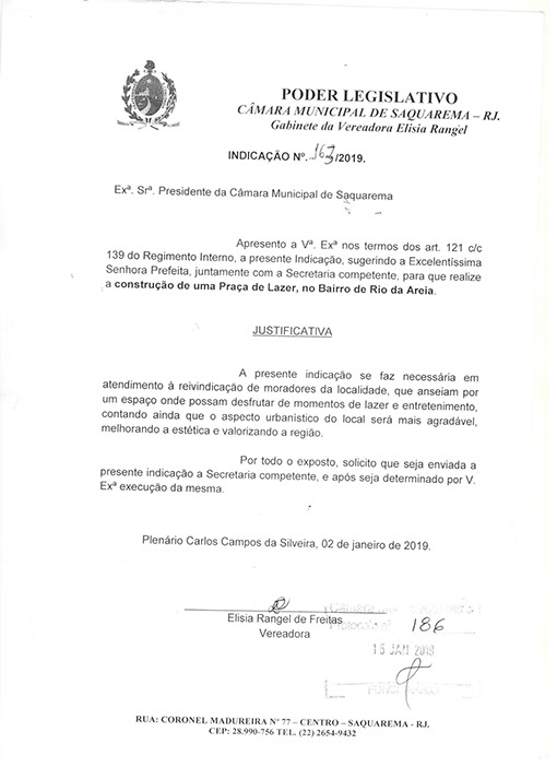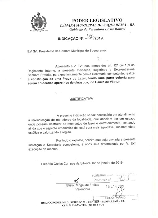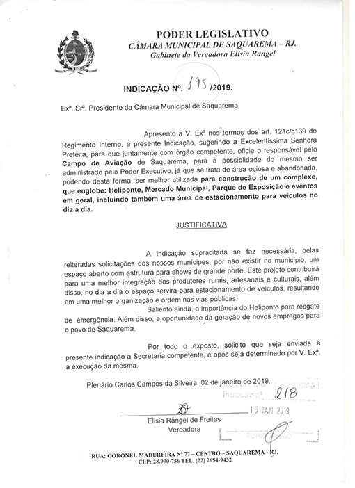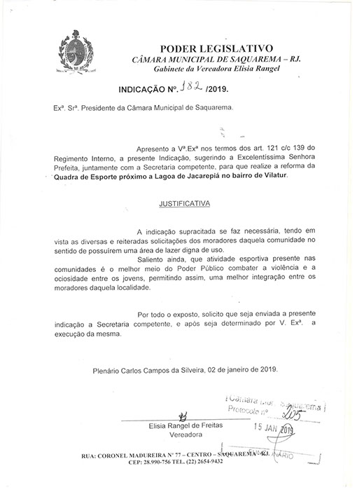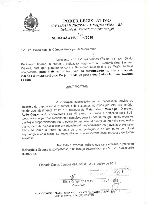 Estão presentes aqui indicações apresentadas por iniciativa de Elisia Rangel durante o seu mandato vigente como Vereadora do Município de Saquarema, na Região dos Lagos do estado do Rio de Janeiro.