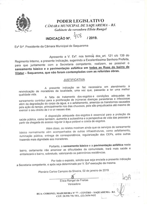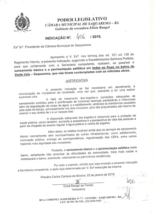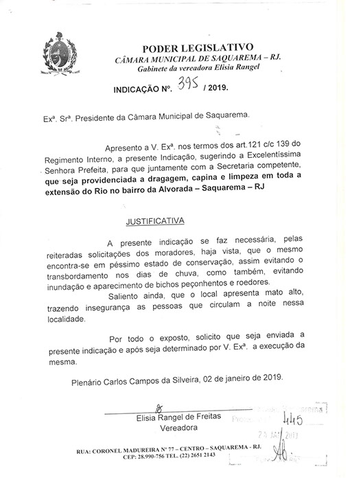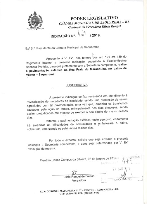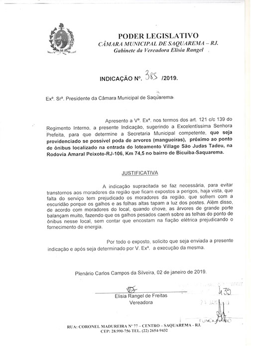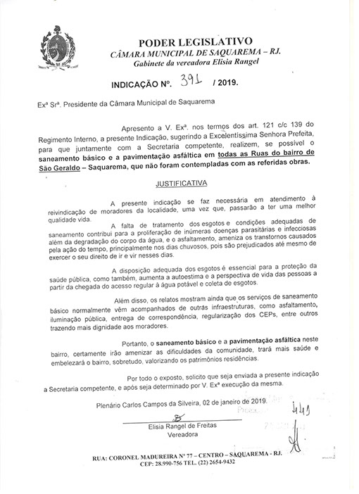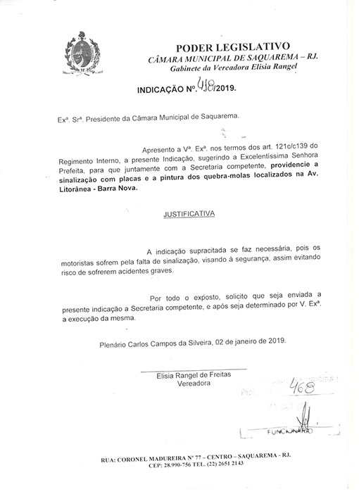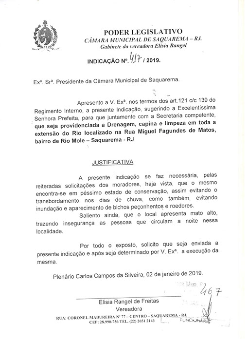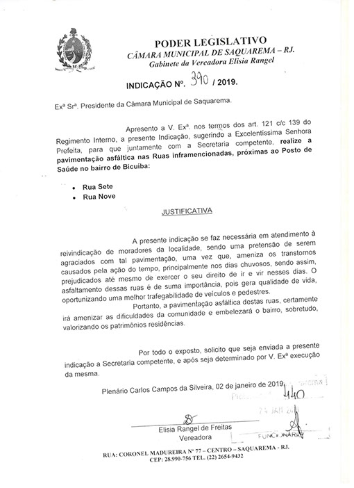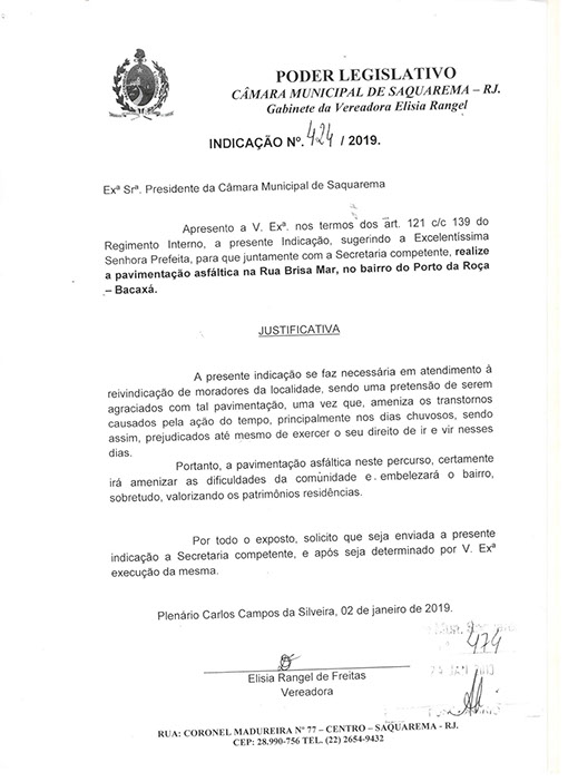 Estão presentes aqui indicações apresentadas por iniciativa de Elisia Rangel durante o seu mandato vigente como Vereadora do Município de Saquarema, na Região dos Lagos do estado do Rio de Janeiro.