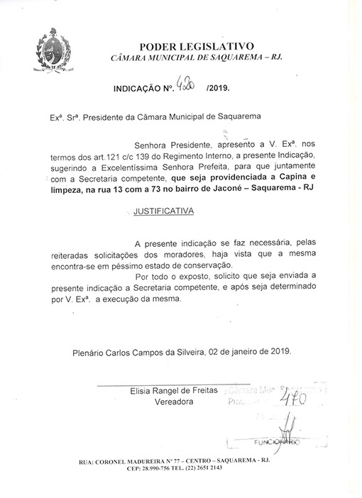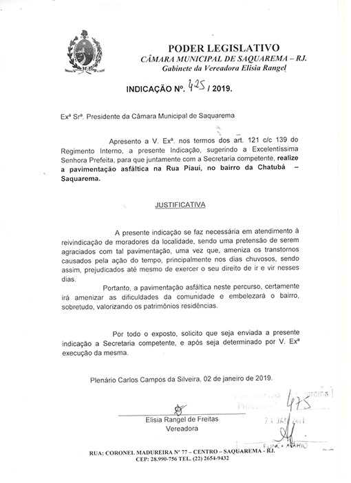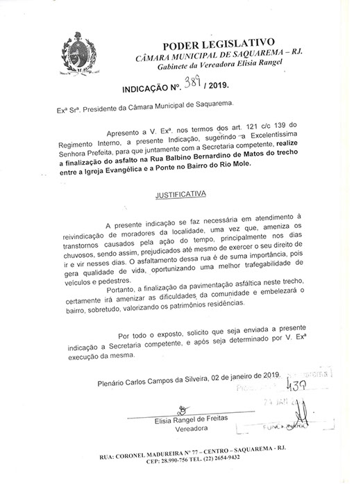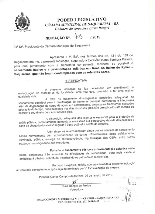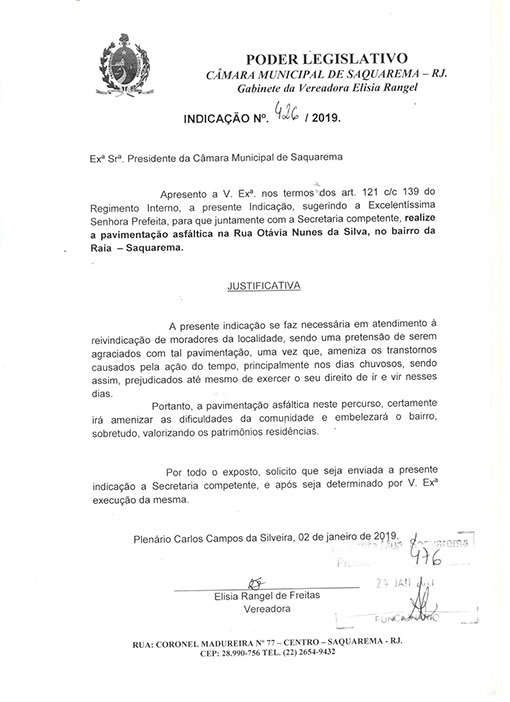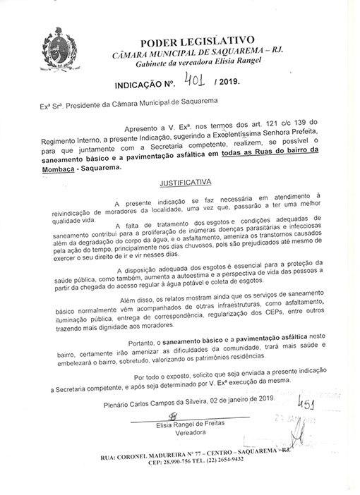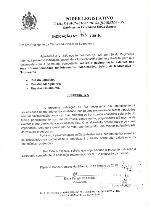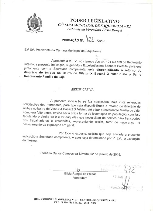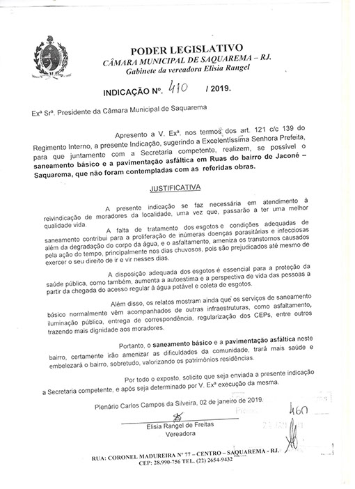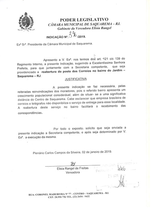 Estão presentes aqui indicações apresentadas por iniciativa de Elisia Rangel durante o seu mandato vigente como Vereadora do Município de Saquarema, na Região dos Lagos do estado do Rio de Janeiro.
