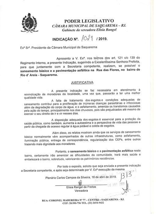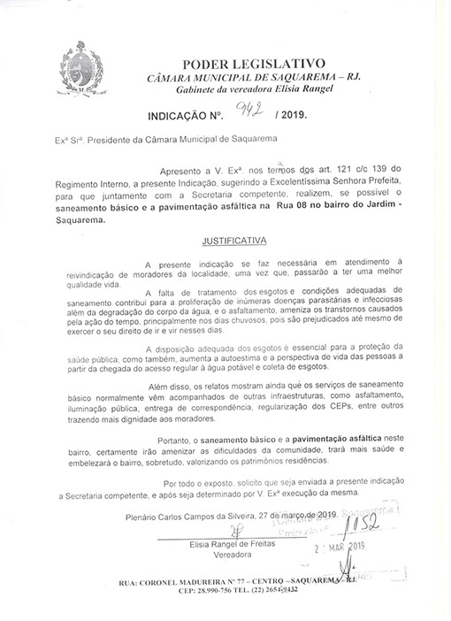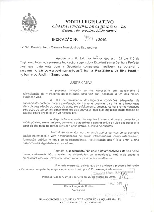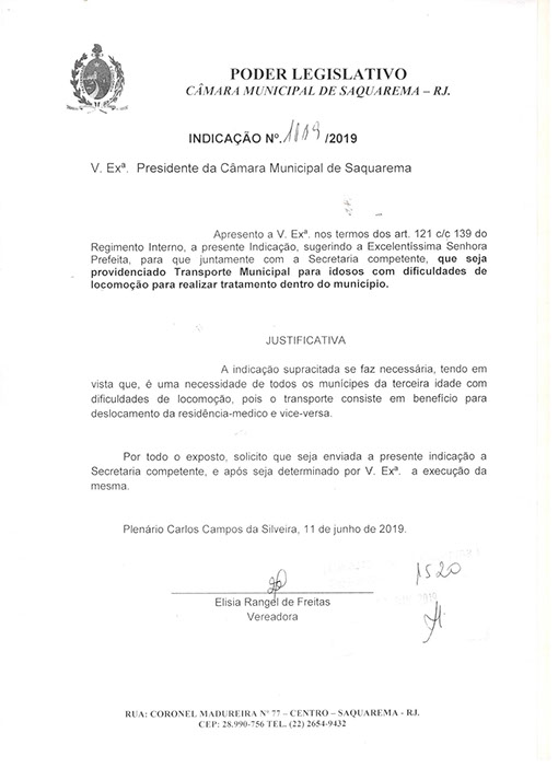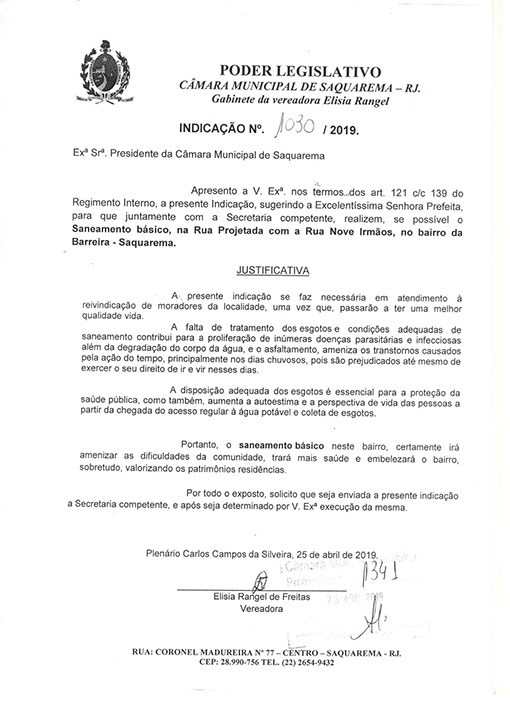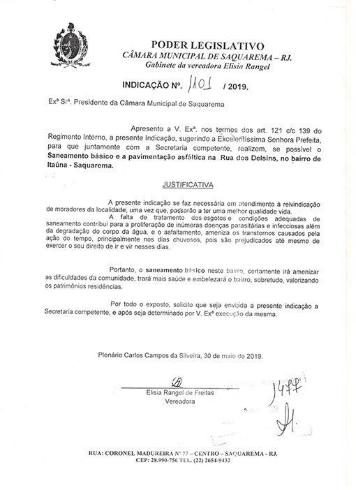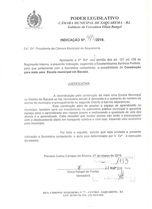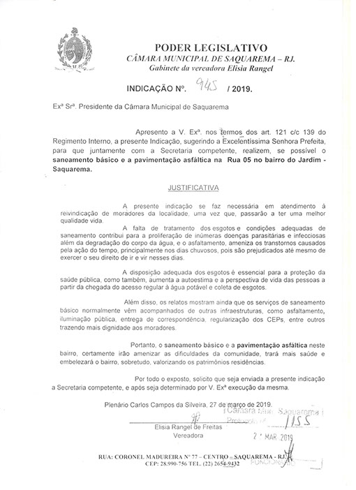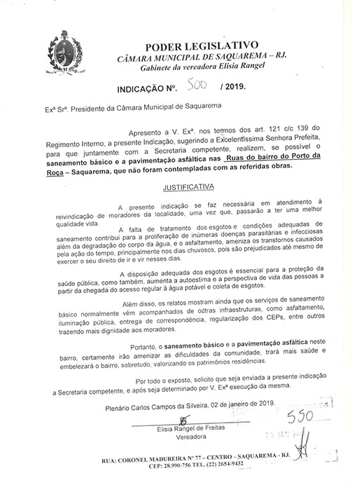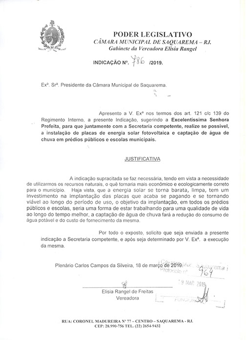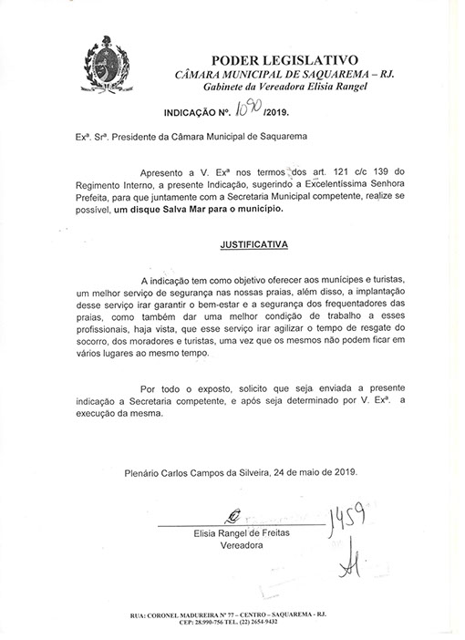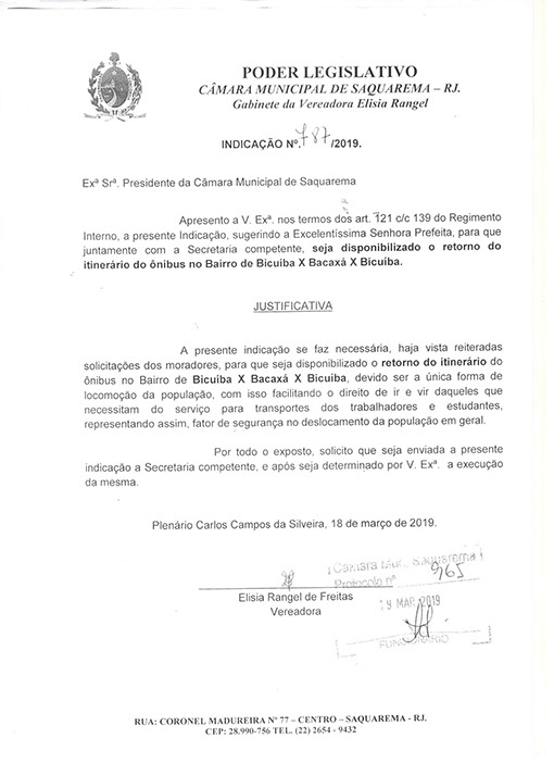 Estão presentes aqui indicações apresentadas por iniciativa de Elisia Rangel durante o seu mandato vigente como Vereadora do Município de Saquarema, na Região dos Lagos do estado do Rio de Janeiro.