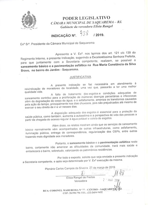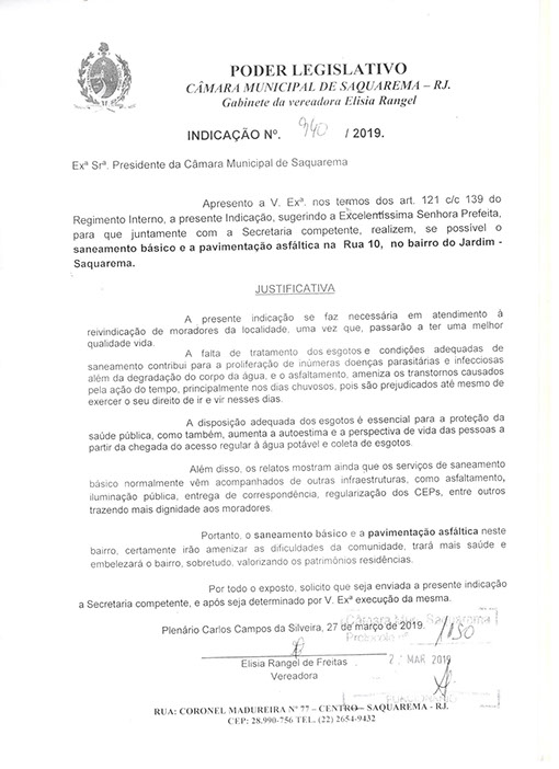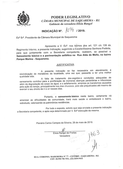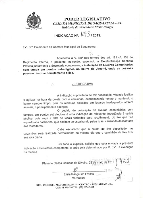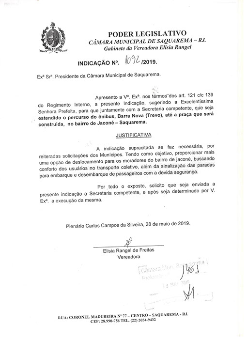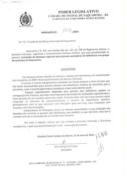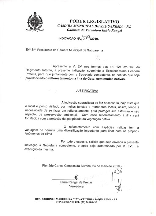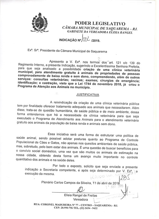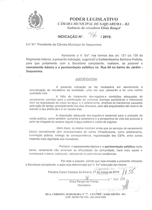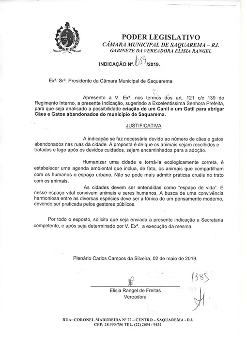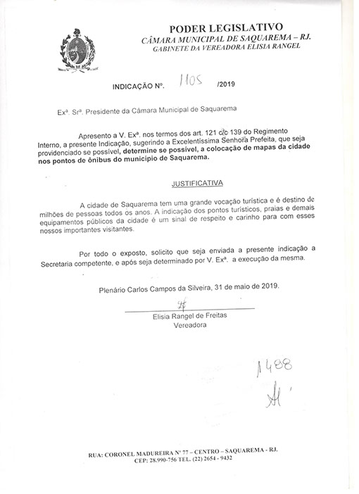 Estão presentes aqui indicações apresentadas por iniciativa de Elisia Rangel durante o seu mandato vigente como Vereadora do Município de Saquarema, na Região dos Lagos do estado do Rio de Janeiro.