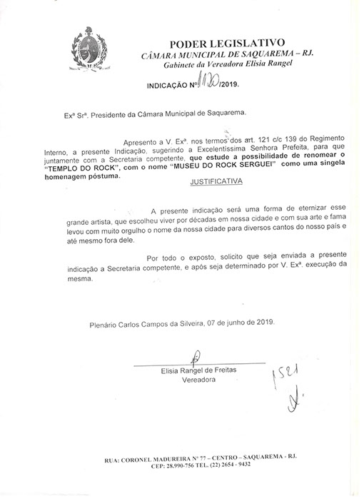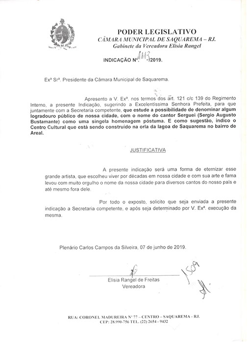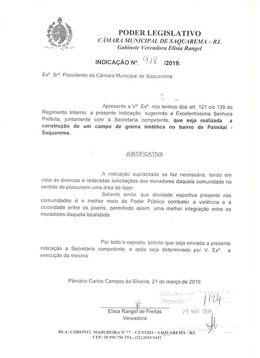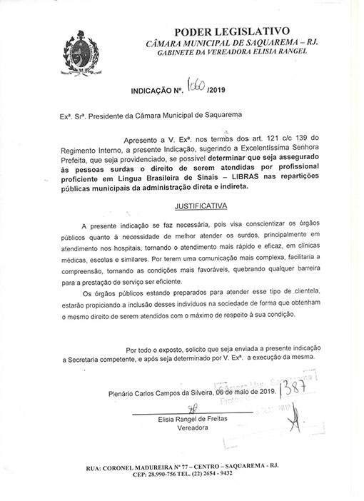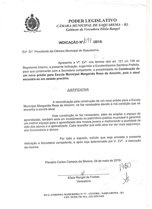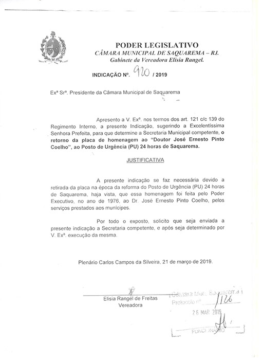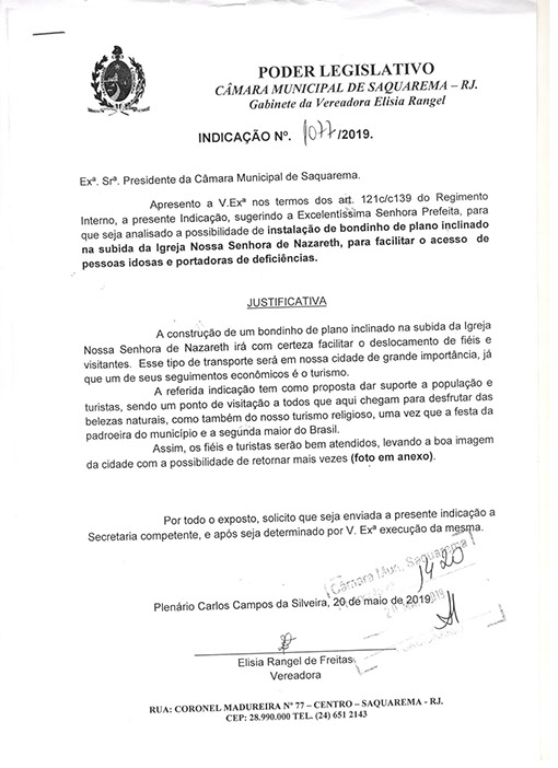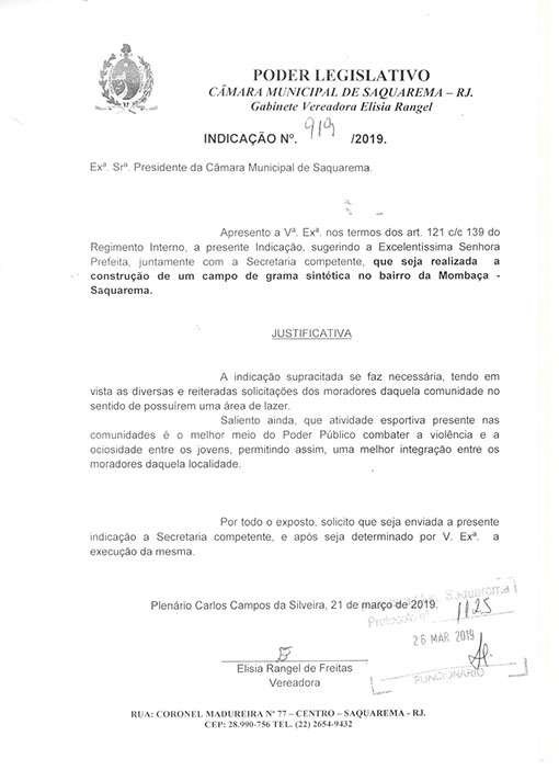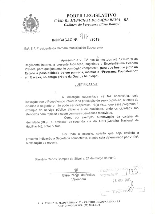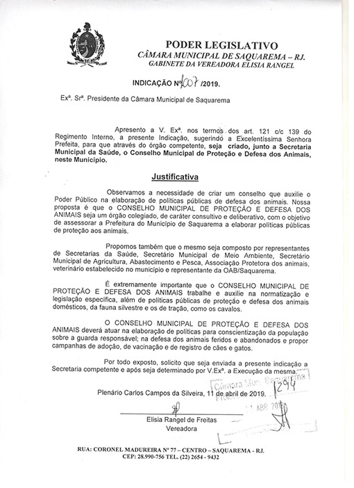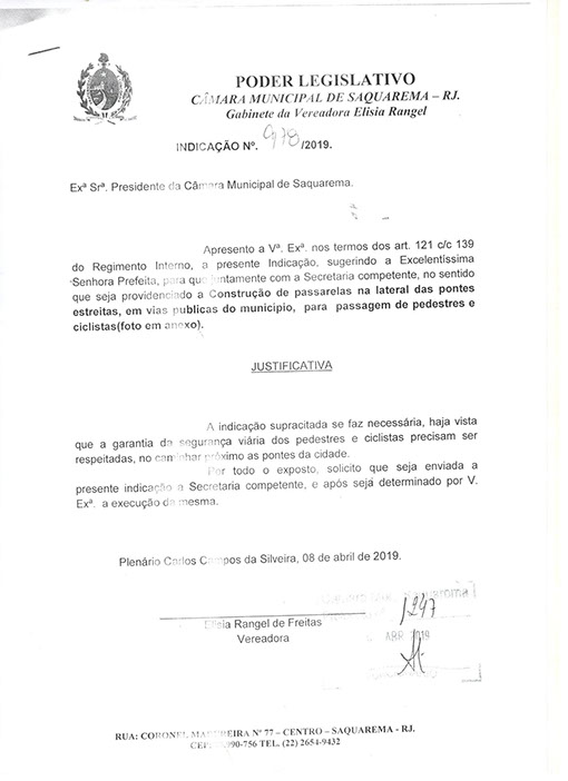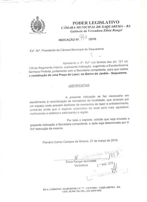 Estão presentes aqui indicações apresentadas por iniciativa de Elisia Rangel durante o seu mandato vigente como Vereadora do Município de Saquarema, na Região dos Lagos do estado do Rio de Janeiro.