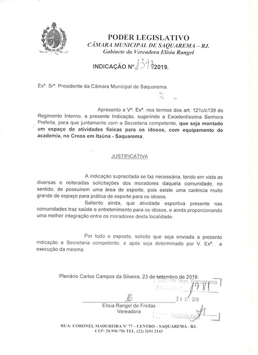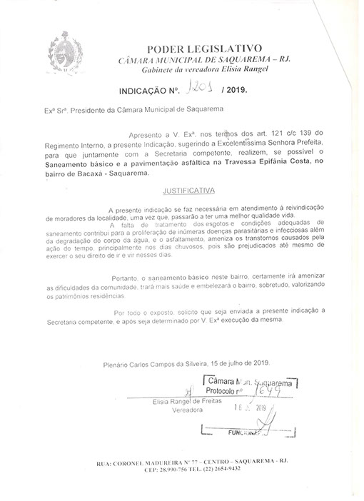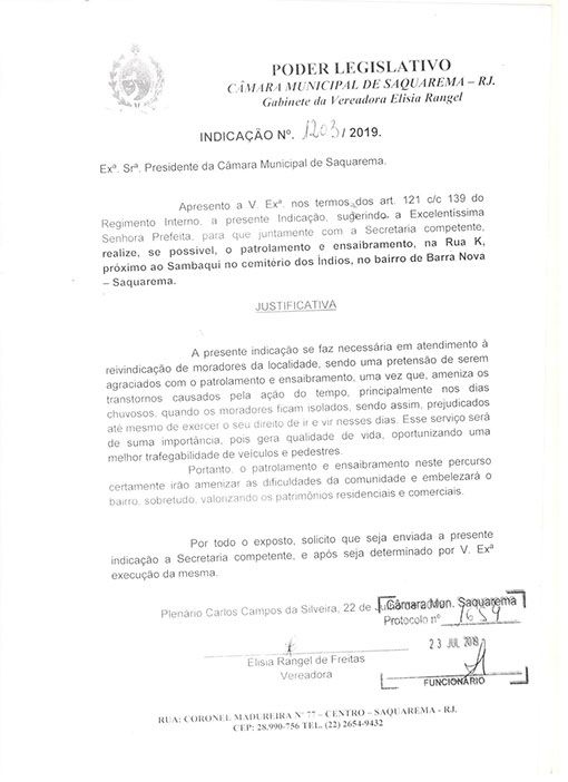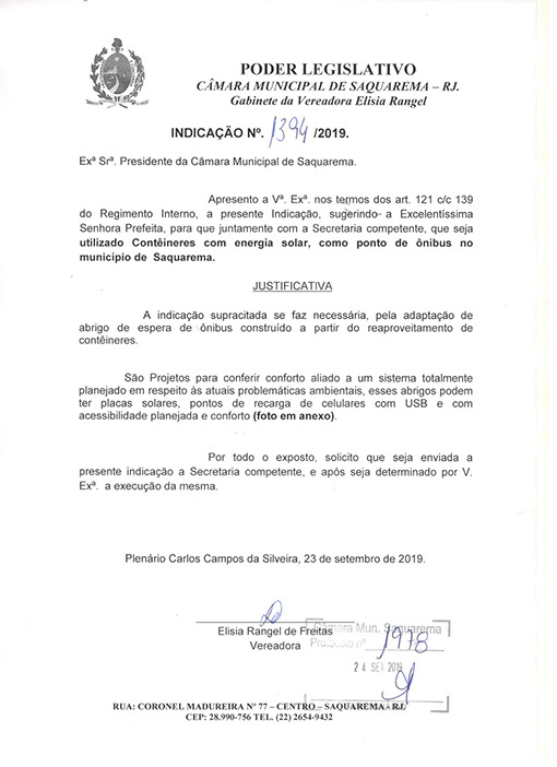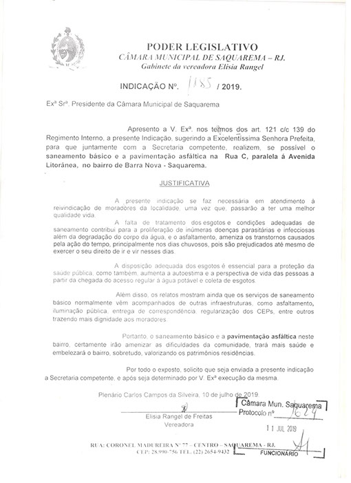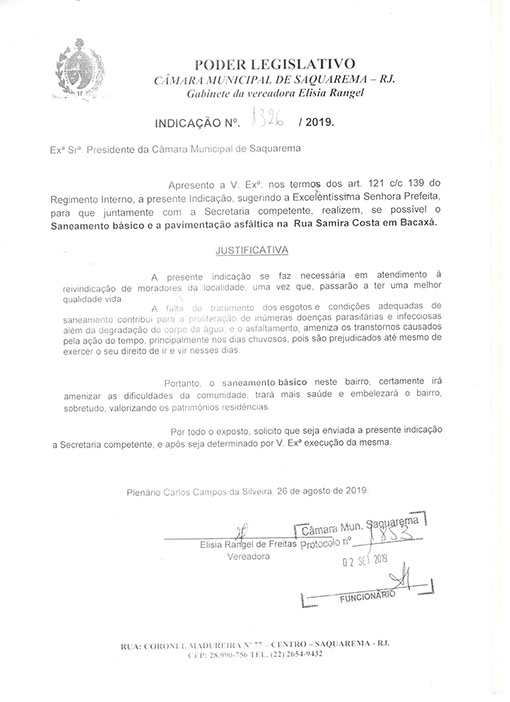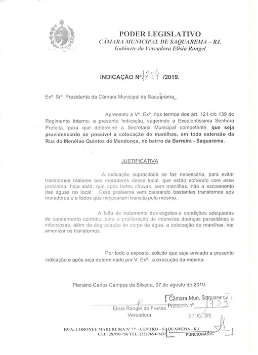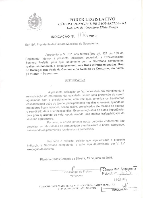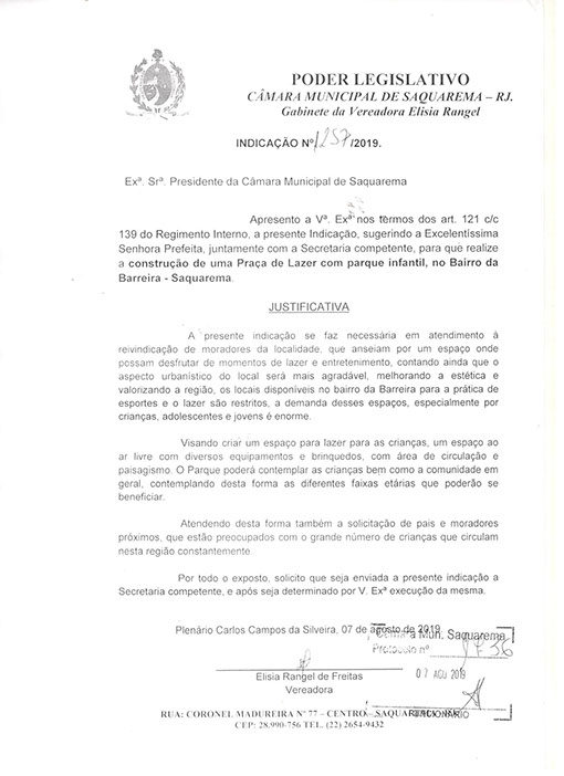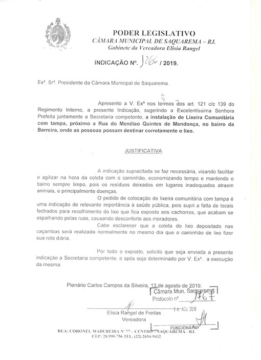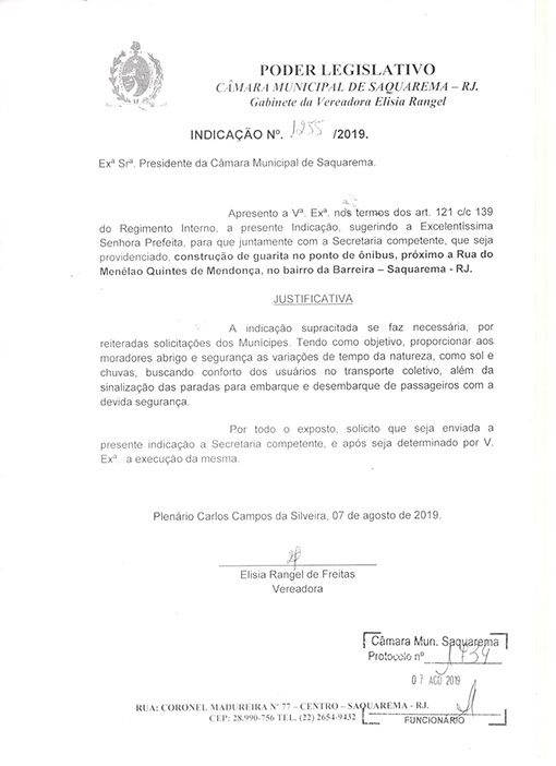 Estão presentes aqui indicações apresentadas por iniciativa de Elisia Rangel durante o seu mandato vigente como Vereadora do Município de Saquarema, na Região dos Lagos do estado do Rio de Janeiro.