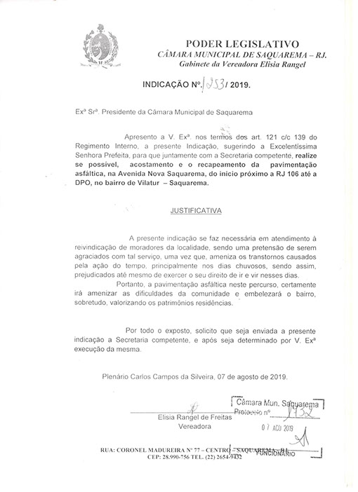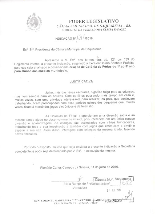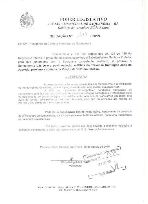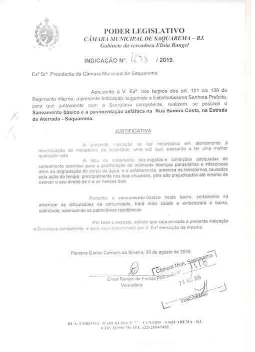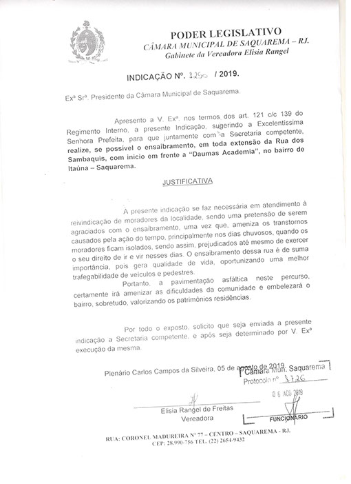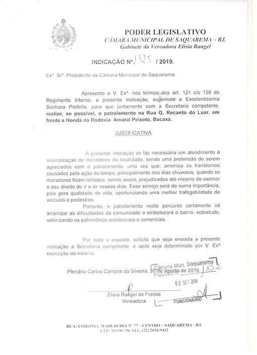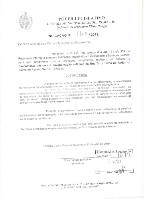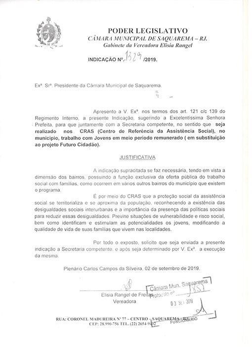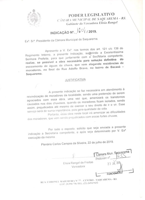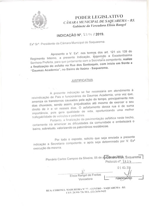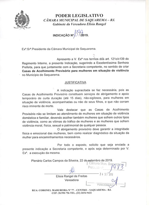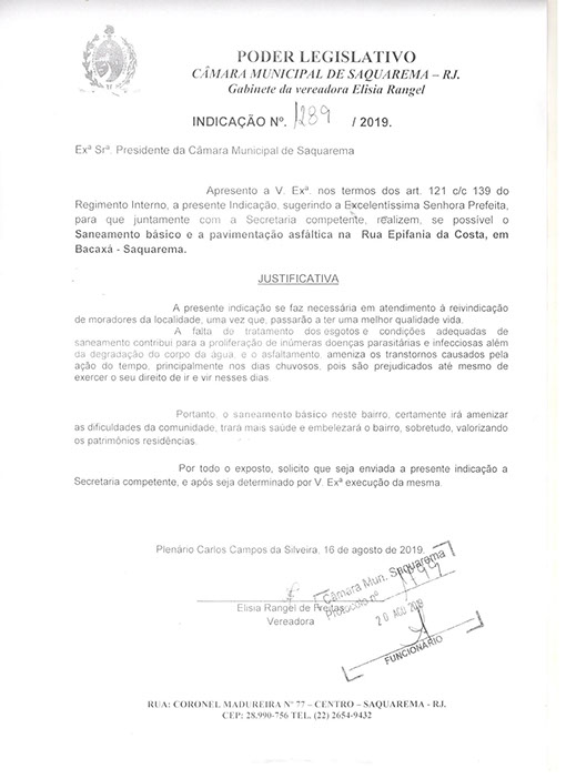 Estão presentes aqui indicações apresentadas por iniciativa de Elisia Rangel durante o seu mandato vigente como Vereadora do Município de Saquarema, na Região dos Lagos do estado do Rio de Janeiro.