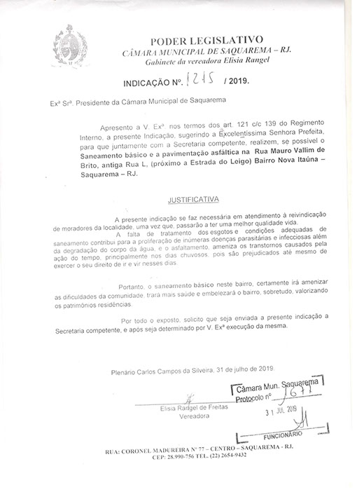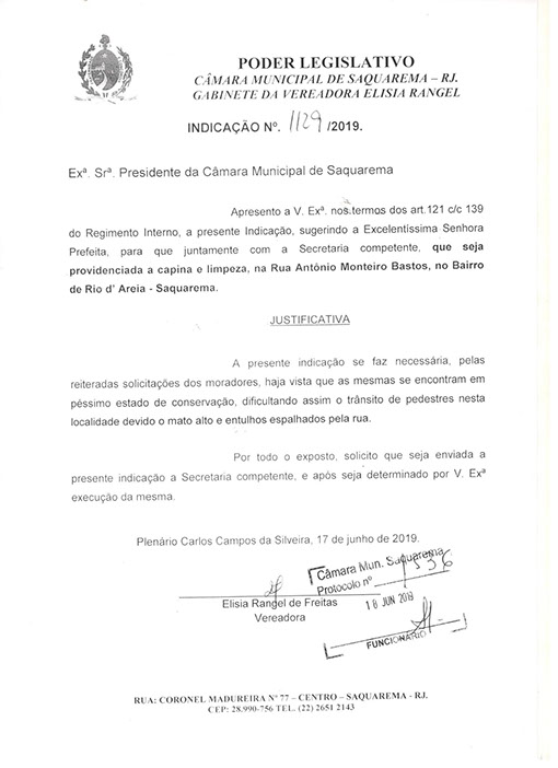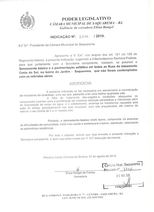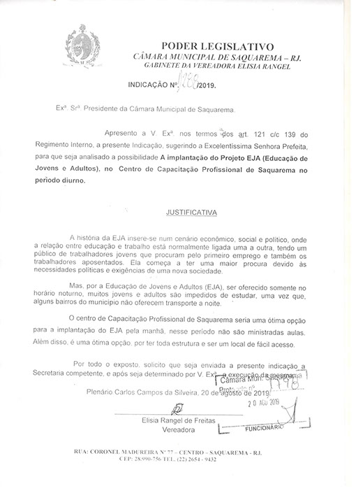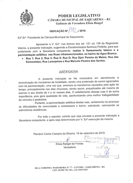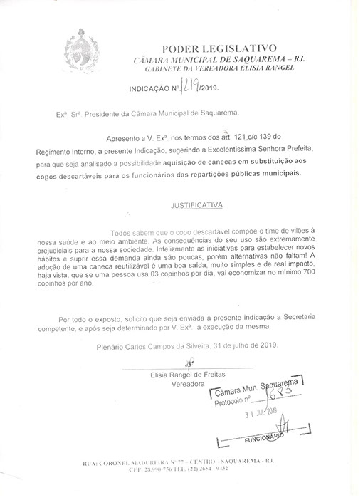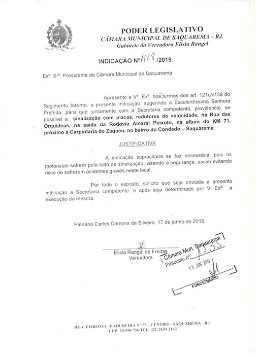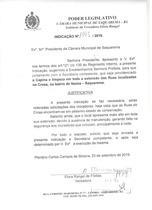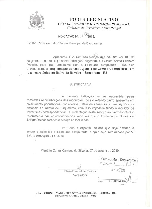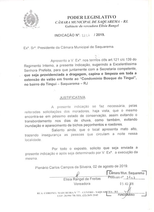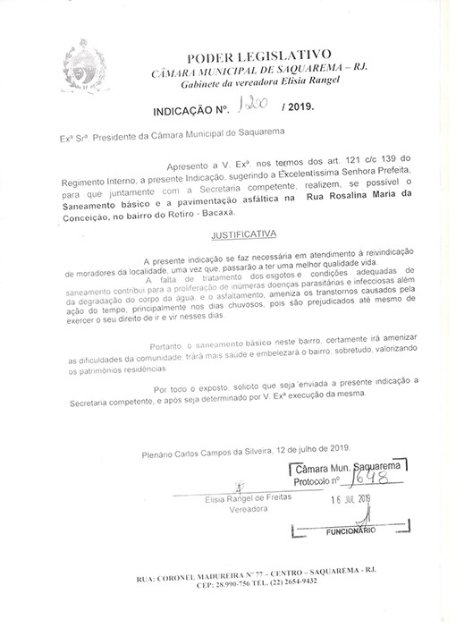 Estão presentes aqui indicações apresentadas por iniciativa de Elisia Rangel durante o seu mandato vigente como Vereadora do Município de Saquarema, na Região dos Lagos do estado do Rio de Janeiro.