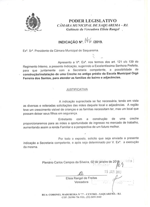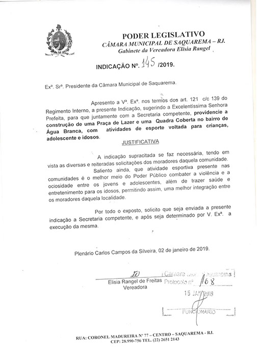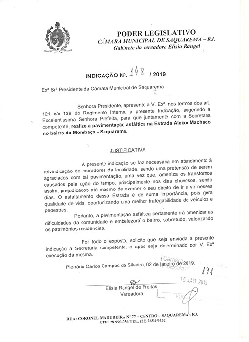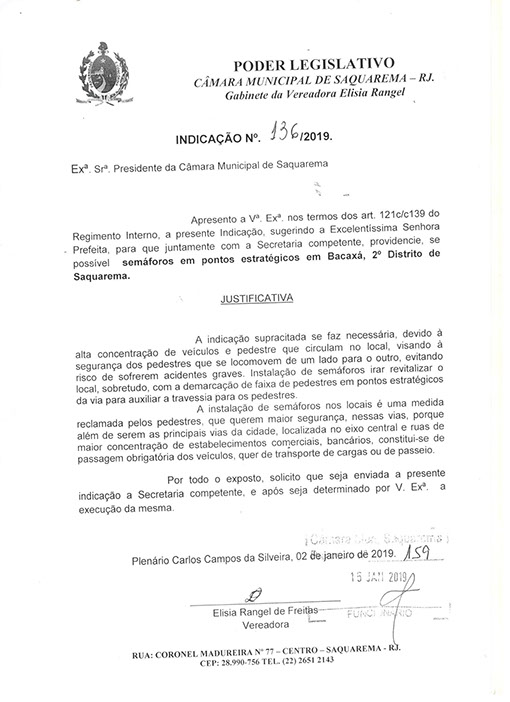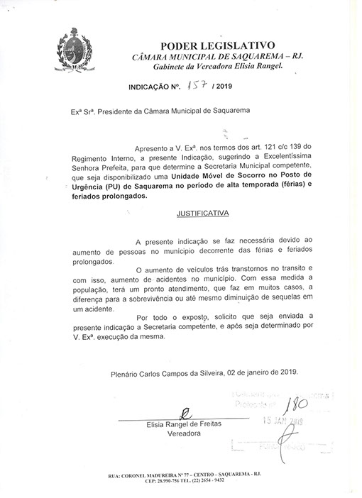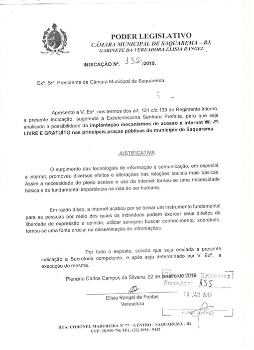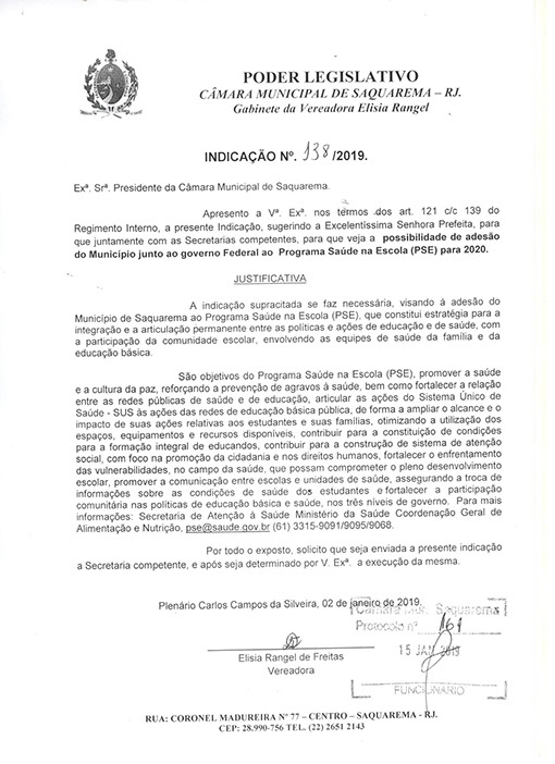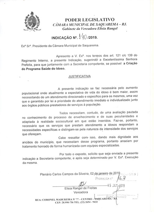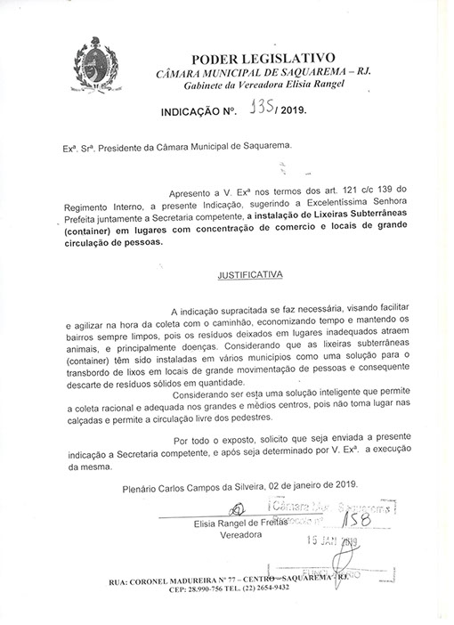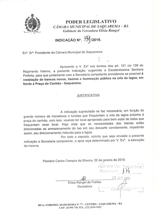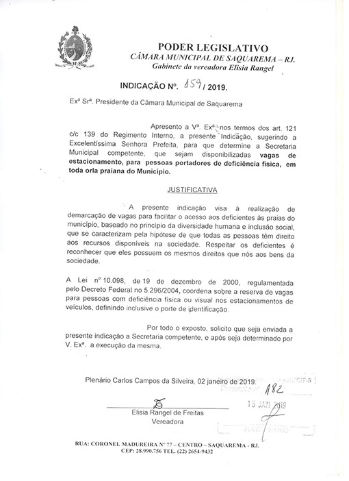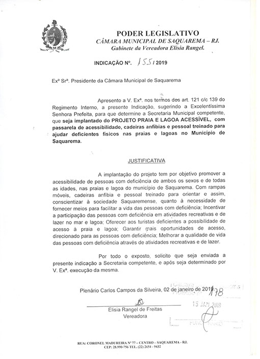 Estão presentes aqui indicações apresentadas por iniciativa de Elisia Rangel durante o seu mandato vigente como Vereadora do Município de Saquarema, na Região dos Lagos do estado do Rio de Janeiro.