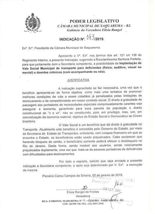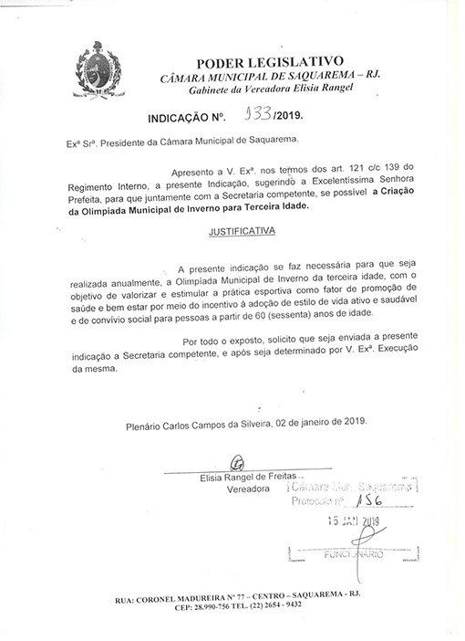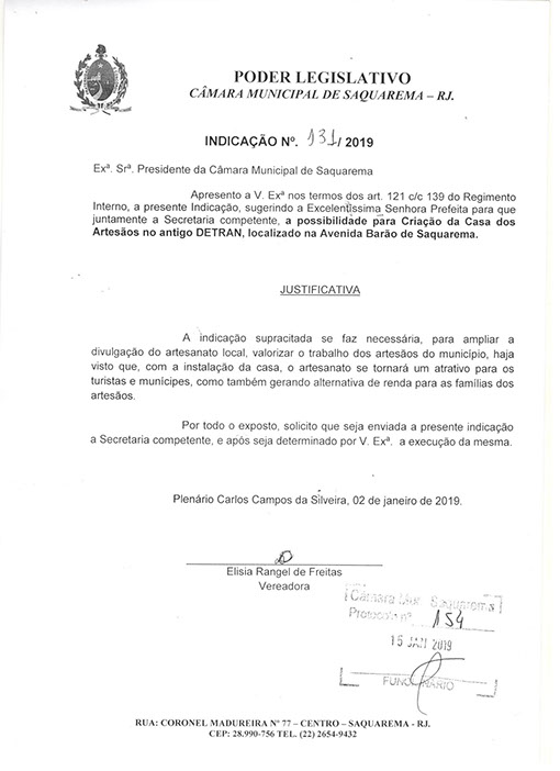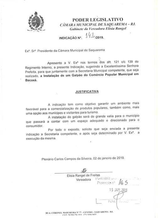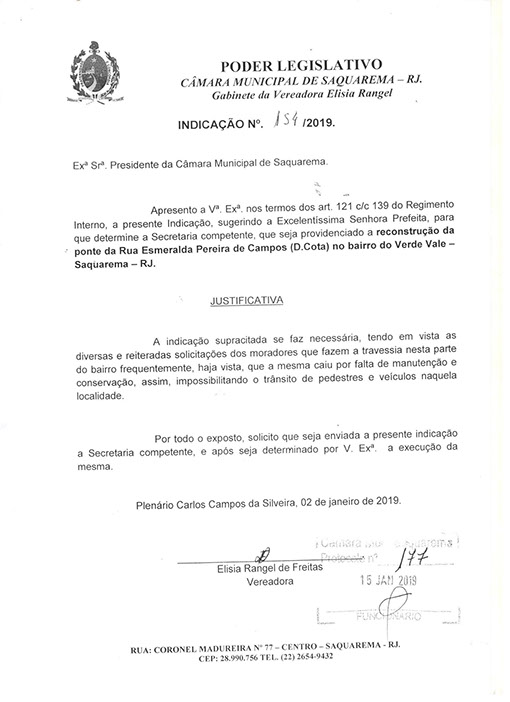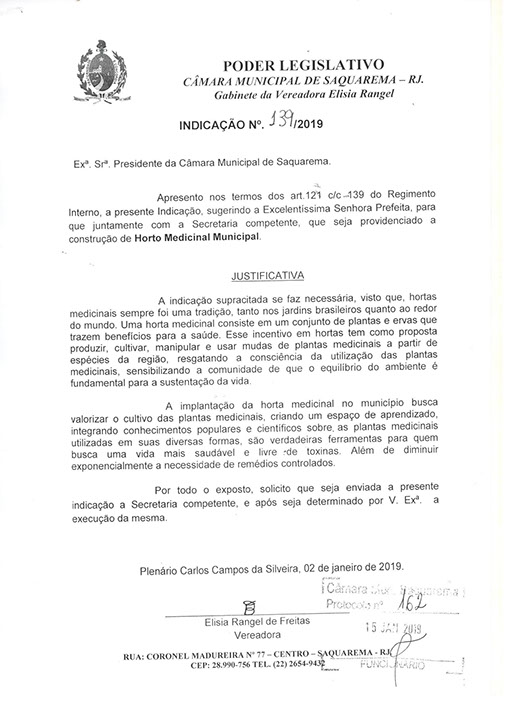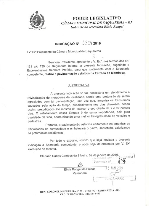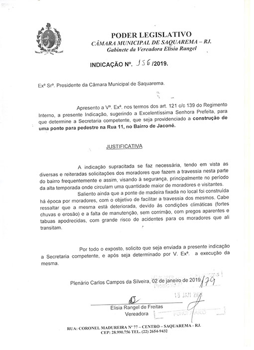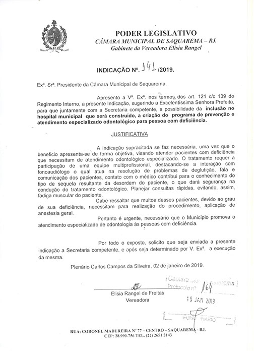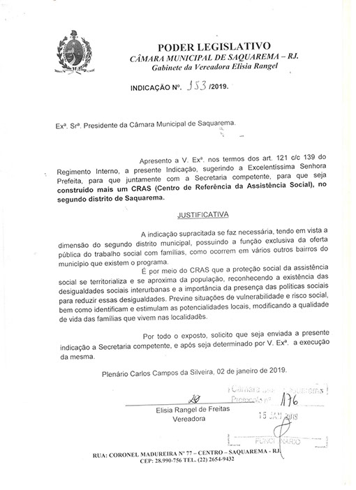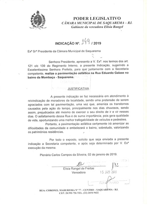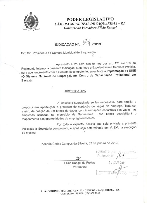 Estão presentes aqui indicações apresentadas por iniciativa de Elisia Rangel durante o seu mandato vigente como Vereadora do Município de Saquarema, na Região dos Lagos do estado do Rio de Janeiro.