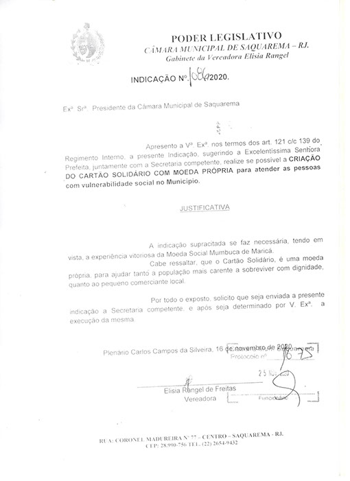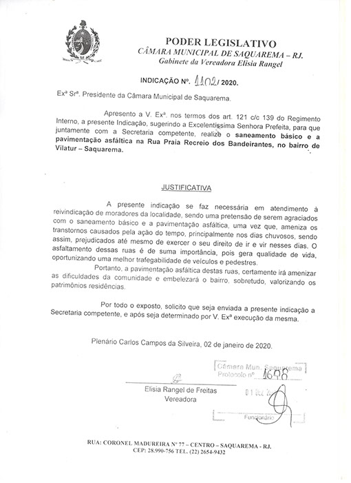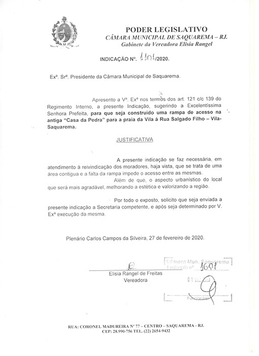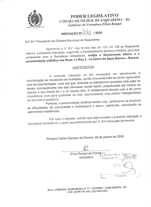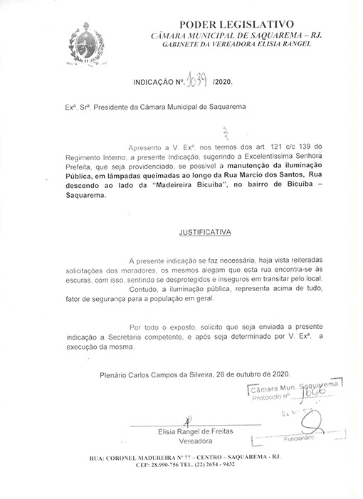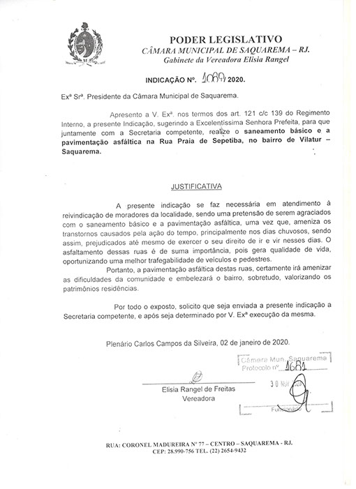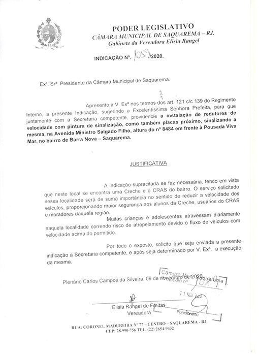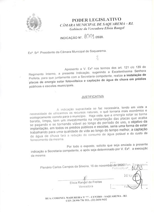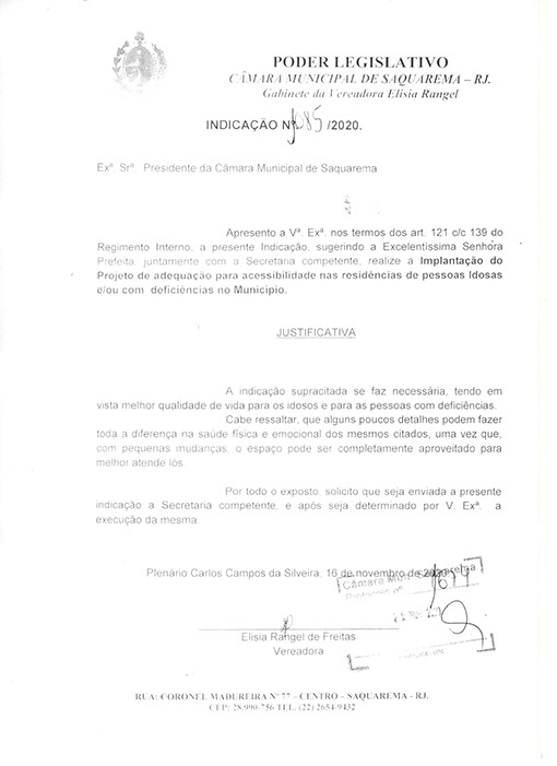 Estão presentes aqui indicações apresentadas por iniciativa de Elisia Rangel durante o seu mandato vigente como Vereadora do Município de Saquarema, na Região dos Lagos do estado do Rio de Janeiro.