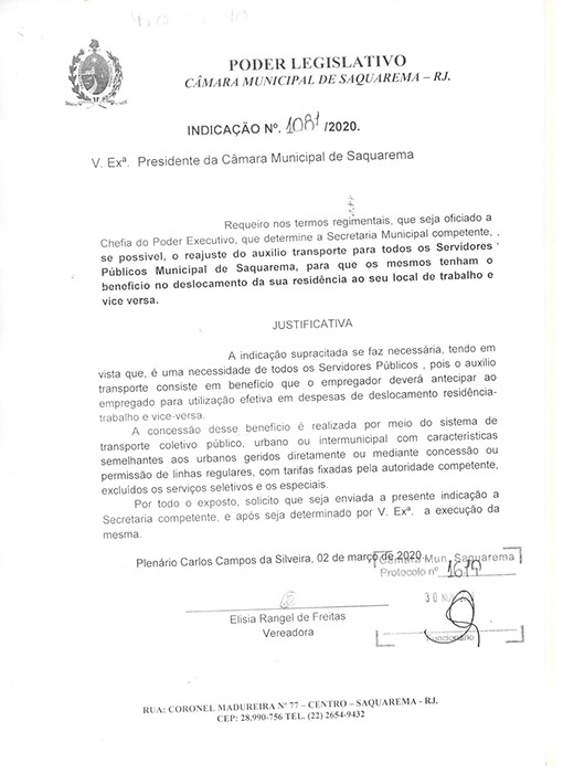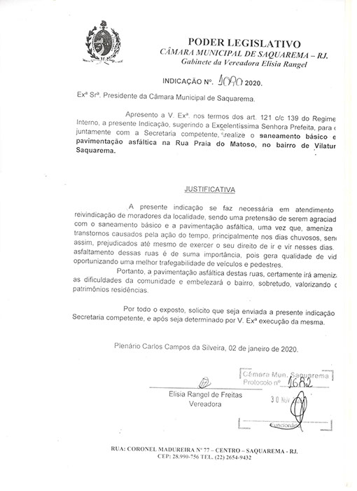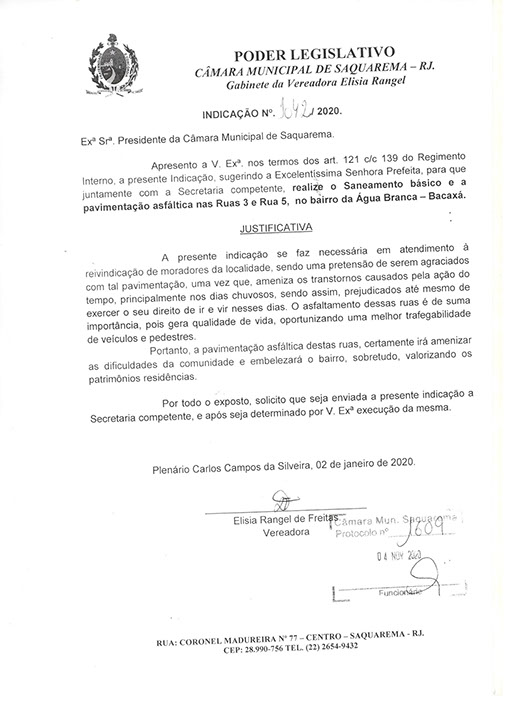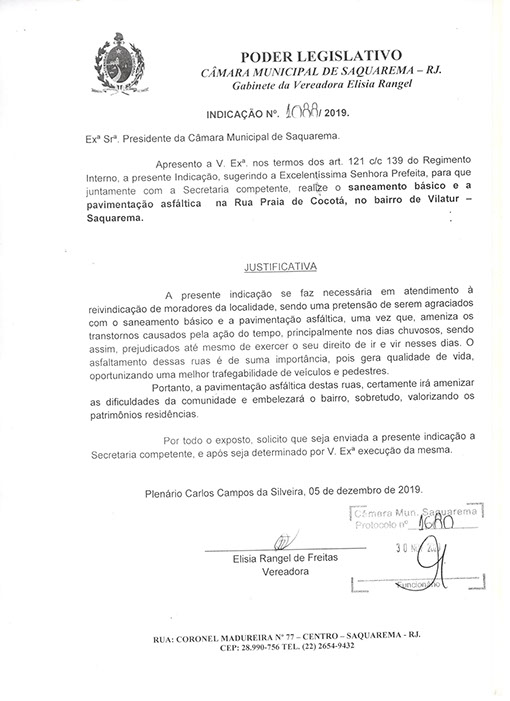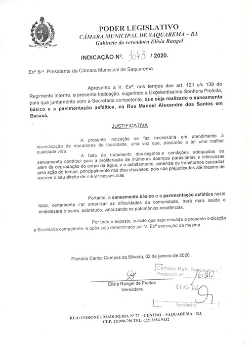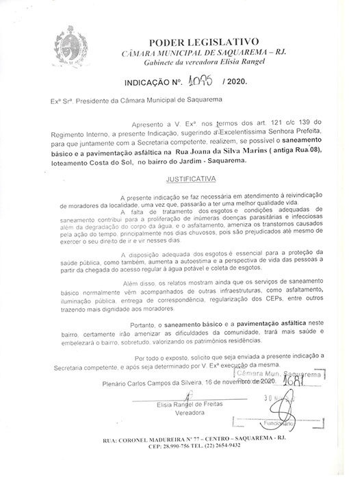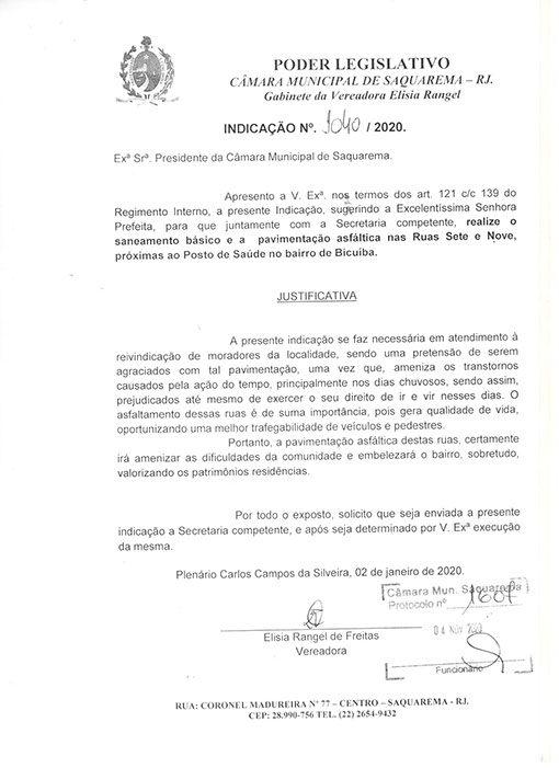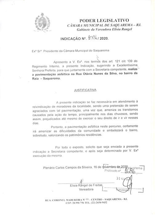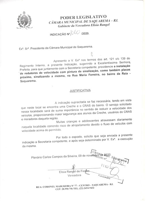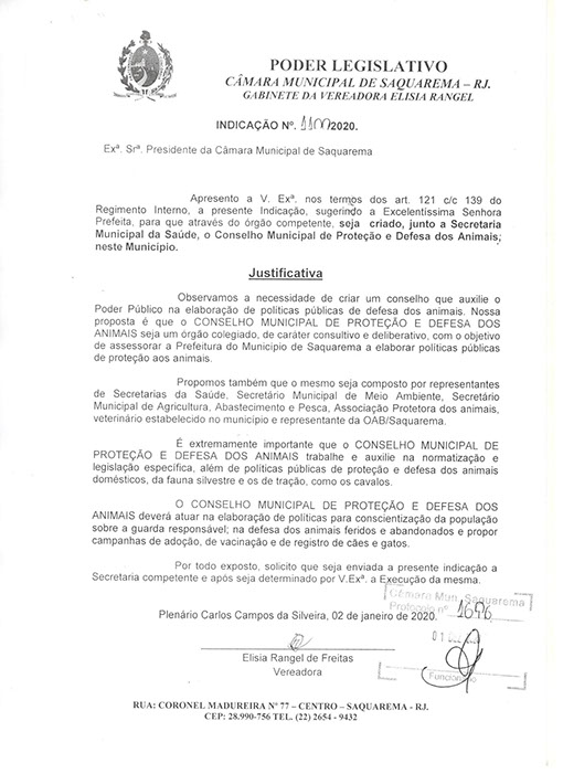 Estão presentes aqui indicações apresentadas por iniciativa de Elisia Rangel durante o seu mandato vigente como Vereadora do Município de Saquarema, na Região dos Lagos do estado do Rio de Janeiro.