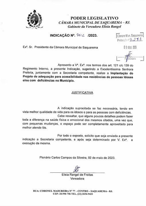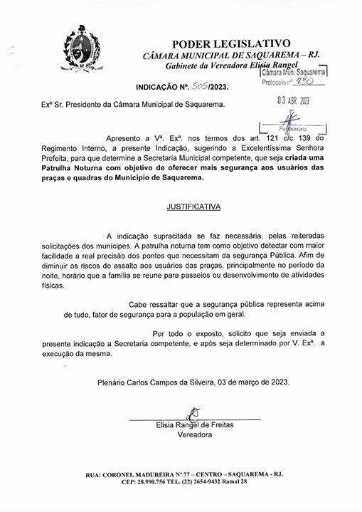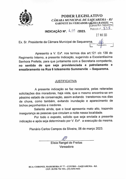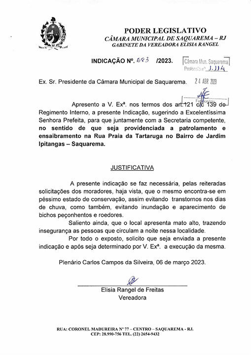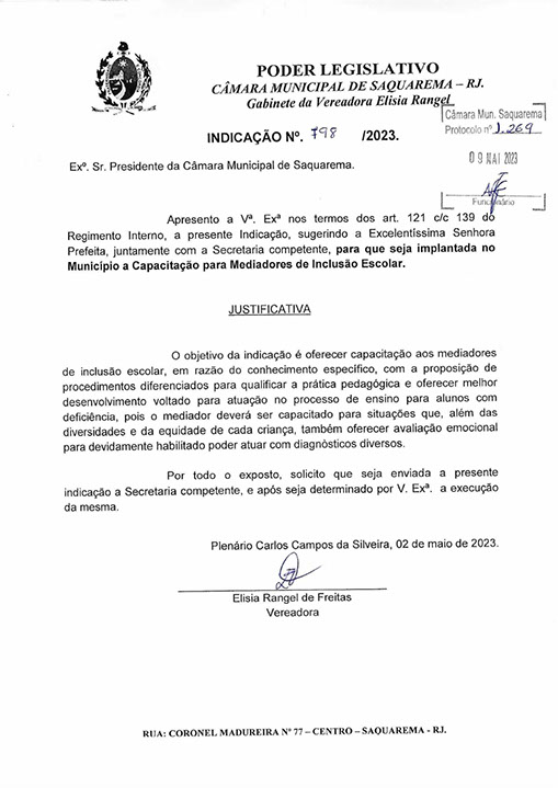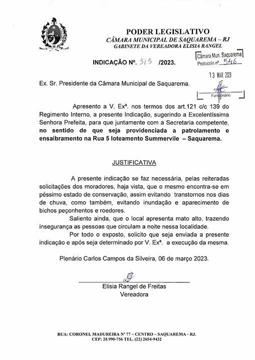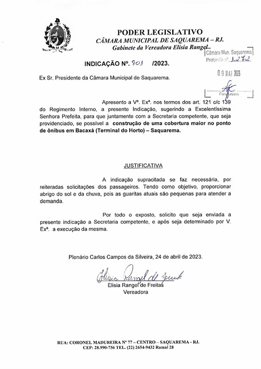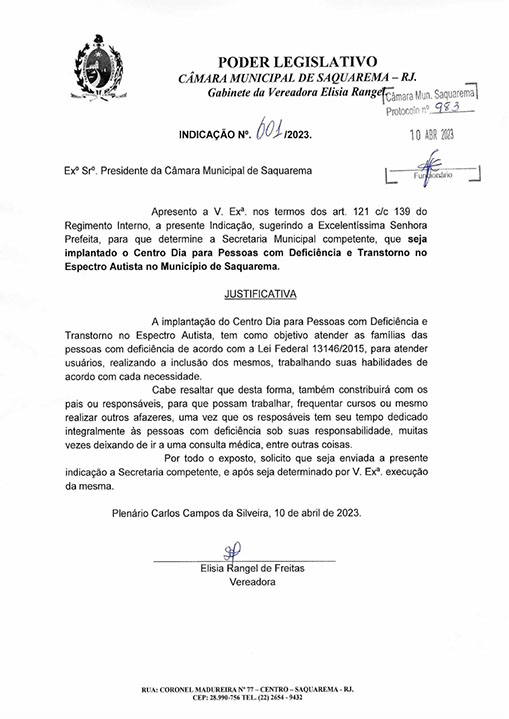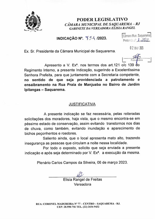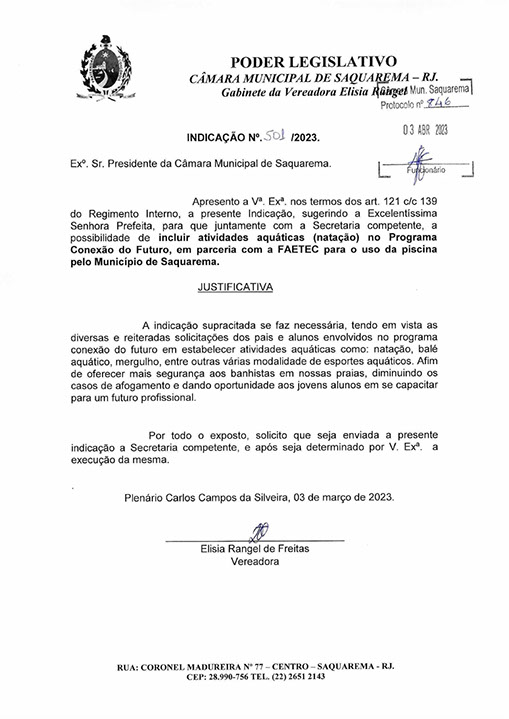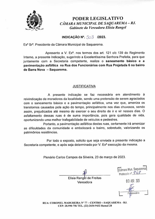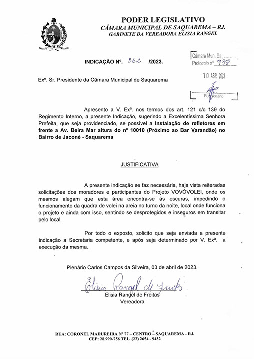 Estão presentes aqui indicações apresentadas por iniciativa de Elisia Rangel durante o seu mandato vigente como Vereadora do Município de Saquarema, na Região dos Lagos do estado do Rio de Janeiro.
