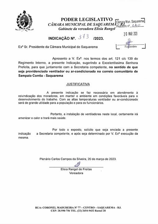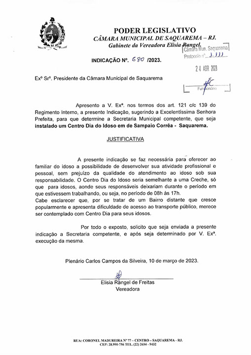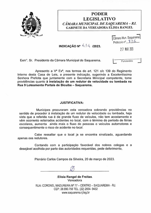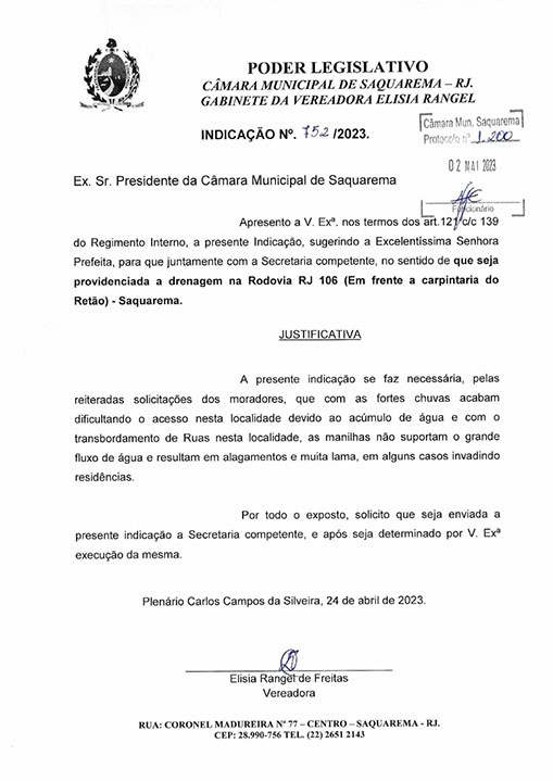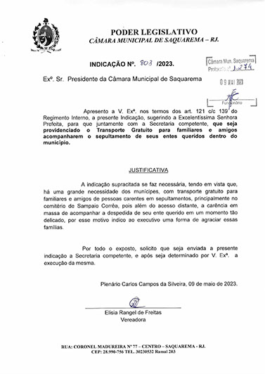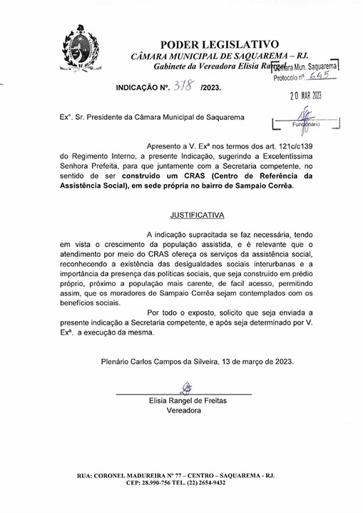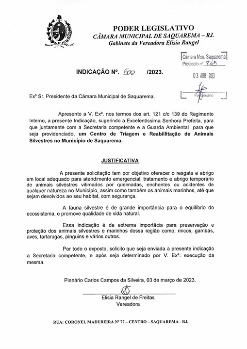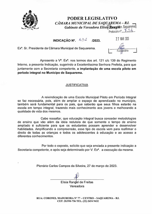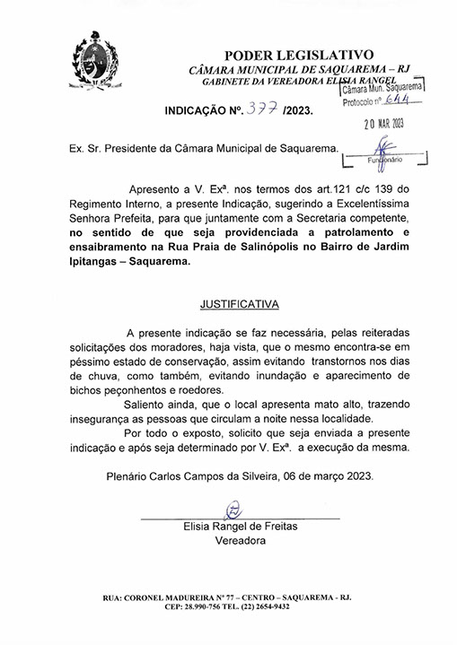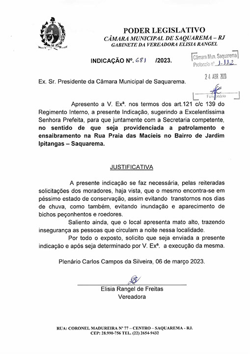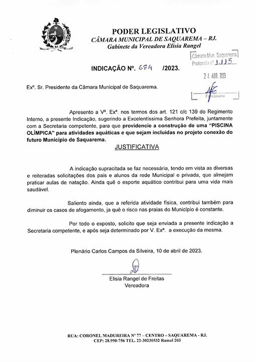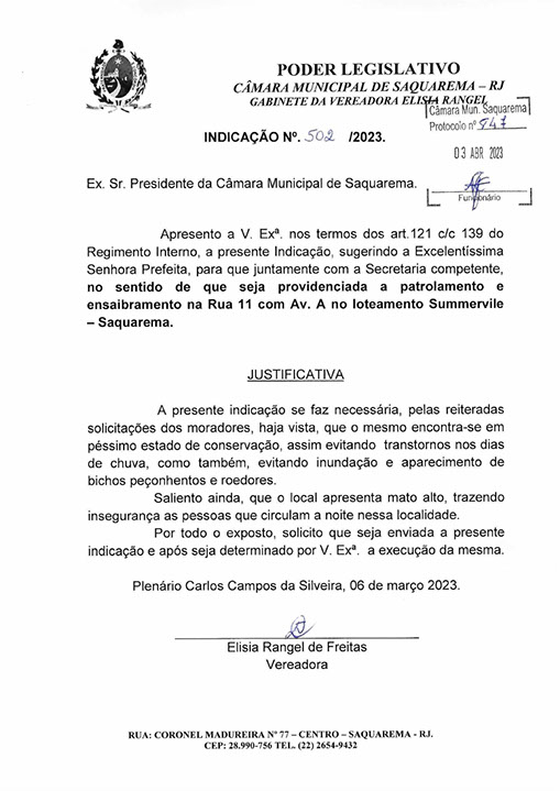 Estão presentes aqui indicações apresentadas por iniciativa de Elisia Rangel durante o seu mandato vigente como Vereadora do Município de Saquarema, na Região dos Lagos do estado do Rio de Janeiro.