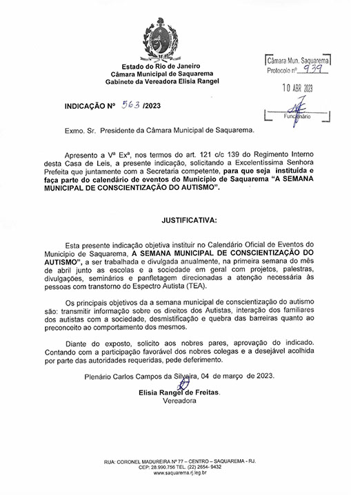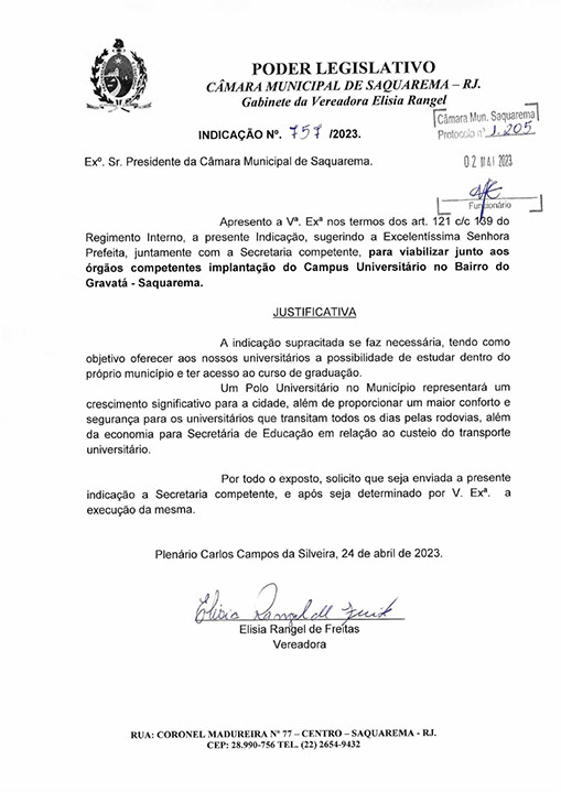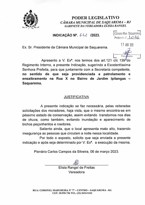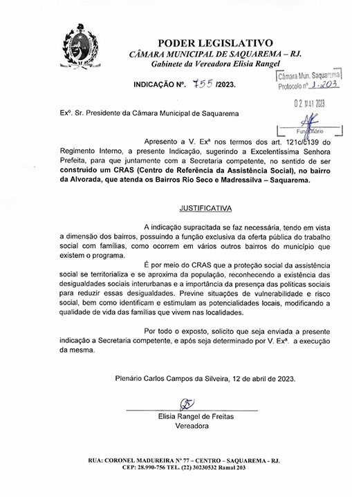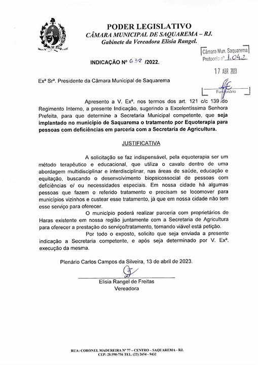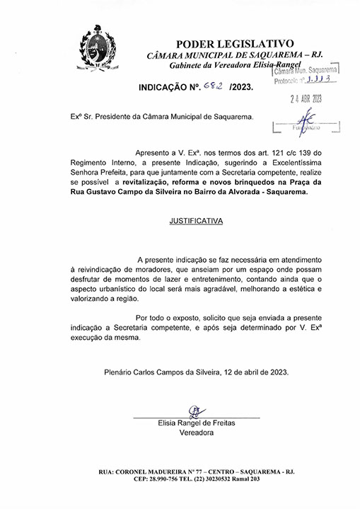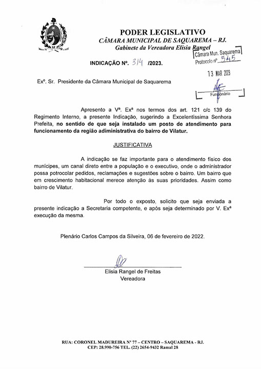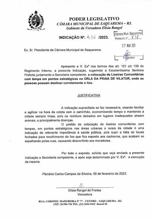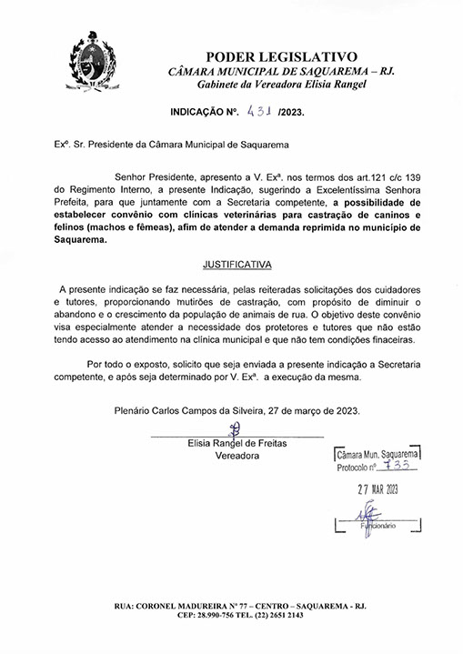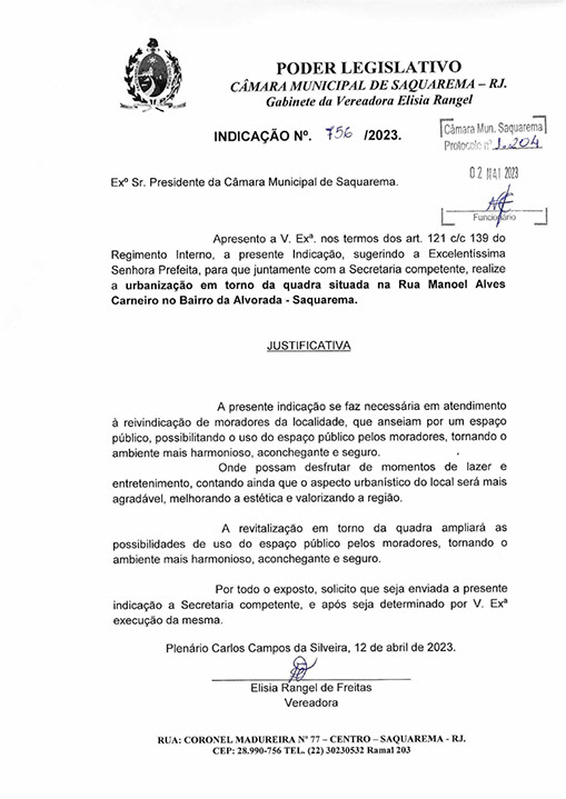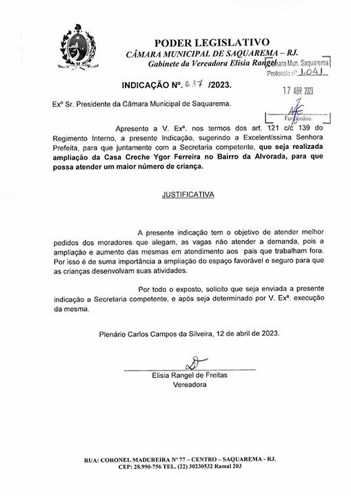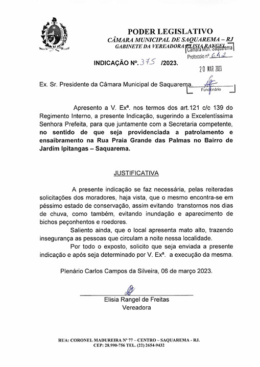 Estão presentes aqui indicações apresentadas por iniciativa de Elisia Rangel durante o seu mandato vigente como Vereadora do Município de Saquarema, na Região dos Lagos do estado do Rio de Janeiro.