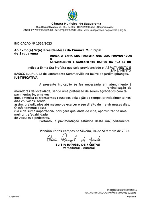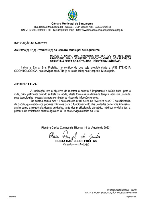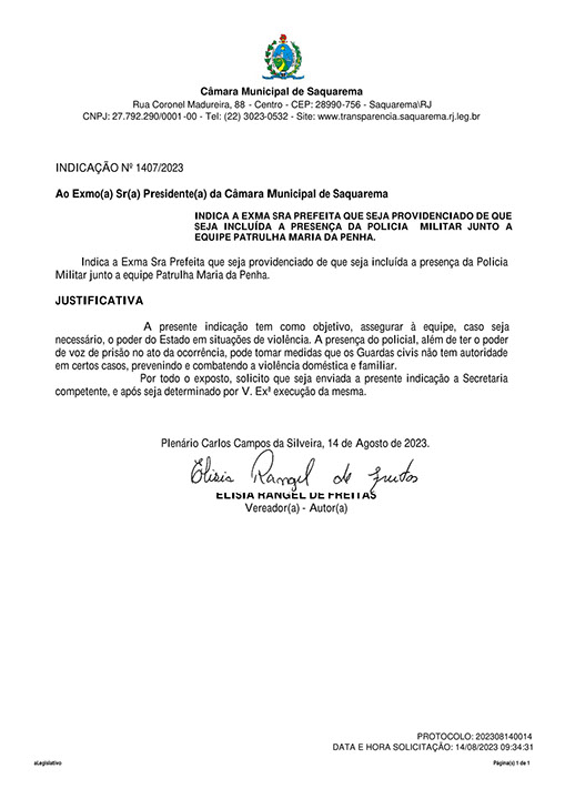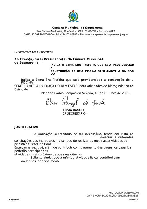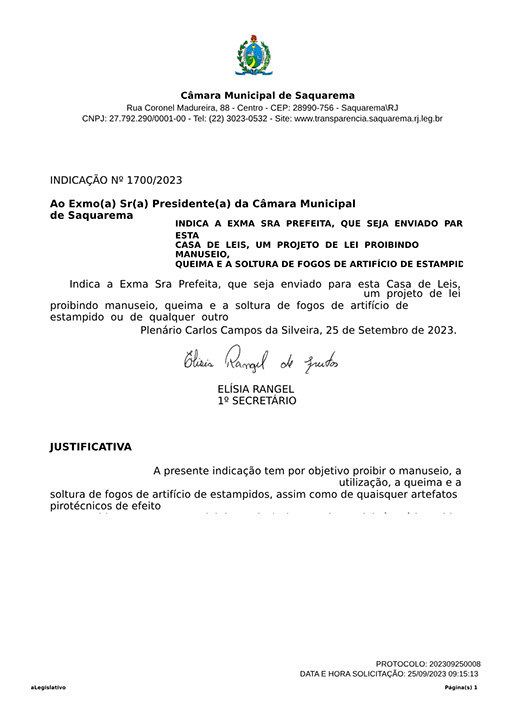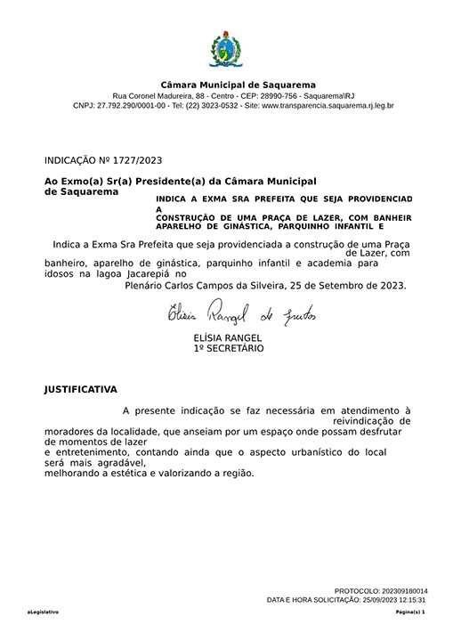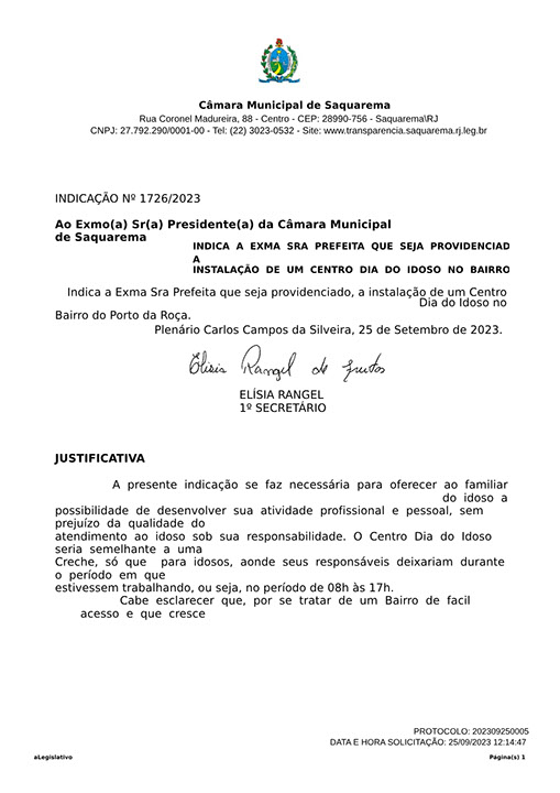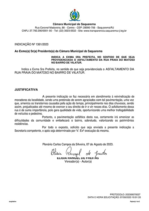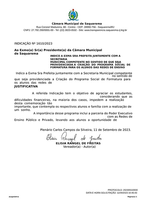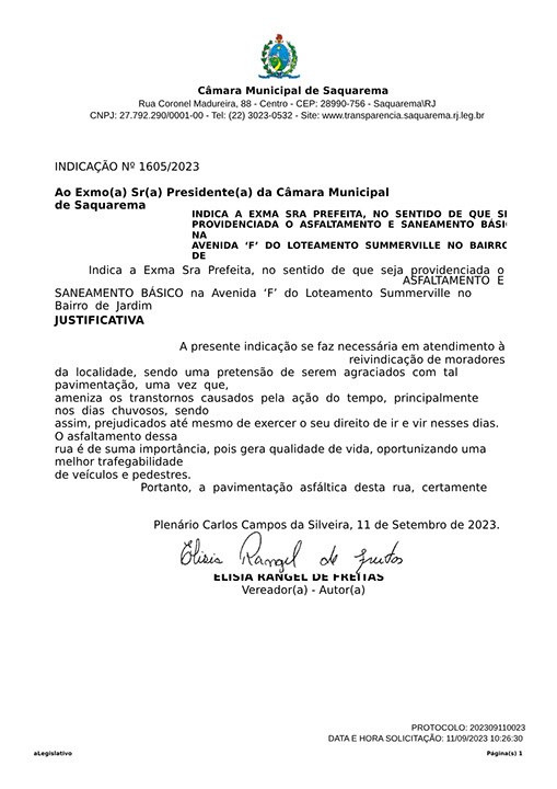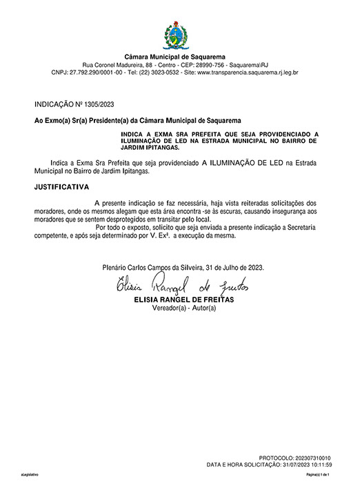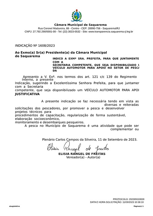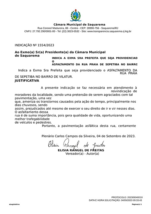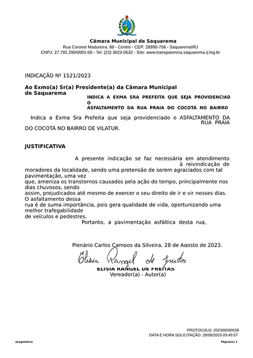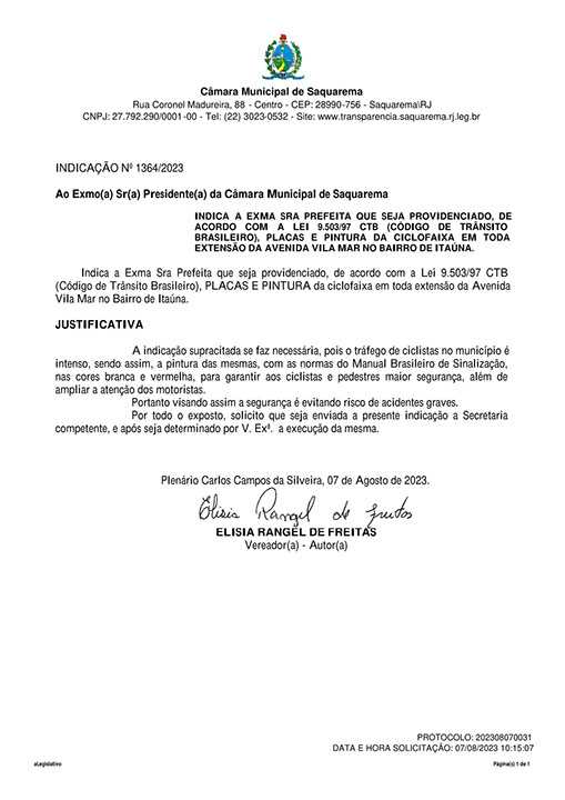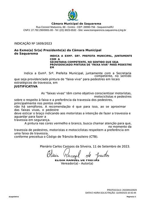 Estão presentes aqui indicações apresentadas por iniciativa de Elisia Rangel durante o seu mandato vigente como Vereadora do Município de Saquarema, na Região dos Lagos do estado do Rio de Janeiro.