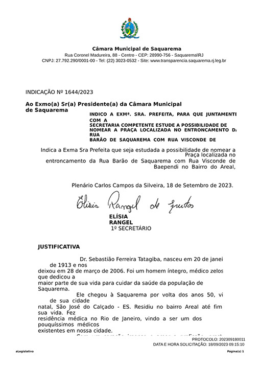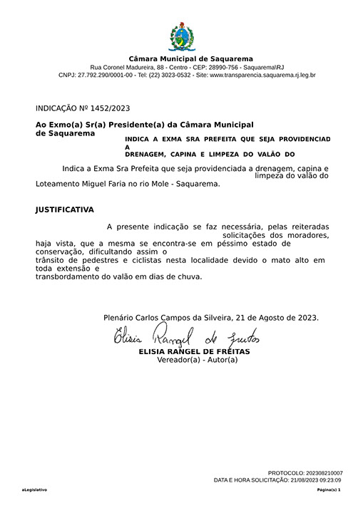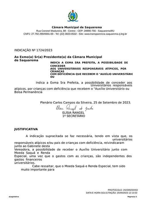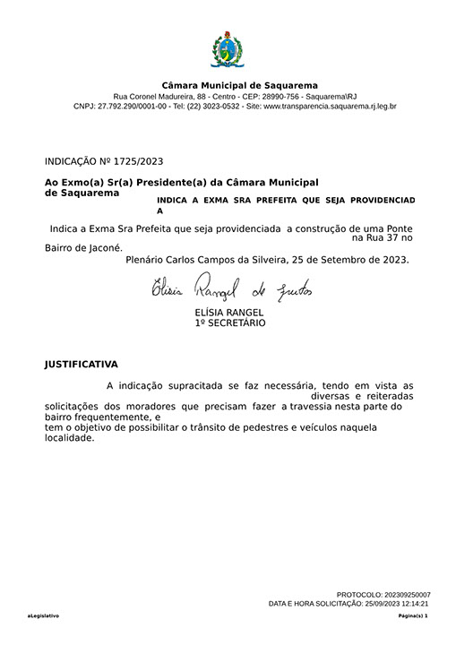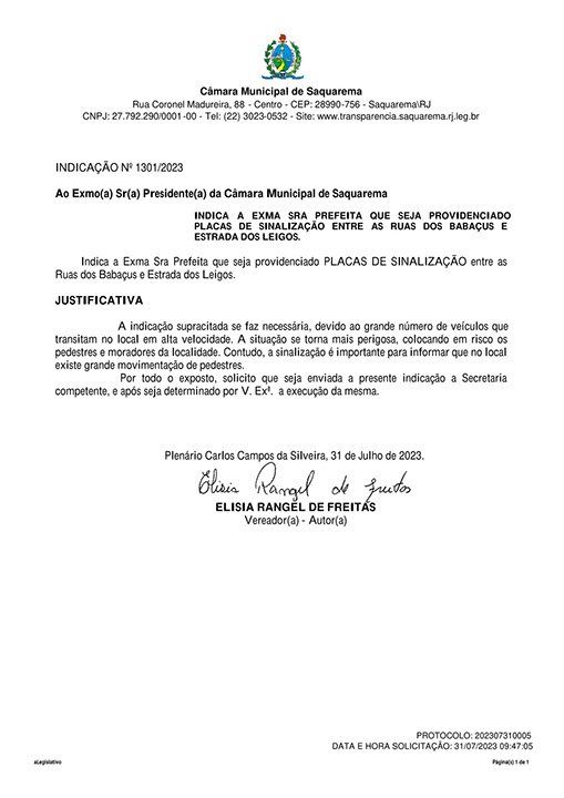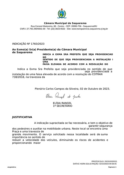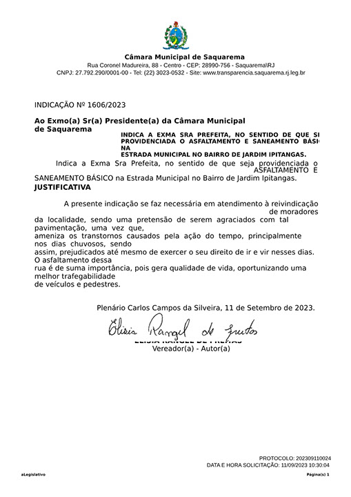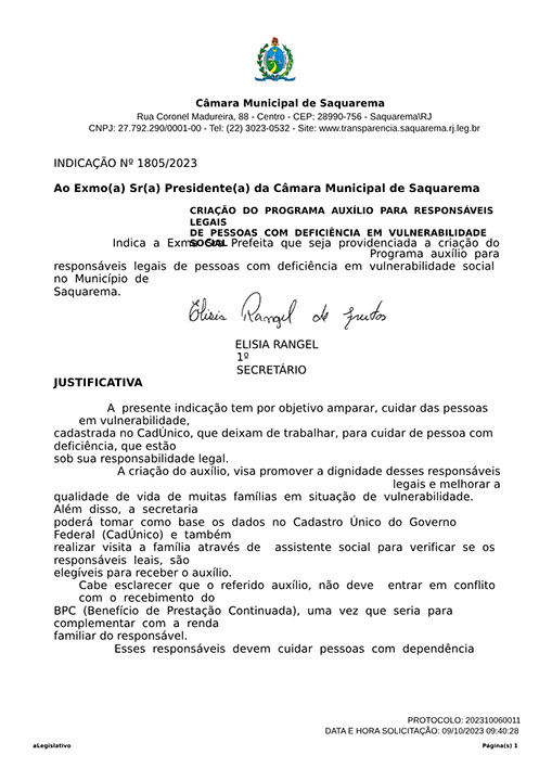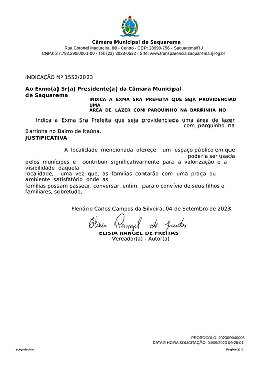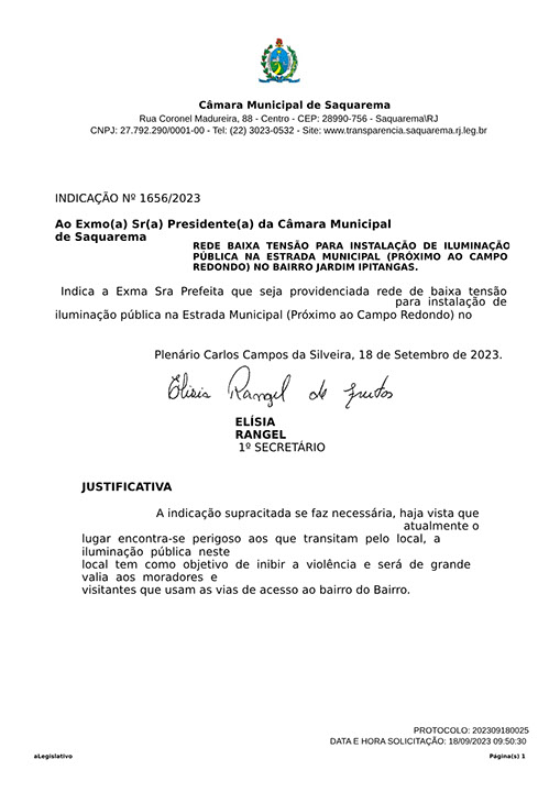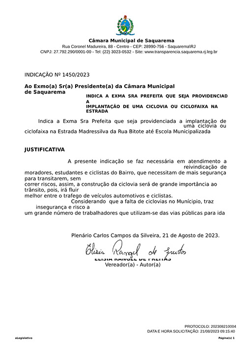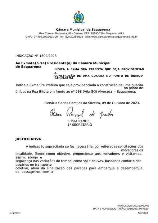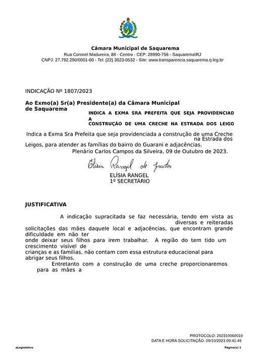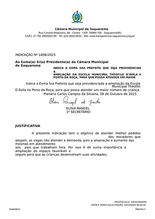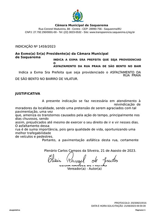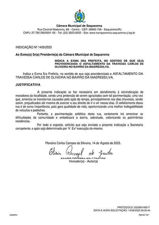 Estão presentes aqui indicações apresentadas por iniciativa de Elisia Rangel durante o seu mandato vigente como Vereadora do Município de Saquarema, na Região dos Lagos do estado do Rio de Janeiro.