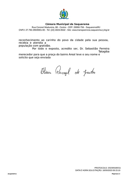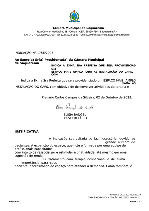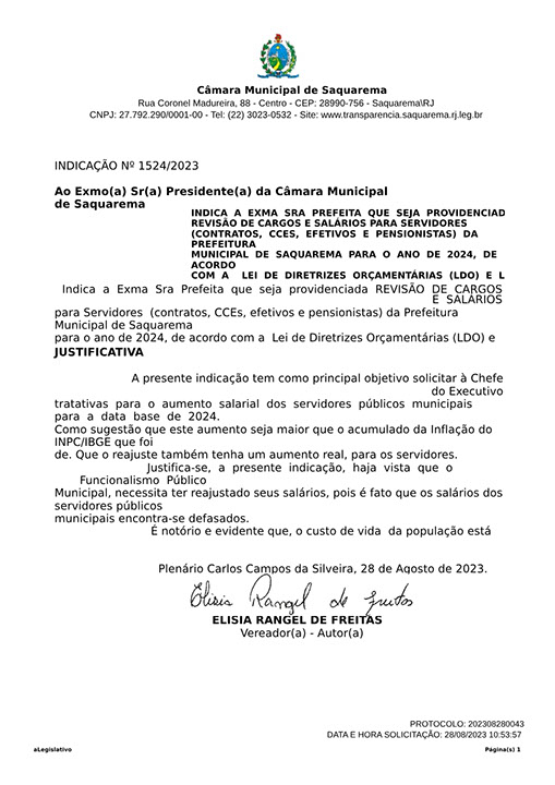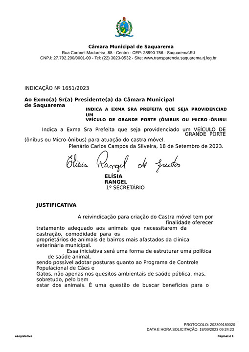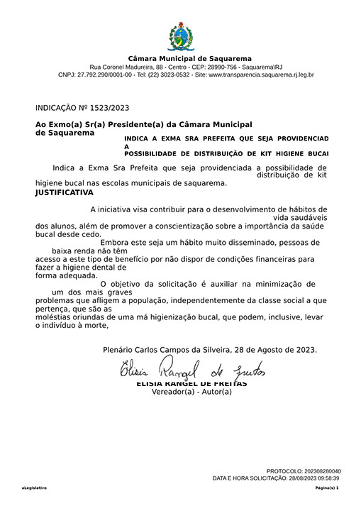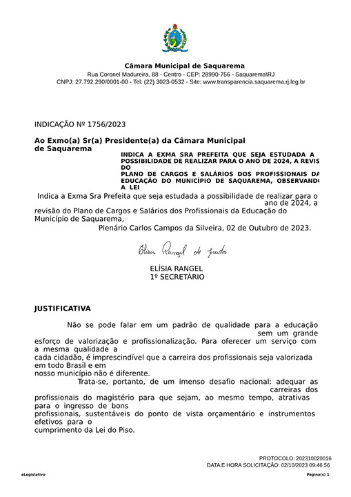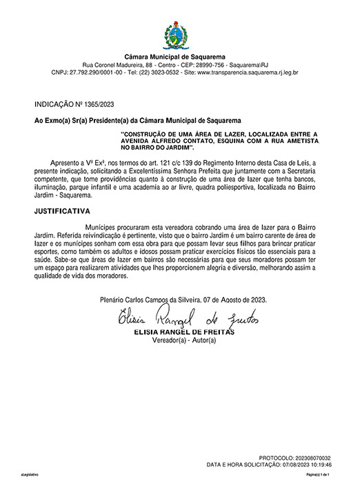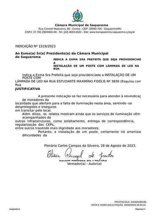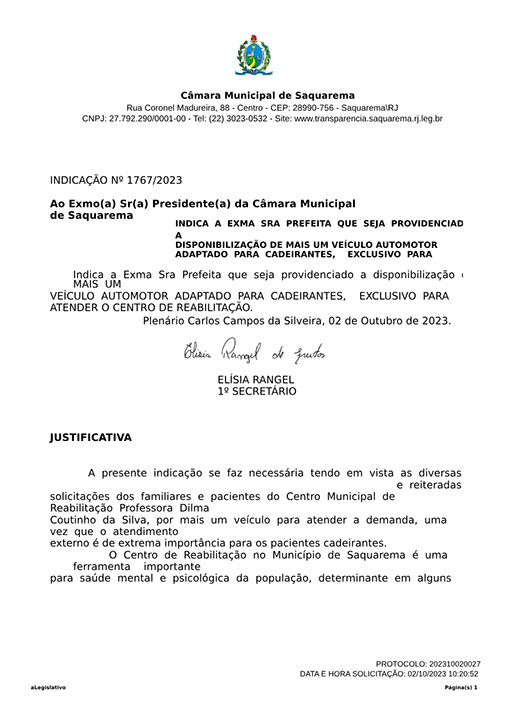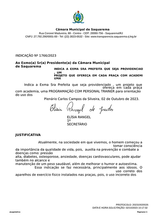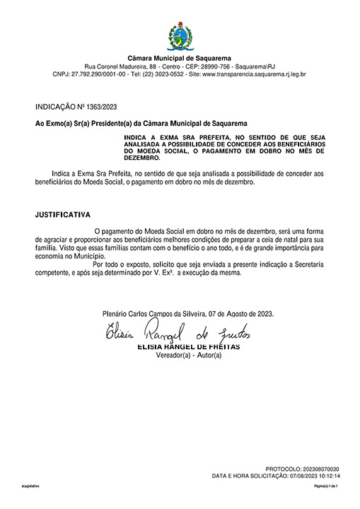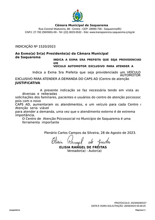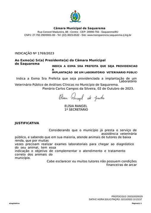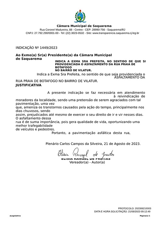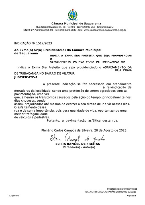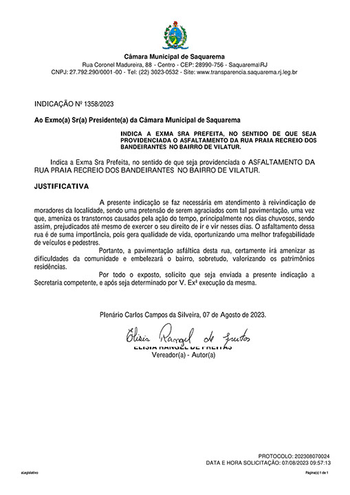 Estão presentes aqui indicações apresentadas por iniciativa de Elisia Rangel durante o seu mandato vigente como Vereadora do Município de Saquarema, na Região dos Lagos do estado do Rio de Janeiro.