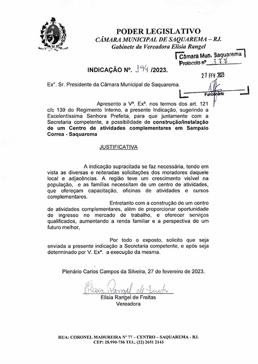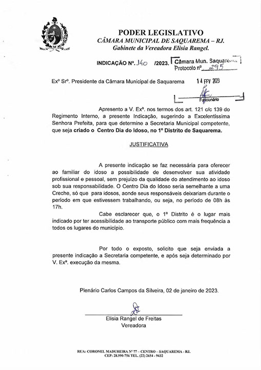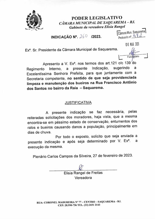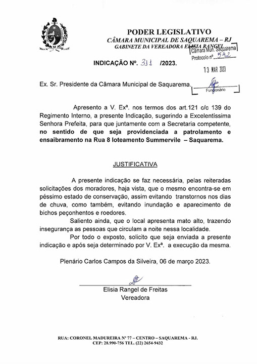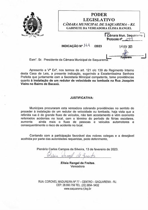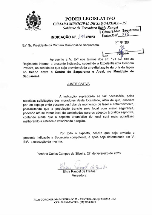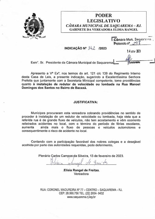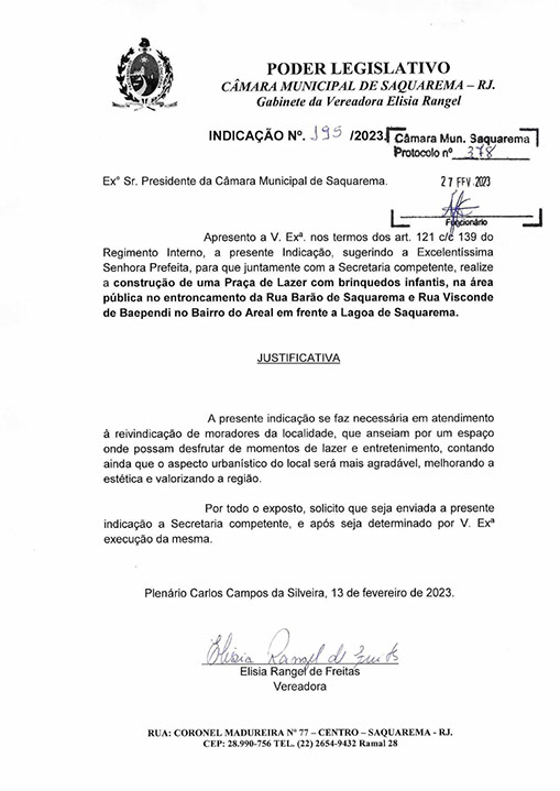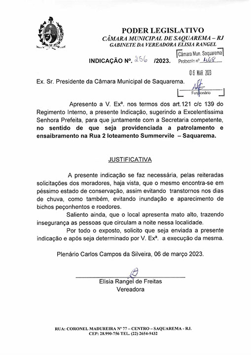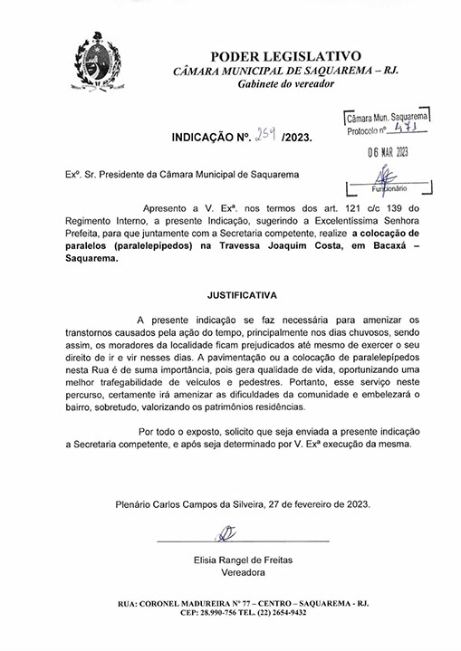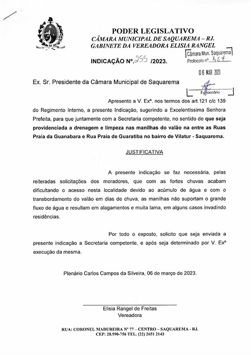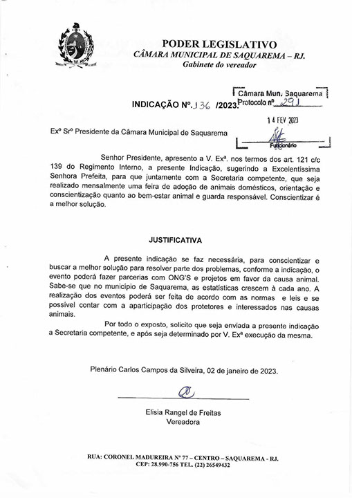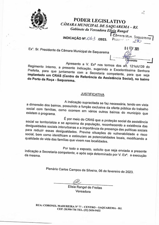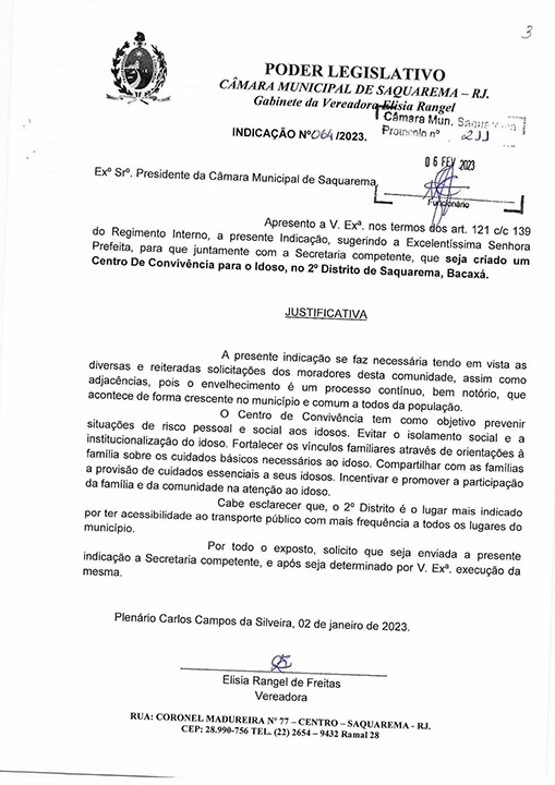 Estão presentes aqui indicações apresentadas por iniciativa de Elisia Rangel durante o seu mandato vigente como Vereadora do Município de Saquarema, na Região dos Lagos do estado do Rio de Janeiro.