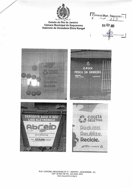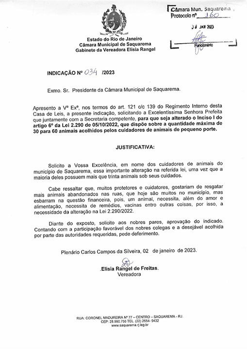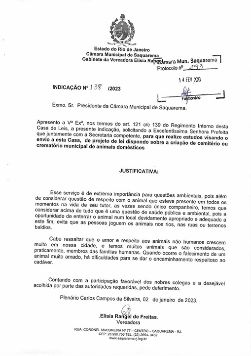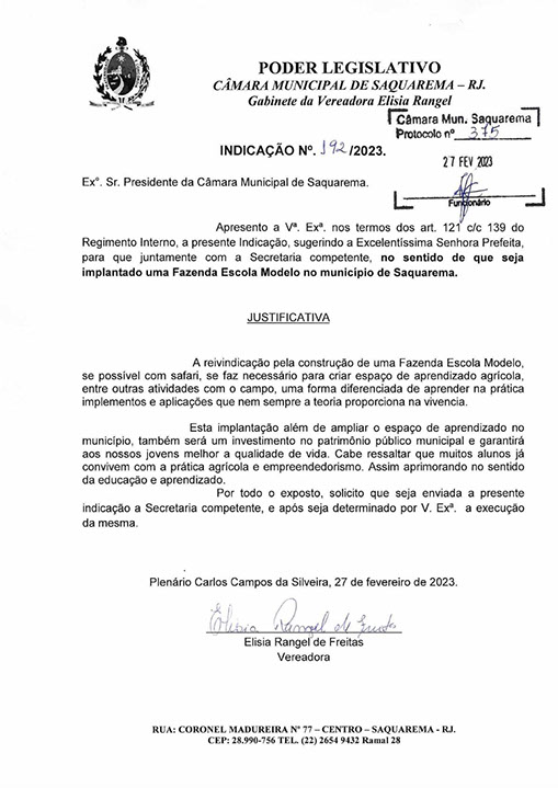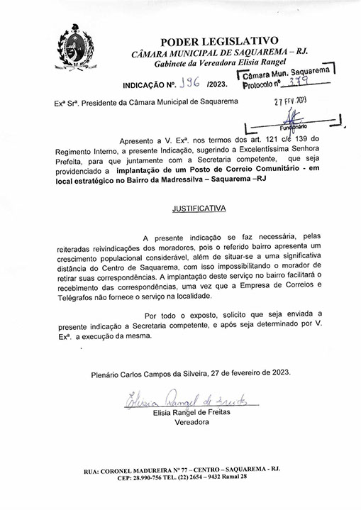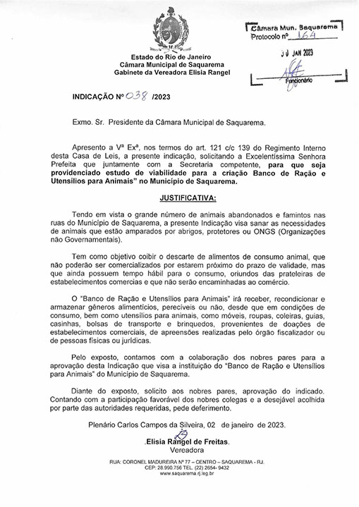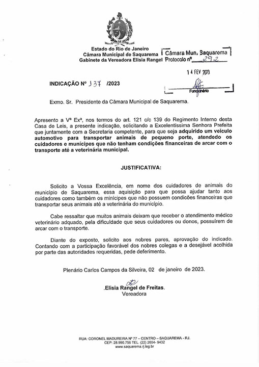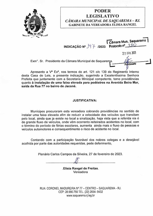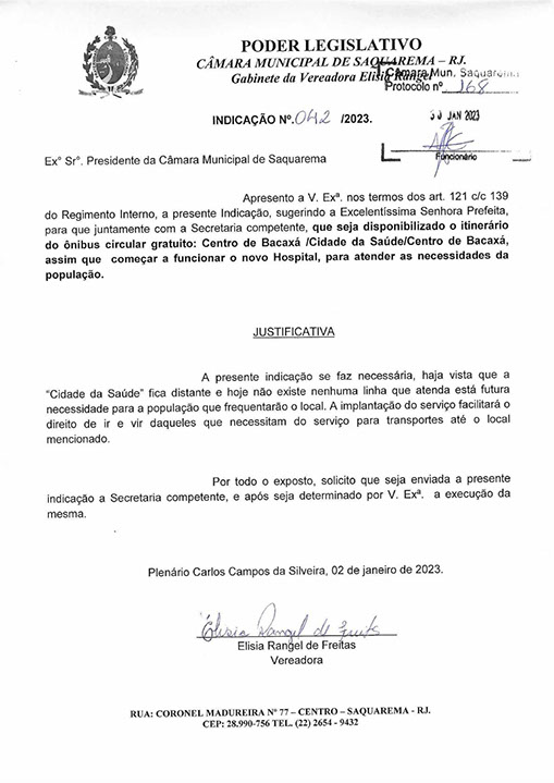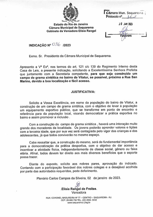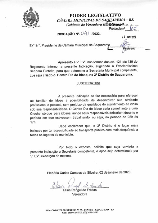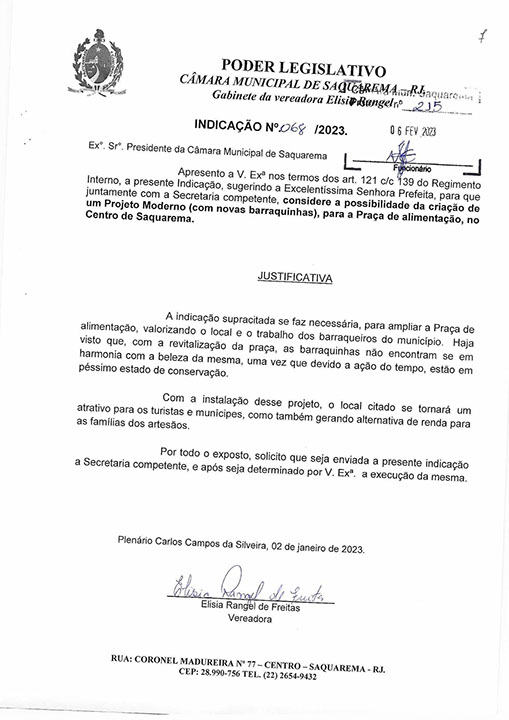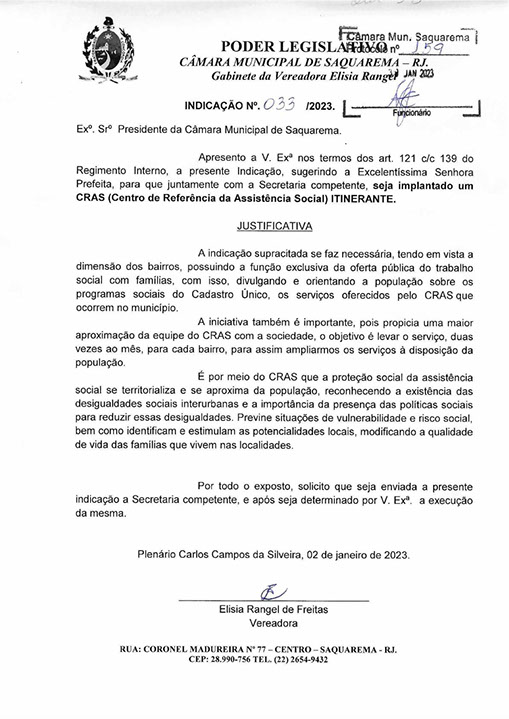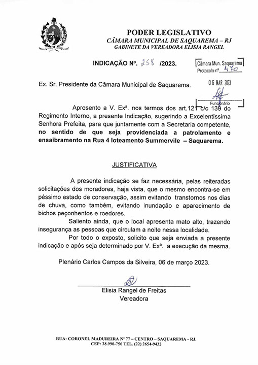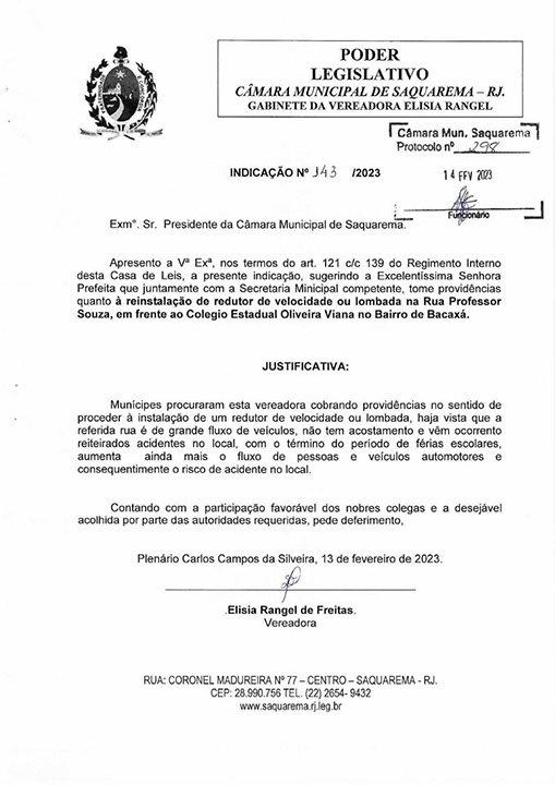 Estão presentes aqui indicações apresentadas por iniciativa de Elisia Rangel durante o seu mandato vigente como Vereadora do Município de Saquarema, na Região dos Lagos do estado do Rio de Janeiro.