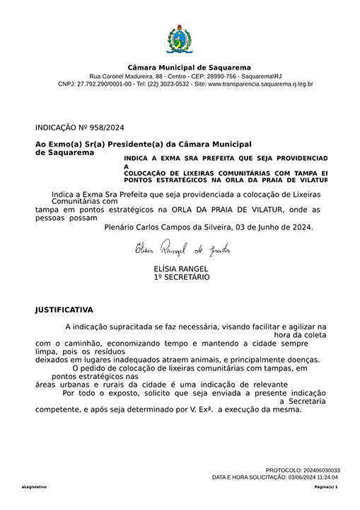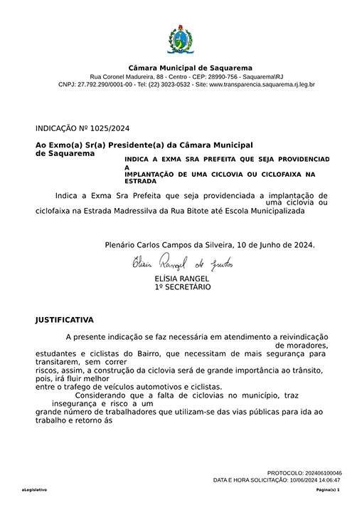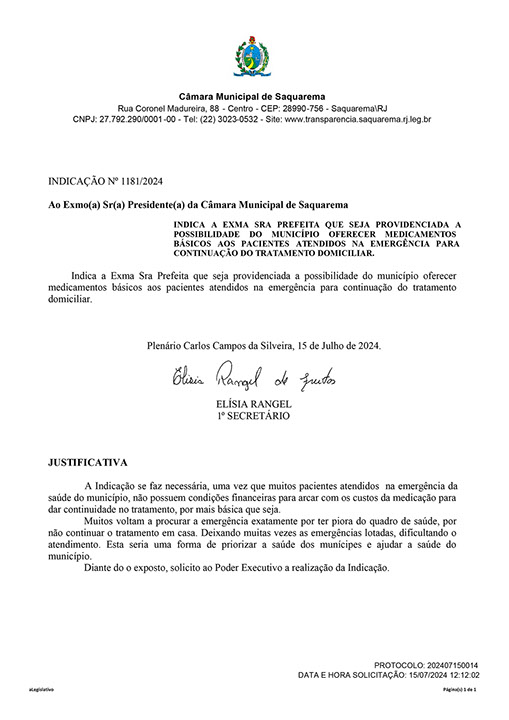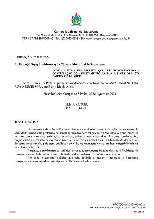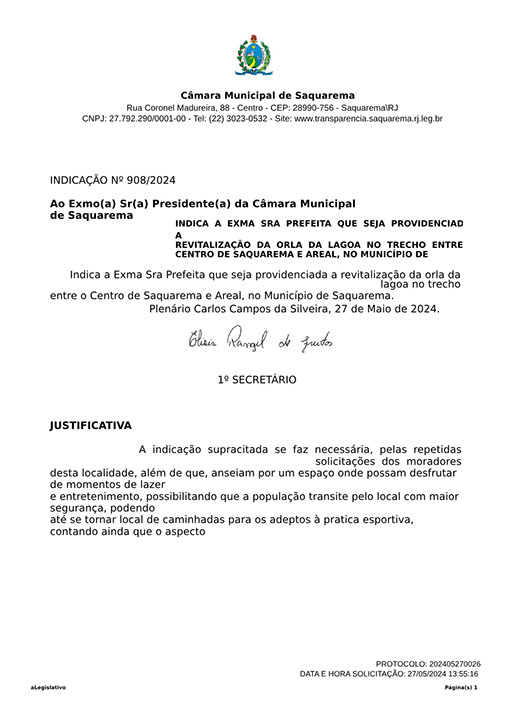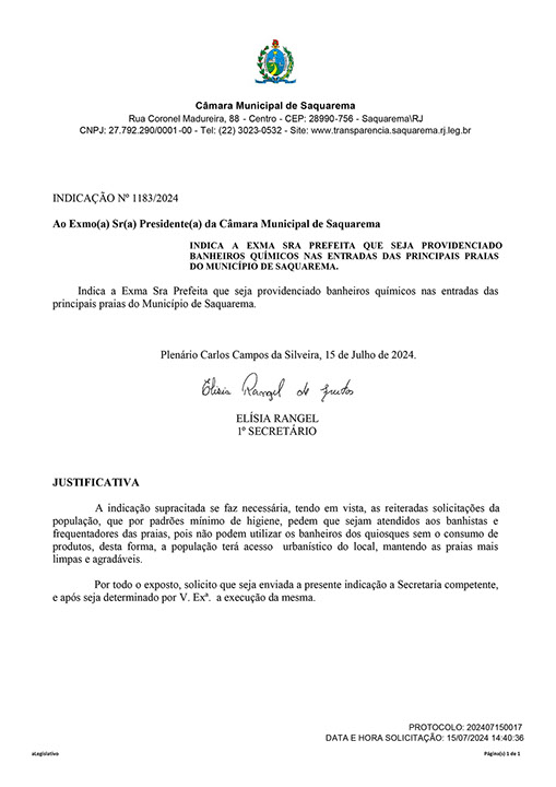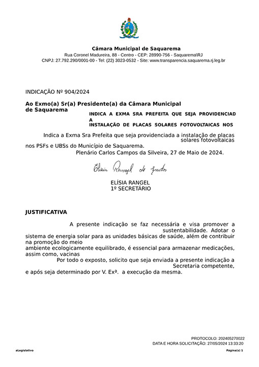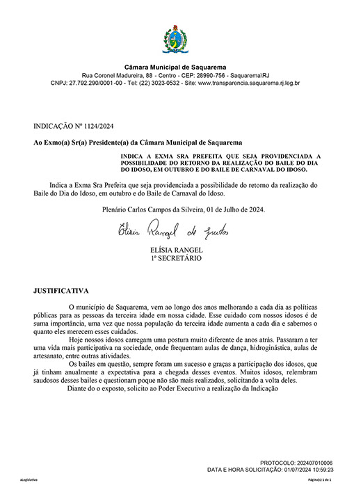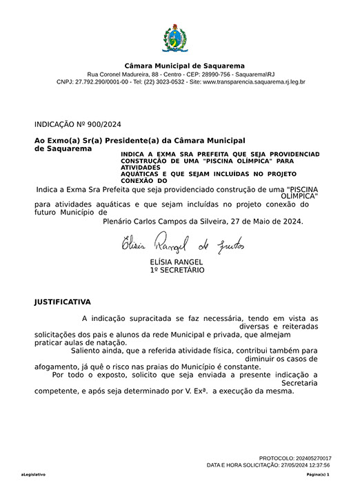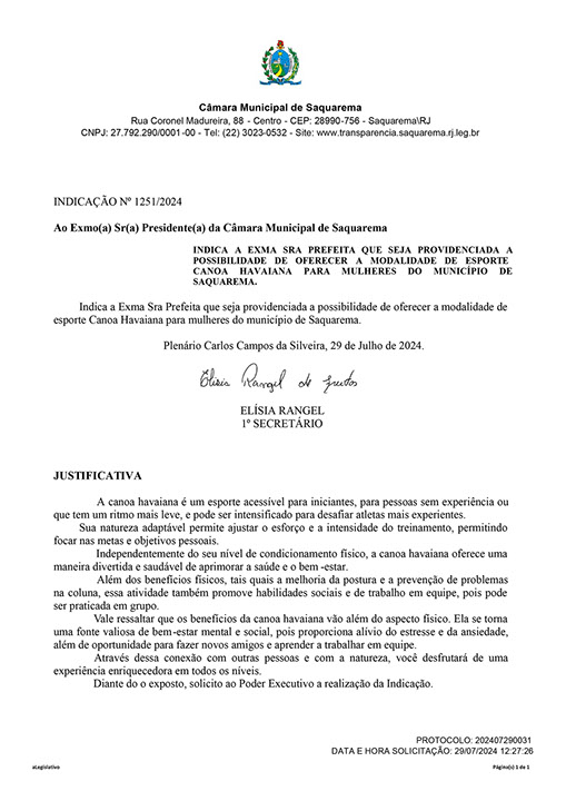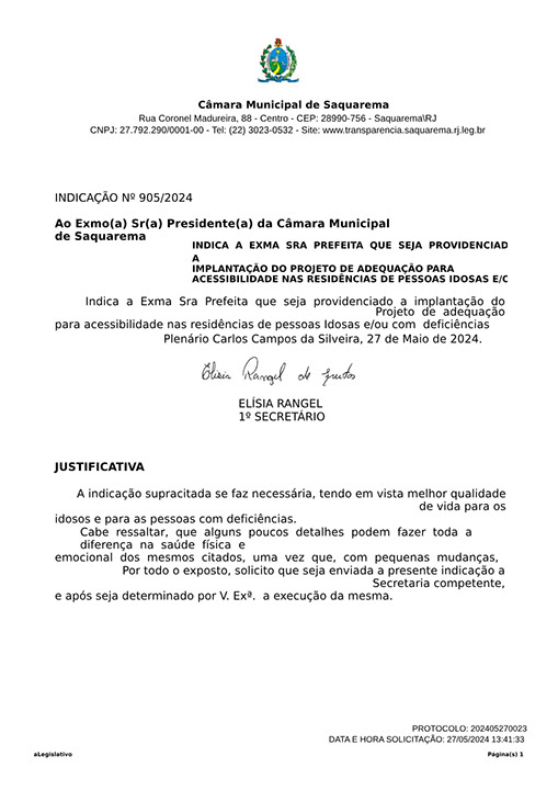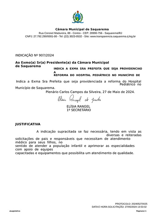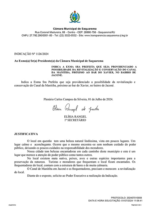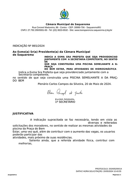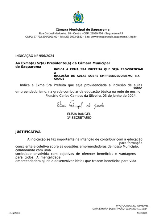 Estão presentes aqui indicações apresentadas por iniciativa de Elisia Rangel durante o seu mandato vigente como Vereadora do Município de Saquarema, na Região dos Lagos do estado do Rio de Janeiro.