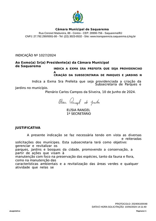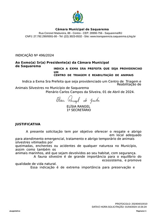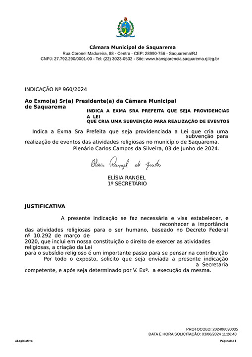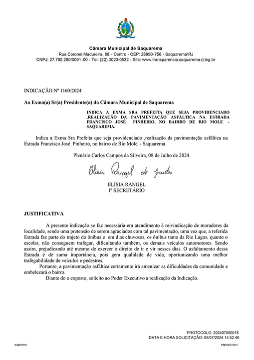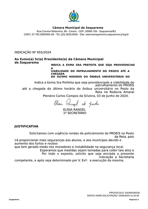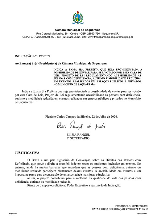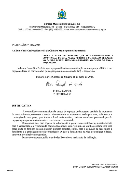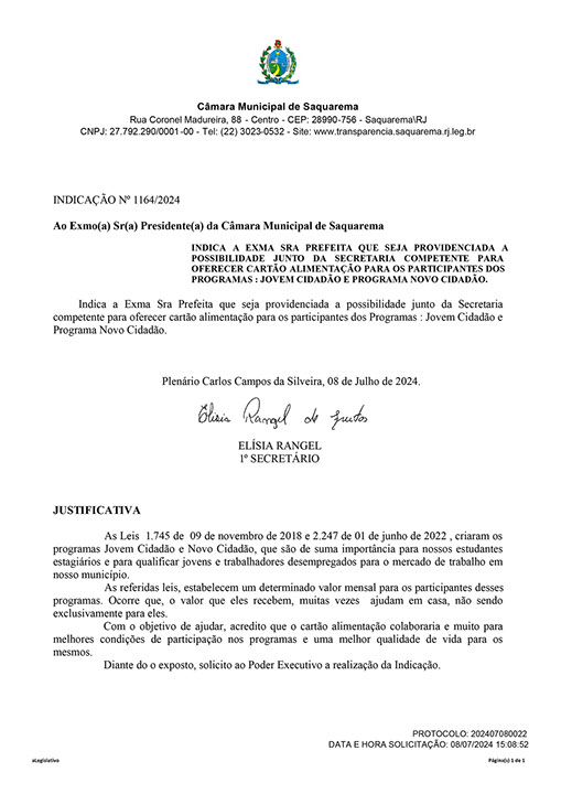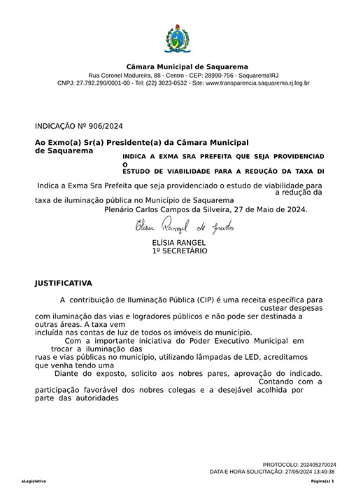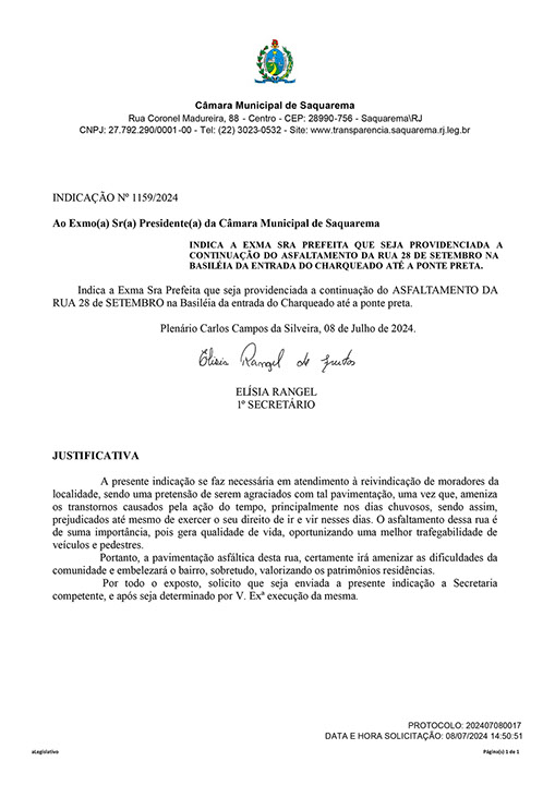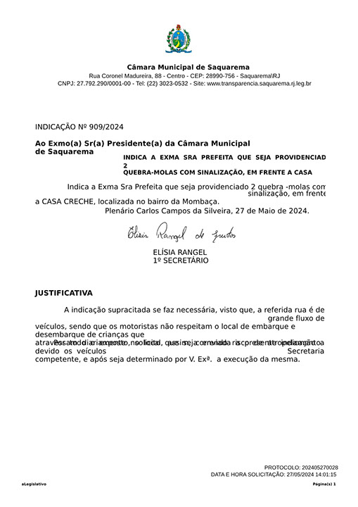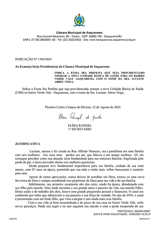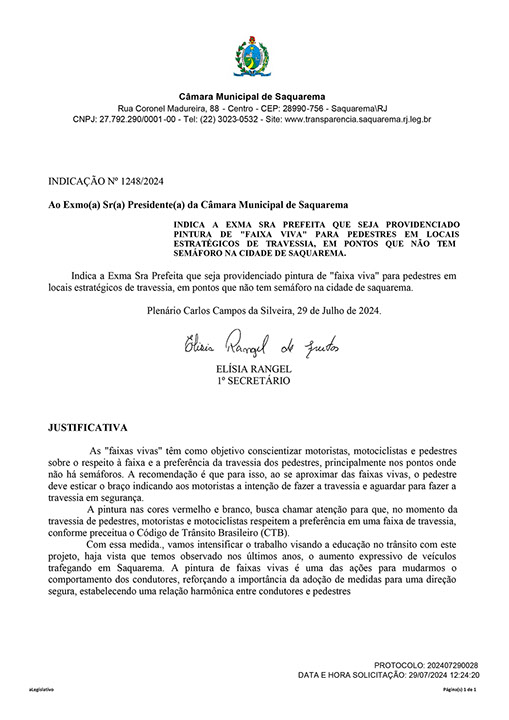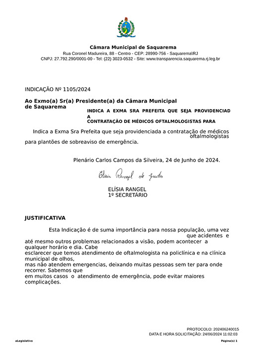 Estão presentes aqui indicações apresentadas por iniciativa de Elisia Rangel durante o seu mandato vigente como Vereadora do Município de Saquarema, na Região dos Lagos do estado do Rio de Janeiro.
