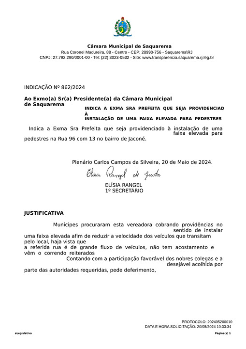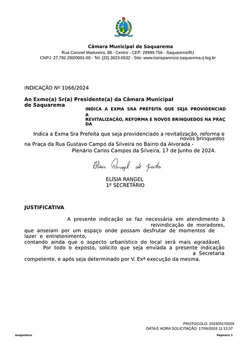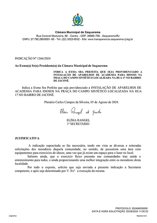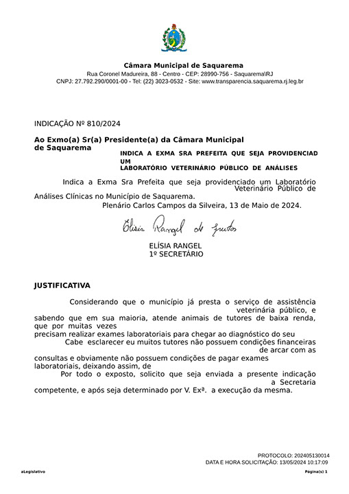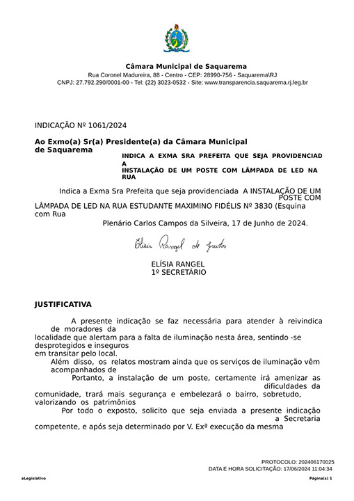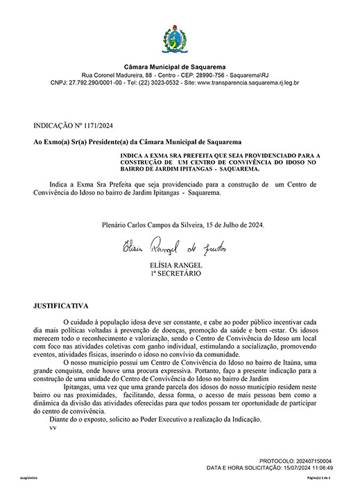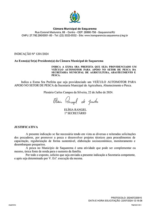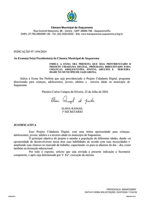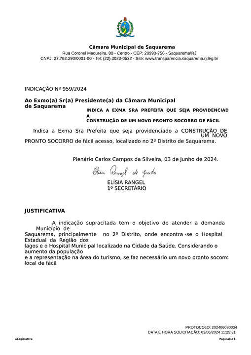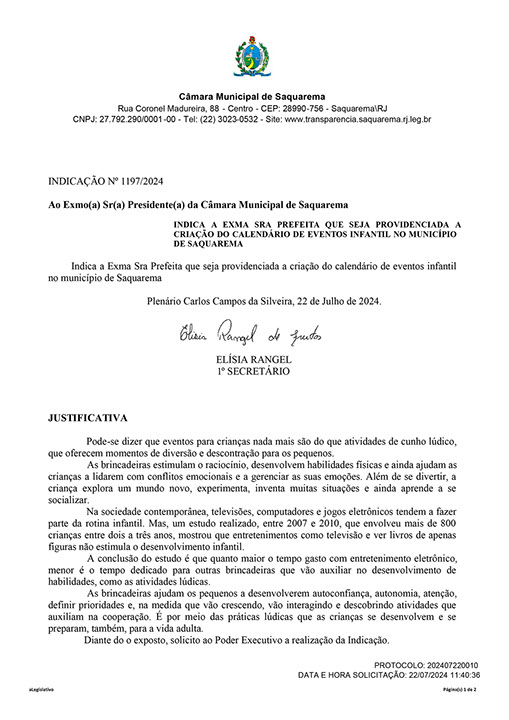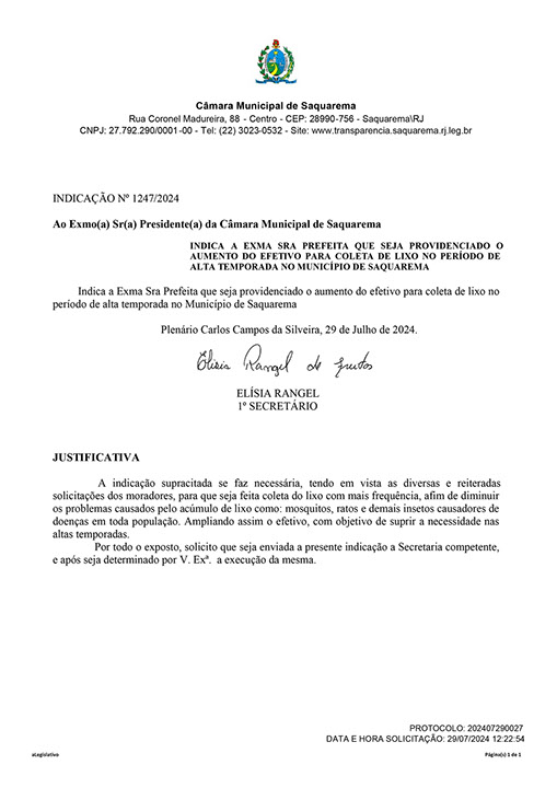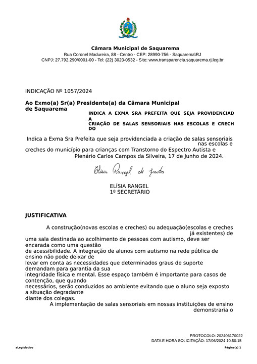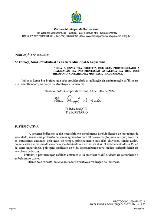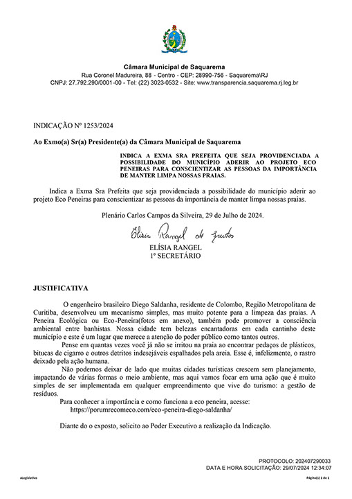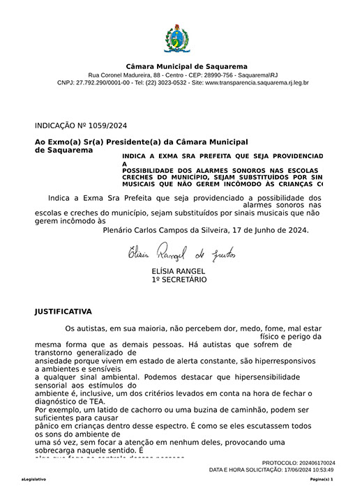 Estão presentes aqui indicações apresentadas por iniciativa de Elisia Rangel durante o seu mandato vigente como Vereadora do Município de Saquarema, na Região dos Lagos do estado do Rio de Janeiro.