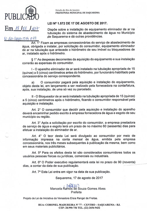 Dispõe sobre a instalação de equipamento eliminador de ar na tubulação do sistema de abastecimento de água no Município de Saquarema e dá outras providências.