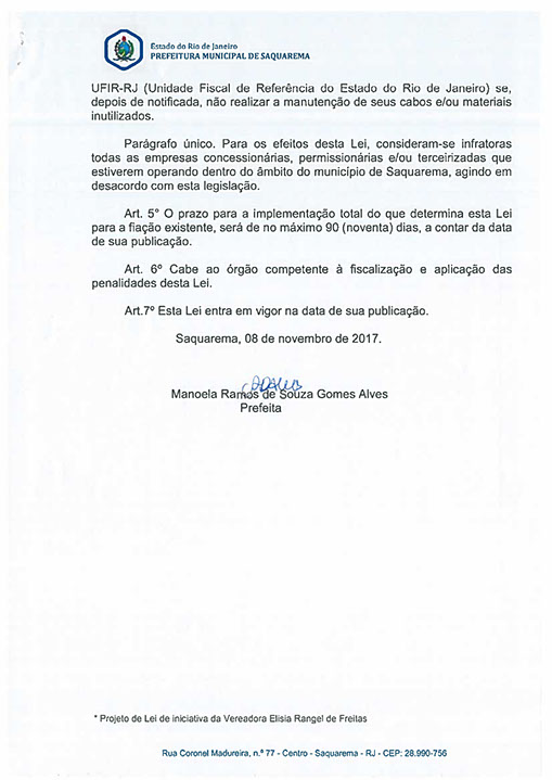 Dispõe sobre a obrigatoriedade da empresa concessionária ou permissionária de energia elétrica do Município de Saquarema realizar o alinhamento e retirada dos fios inutilizados nos postes, notificar as demais empresas que utilizam os postes como suporte de seus cabeamentos e dá outras providências.