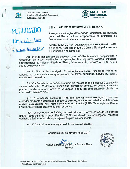 Assegura vacinação diferenciada, domiciliar, às pessoas com deficiência motora incapacitante no Município de Saquarema e dá outras providências.